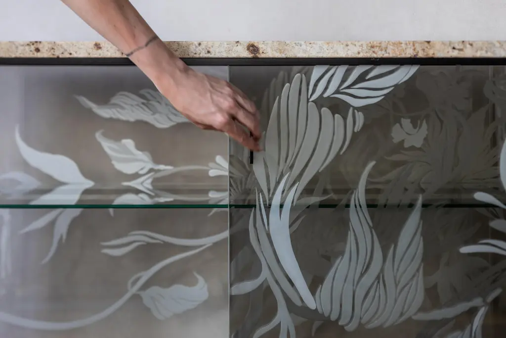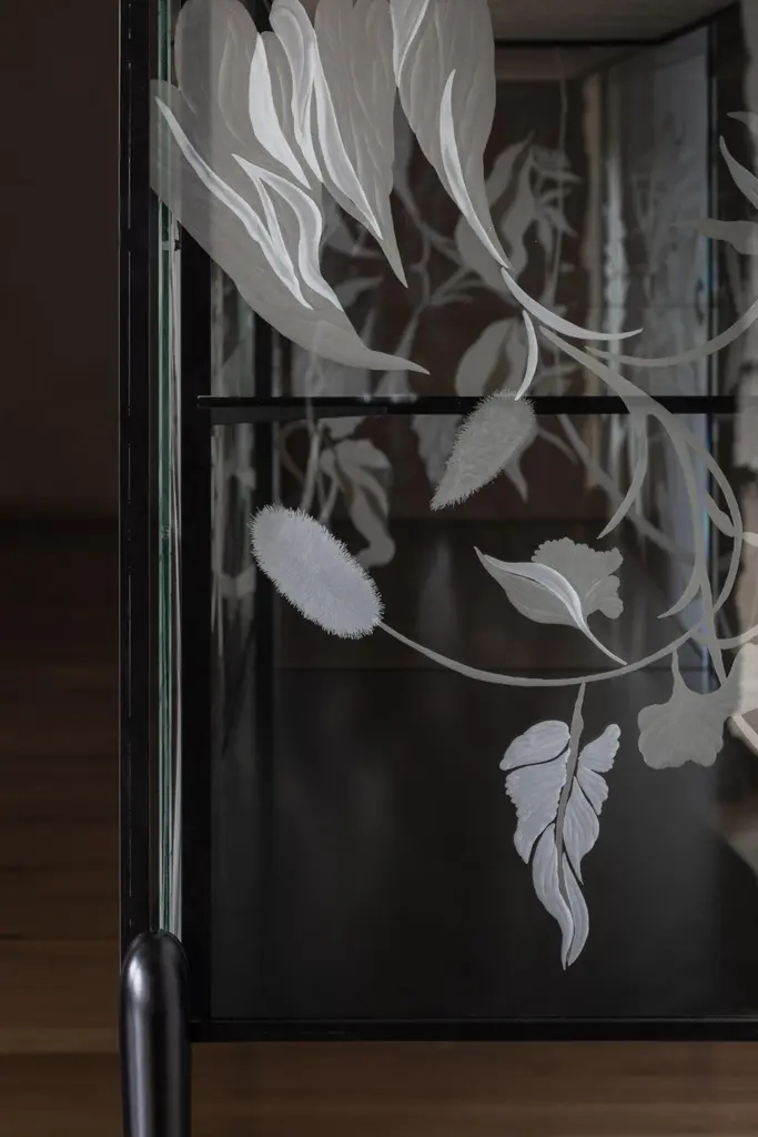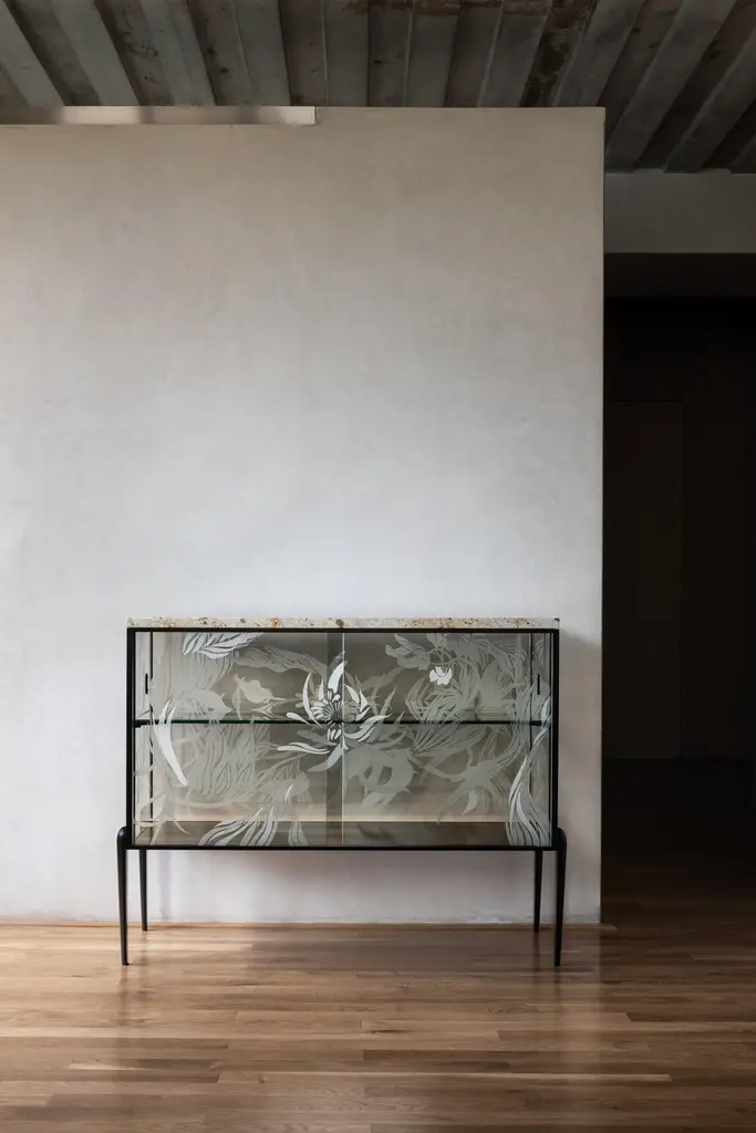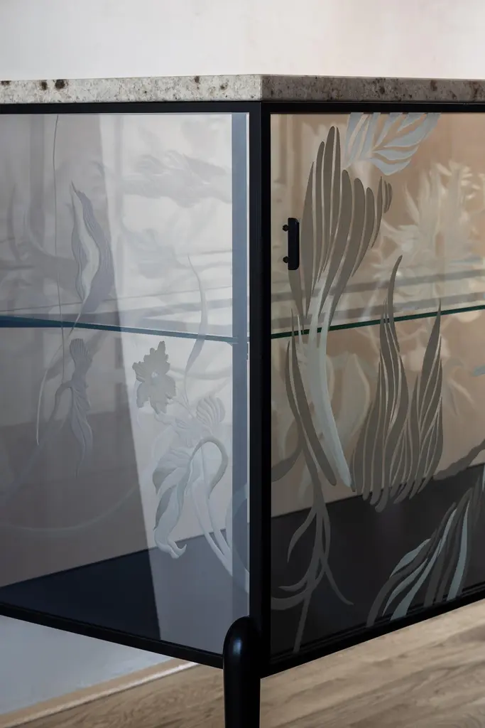 Engraved Cabinet by Elis MonsportLimited Edition Of 10 Pieces.Dimensions: D 42 x W 105 x H 85 cm.Materials: Engraved semi-permeable mirror plate, milled steel, milled marble slab, metal, and powder coating.Customization is available on request. Prices may vary. Please contact us.Eliška Monsportová - founder of the Elis Monsport brand is a multidisciplinary artist and designer who focuses on the complexity of glass engraving.She was born in 1996 and studied in the glass studio at UMPRUM under the guidance of Rony Plesl, her greatest inspiration was the selflessness and authenticity of nature, landscapes, rocks, and textures, which she blends into her works using various craft techniques.Elisa's work speaks to us through its stories, artistic craftsmanship, and the uniqueness of each object - she makes almost everything unique and unrepeatable pieces or series of small pieces. If you buy a vase from her, certainly, no one will ever have the same one again.She likes to travel, she doesn't sketch so much anymore, and she visualizes designs in her head on the road, preferably in the mountains.Mountains and travel are her inspirations. She differs from other glassmakers in the entire production process - she designs, creates forms, lays glass, and engraves glass herself.