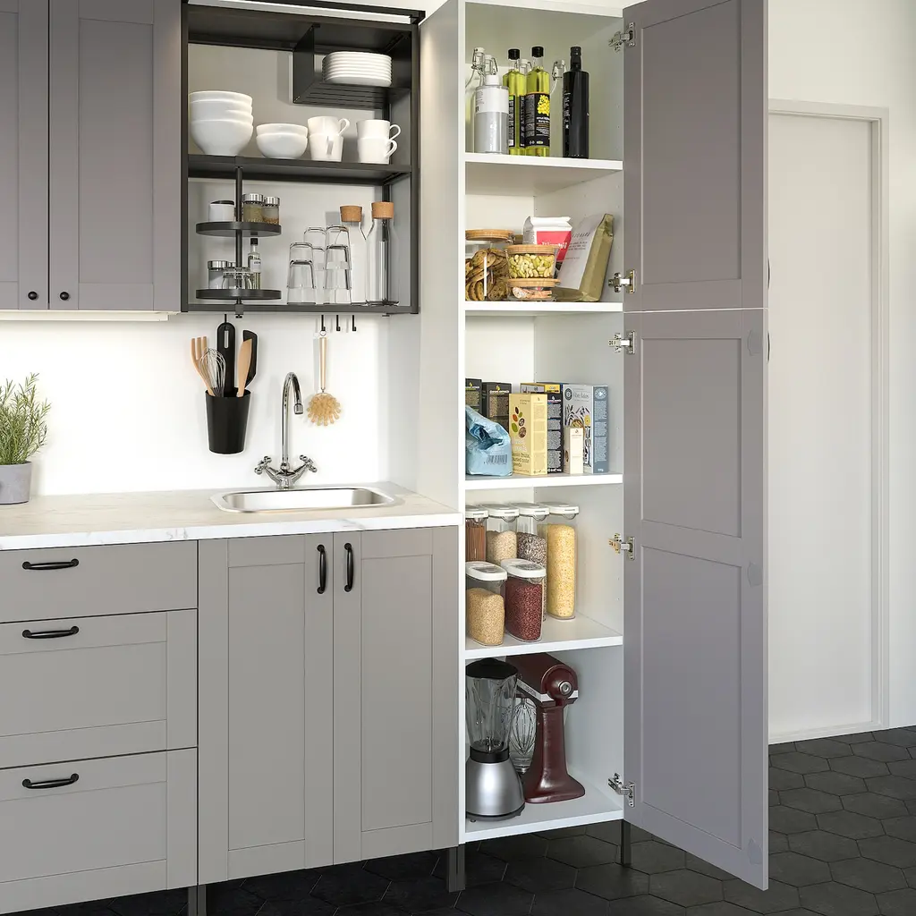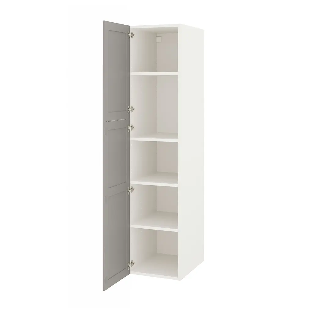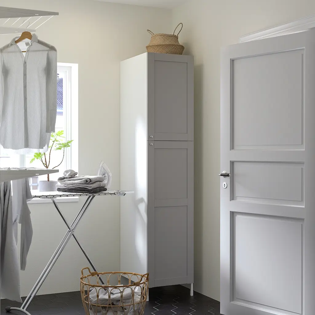 ENHET High cabinet with 2 doors - white/gray frame 18x24 3/4x80 ". A large cabinet that works perfectly as a kitchen pantry or as storage to help organize and reclaim the space in your laundry room. The unique wedge dowels make assembly easy and the fittings are nearly invisible.