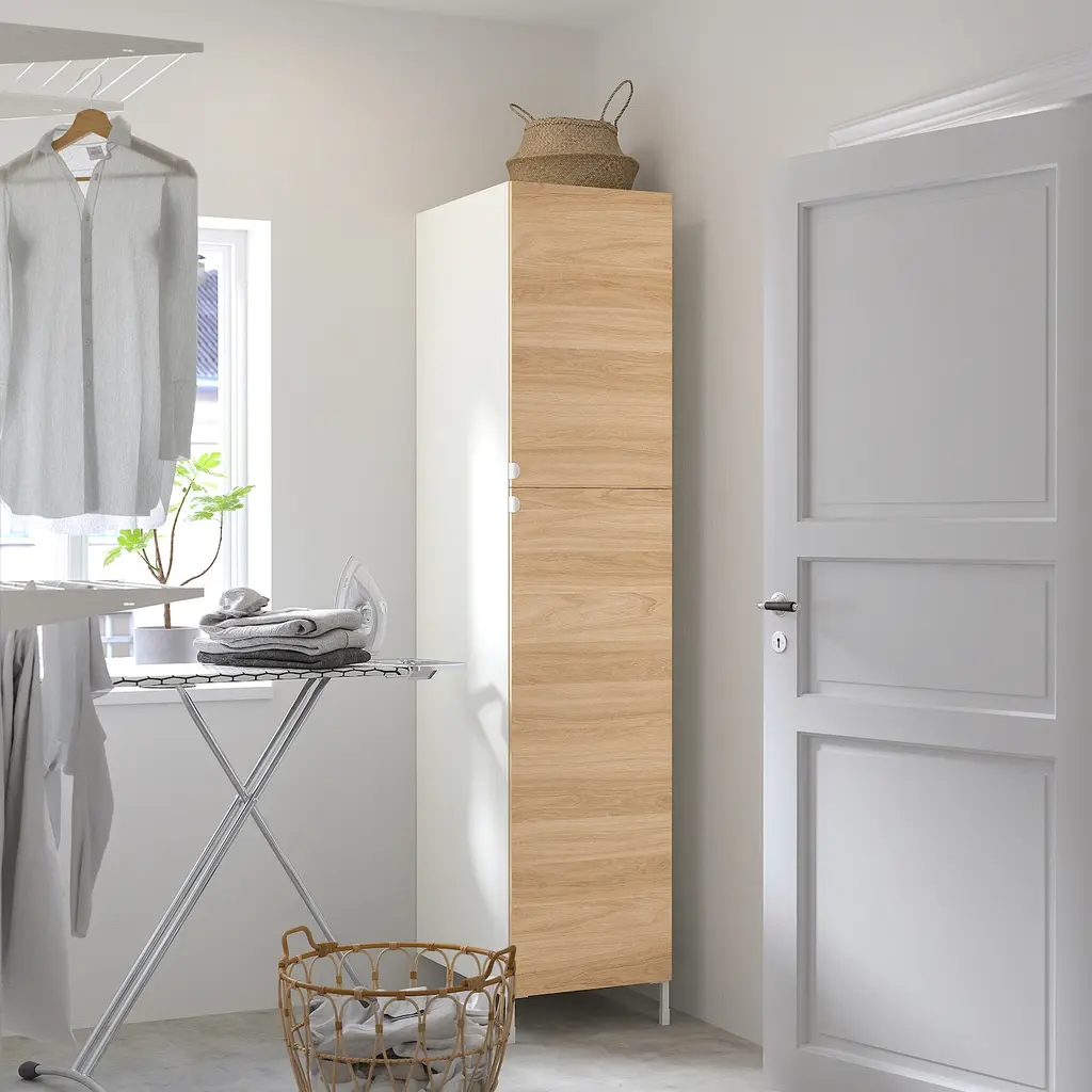 ENHET High cabinet with 2 doors - white/oak effect 18x24 3/4x80 ". A large cabinet that works perfectly as a kitchen pantry or as storage to help organize and reclaim the space in your laundry room. The unique wedge dowels make assembly easy and the fittings are nearly invisible.