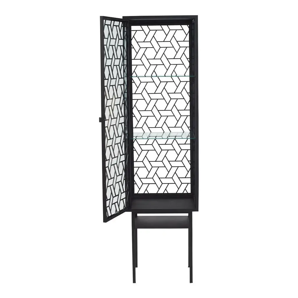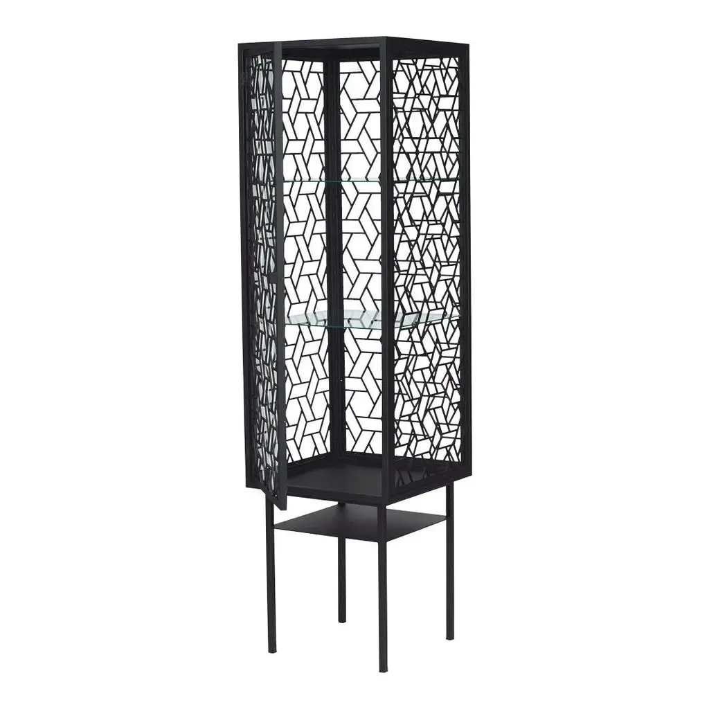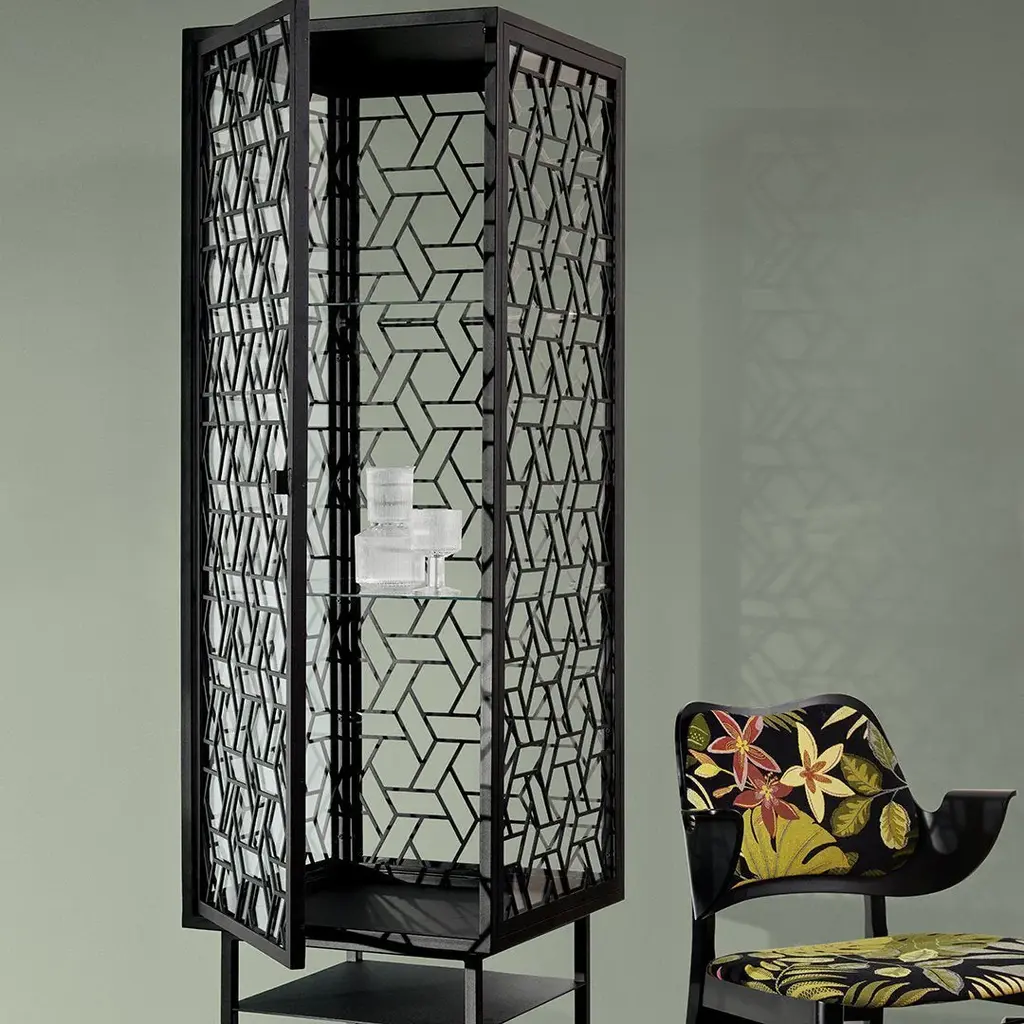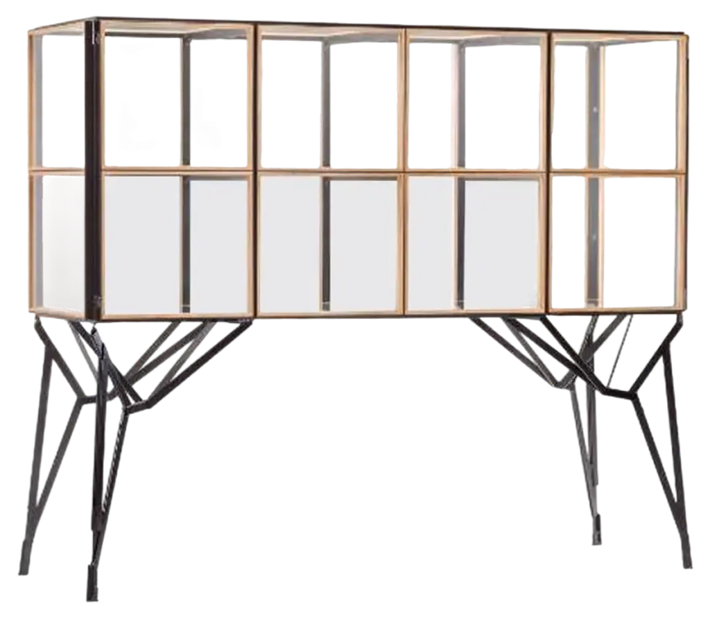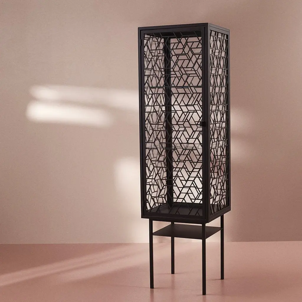 An elegant glass display cabinet with a timeless design and a beautiful combination of metal and glass. Enigma is perfect for displaying and highlighting your most cherished possessions behind a glass shield. While an elegant feature in any living room, it would also lend an extravagant touch to the bedroom. The talented Danish designer, Rikke Frost takes a fresh look at the glass display cabinet, transforming it from a utility item into an artistic experience. The overall design concept of Enigma is to present its contents in a fragmented way, investing the classic glass display cabinet with an enigmatic, artistic character and innovative relevance. The metal grid was inspired by traditional glazing techniques, in which lead soldering is used. Its playful use of shadows and transparency tickles our curiosity: you can only just make out the outlines of the items displayed behind the glass. The combination with powder painted metal lends the Enigma glass display cabinet a touch of modern elegance.