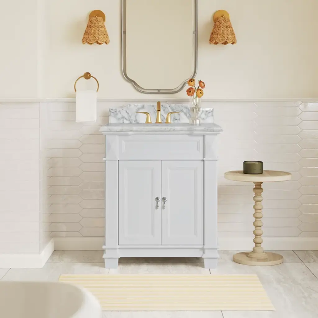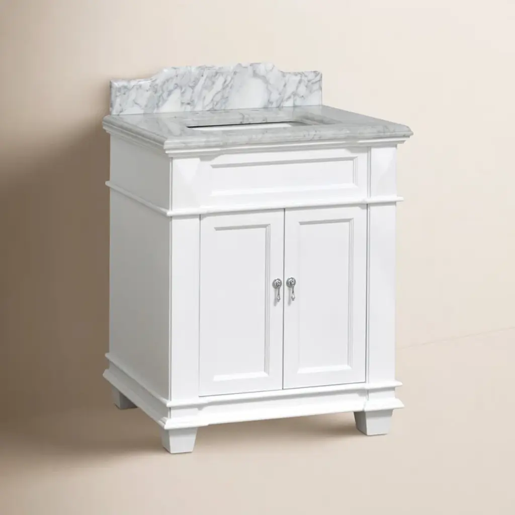 The single vanity is a must-have in any powder room or bathroom. It's crafted from solid and engineered wood with an included stone countertop and undermount sink. Thoughtful design details like clean molding, matching backsplash, and beveled countertops add to the traditional New England charm of this piece. Best of all, the frame and two cabinets are made with high-end furniture-grade construction that stands up to everyday use, plus they provide the storage you've been seeking.