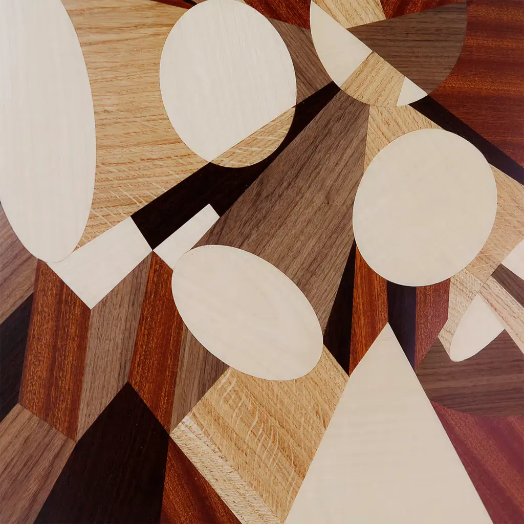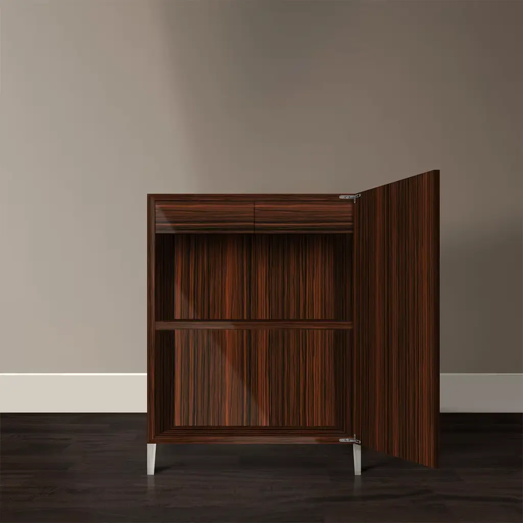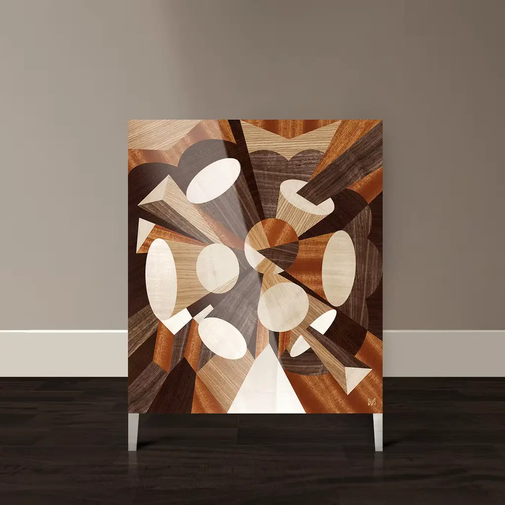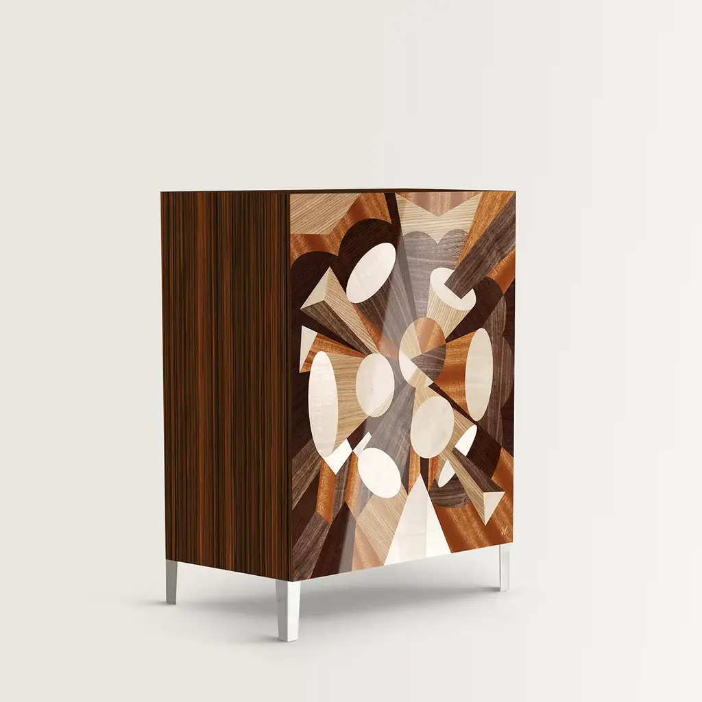 Part of the Classica Collection, this cabinet will stand out in any interior, providing sophisticated style in a living, dining room, and bedroom. The rectangular rosewood frame is raised on polished steel feet, its metallic finish occuring in the door's internal hinges. Using five different types of wood – maple, oak, mahogany, walnut and wenge - the door panel showcases an abstract composition that evokes the dazzling effect of light with masterfully executed inlays of cones in a three-dimensional effect is highlighted by the richness of the woods' colors and grains. Finish: Glossy Varnish.