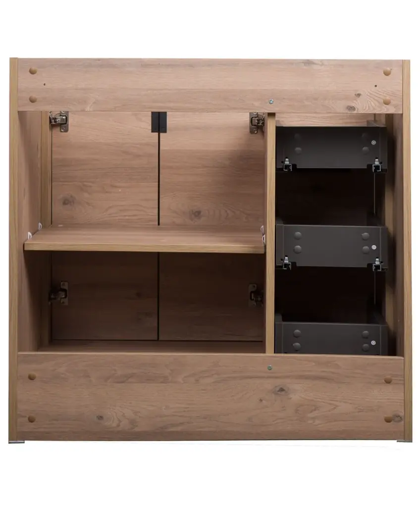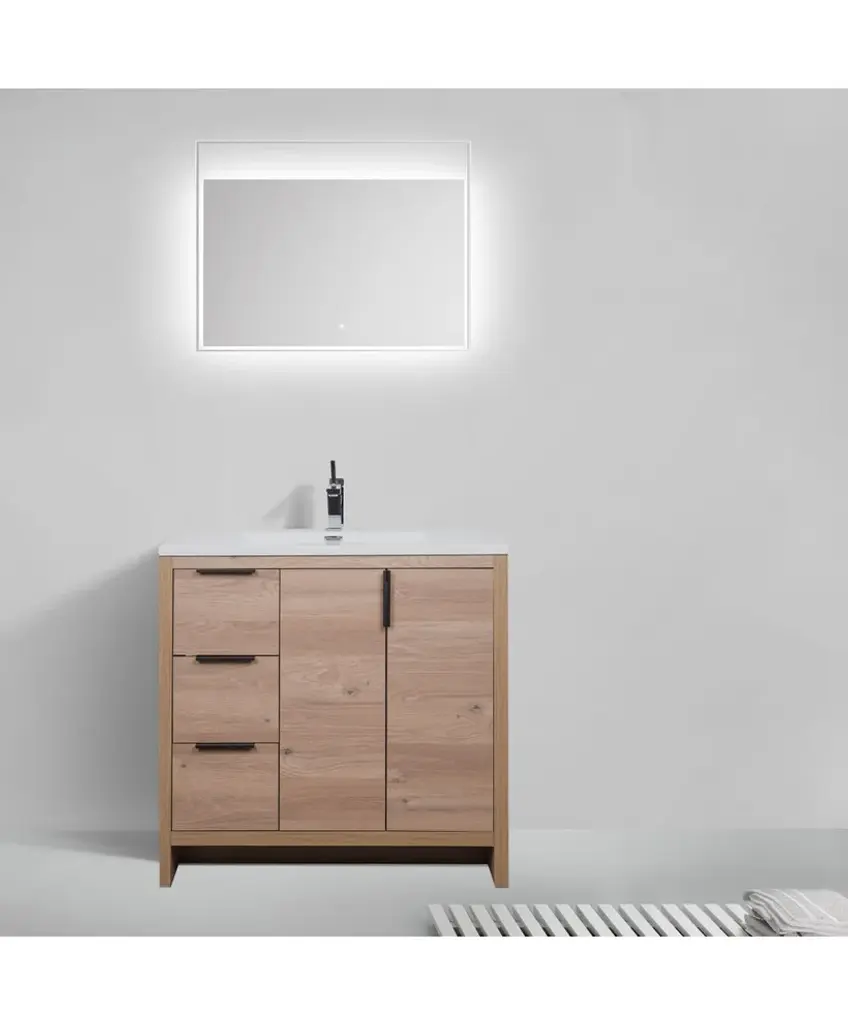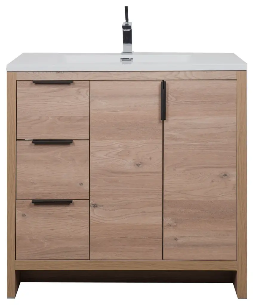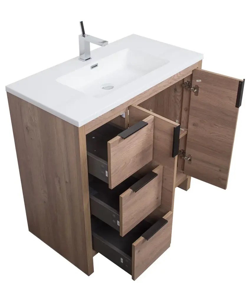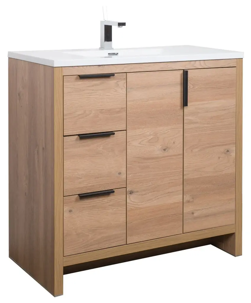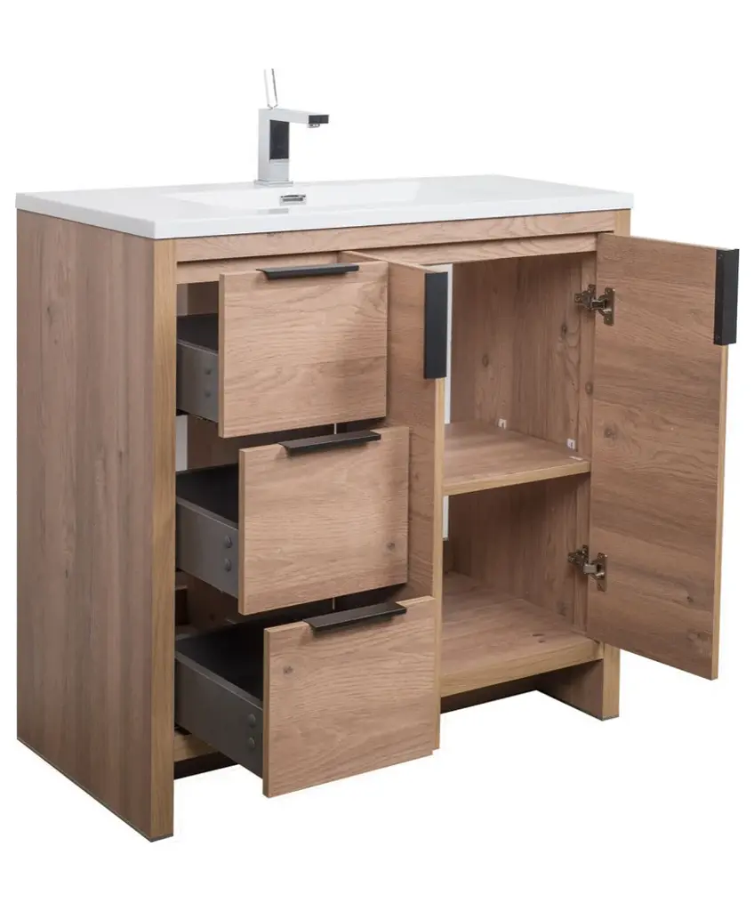 The 35.5" vanity is defined by its weathered red oak finish and clean white resin top with inergrated sink. This beautifully assembled vanity provides large storage area behind its two doors and three functional drawers. The shelf of the cabinet is removable and adjustable for easy plumbing. The integrated sink combines with ebony-finished wood and black hardware to complete this bathroom decor.FeaturesMaterials: Composite wood, white resin stone countertop with integrated sinkCabinet finish: Red oakNumber of drawers: Three full functioning drawers with soft-gliding slidesNumber of doors: Two soft-closing doorsHandle finish: Matte blackRemovable and adjustable shelf for easy plumbingDrilled for mono faucetsFaucet, pop up drain and mirror are not includedSpecifications:Dimensions of Vanity: 35.5 " L x 18.75" W x 35.5" H(with the sink)What's Included:Vanity and Sink