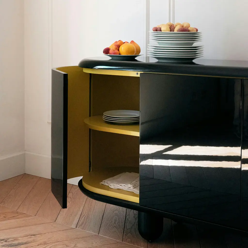The (small) Explorer Cabinet features a playful, fluid shape inspired by whimsical forms. Its glossy lacquered exterior, combined with a matte interior, creates a dynamic contrast, while the sturdy wooden legs elevate its presence. Crafted from durable MDF and solid alder, it offers both open and closed storage options. This compact piece is easy to move and adapt, perfect for adding a pop of color and creativity to any room. Its detachable design ensures it fits seamlessly into various environments.