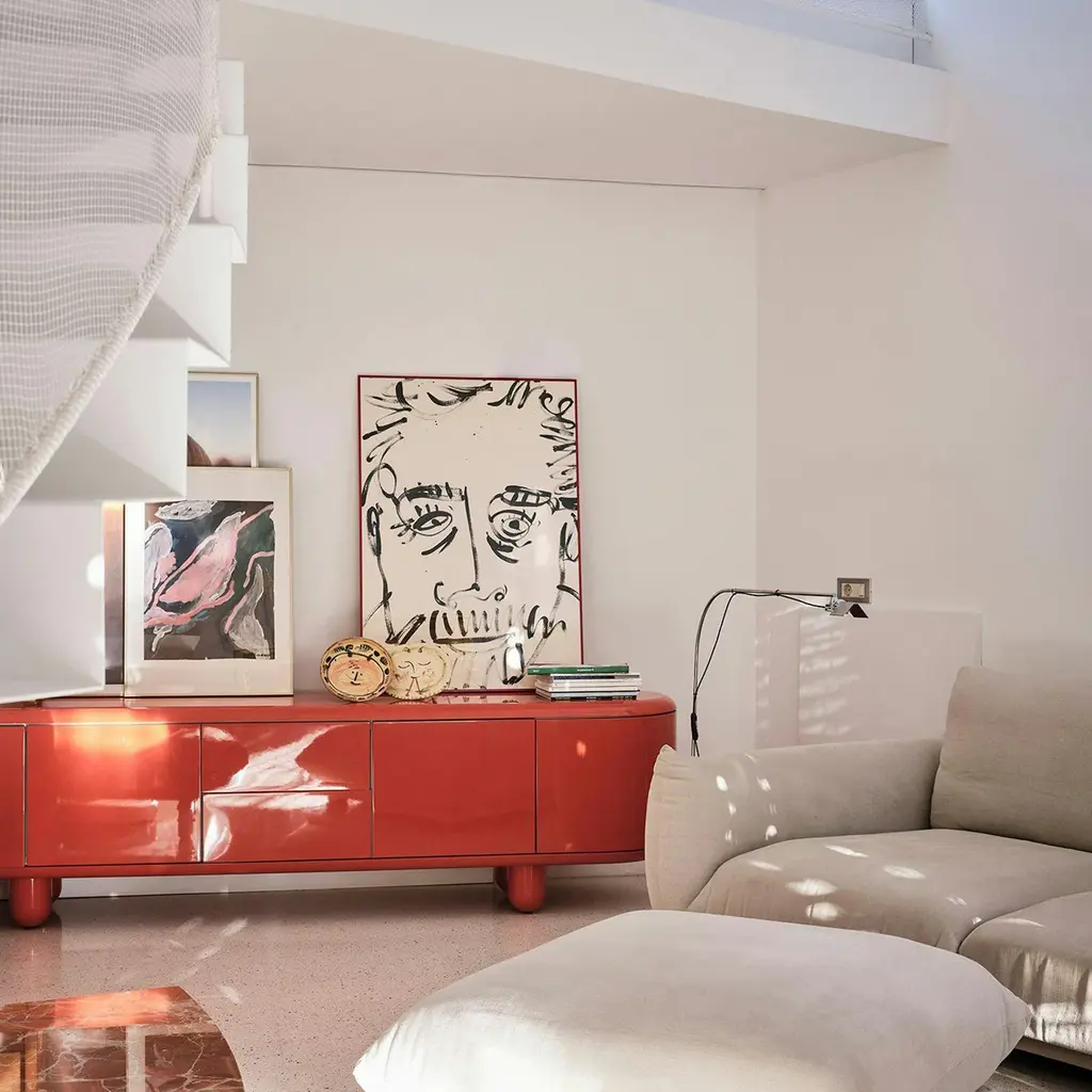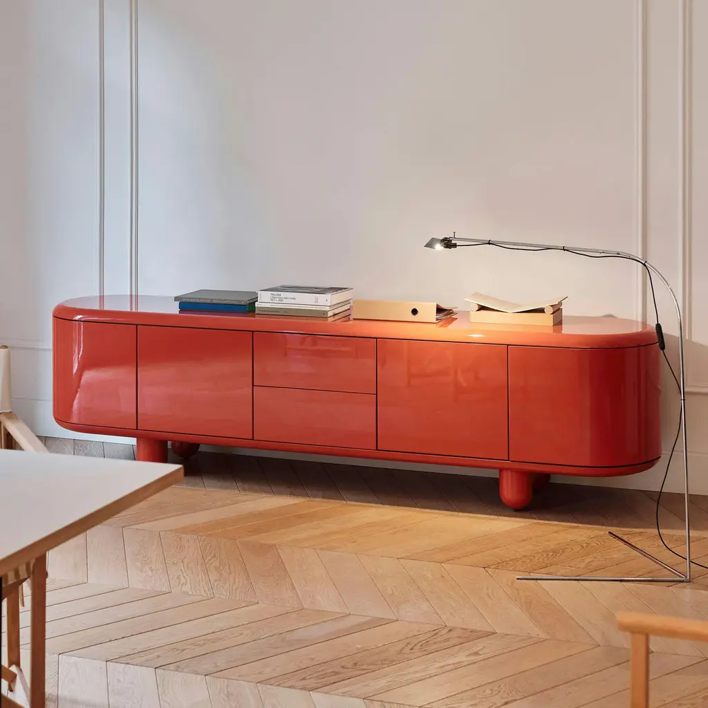 The (small) Explorer Cabinet features a playful, fluid shape inspired by whimsical forms. Its glossy lacquered exterior, combined with a matte interior, creates a dynamic contrast, while the sturdy wooden legs elevate its presence. Crafted from durable MDF and solid alder, it offers both open and closed storage options. This compact piece is easy to move and adapt, perfect for adding a pop of color and creativity to any room. Its detachable design ensures it fits seamlessly into various environments.