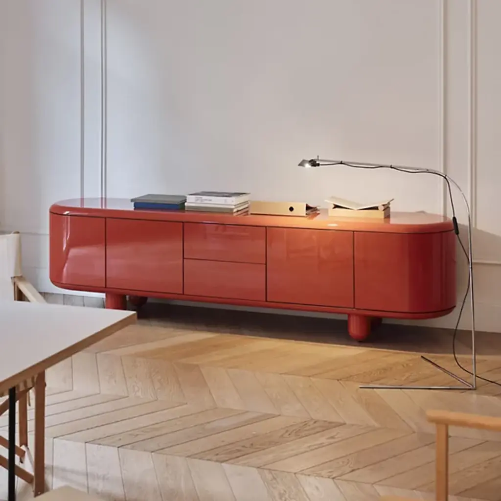 The (small) Explorer Cabinet features a playful, fluid shape inspired by whimsical forms. Its glossy lacquered exterior, combined with a matte interior, creates a dynamic contrast, while the sturdy wooden legs elevate its presence. Crafted from durable MDF and solid alder, it offers both open and closed storage options. This compact piece is easy to move and adapt, perfect for adding a pop of color and creativity to any room. Its detachable design ensures it fits seamlessly into various environments.