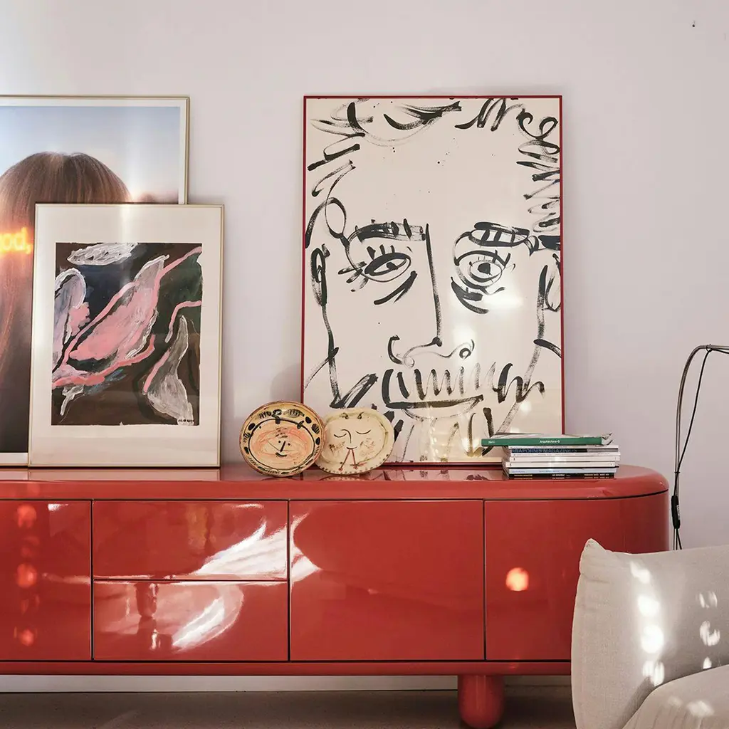 The (small) Explorer Cabinet features a playful, fluid shape inspired by whimsical forms. Its glossy lacquered exterior, combined with a matte interior, creates a dynamic contrast, while the sturdy wooden legs elevate its presence. Crafted from durable MDF and solid alder, it offers both open and closed storage options. This compact piece is easy to move and adapt, perfect for adding a pop of color and creativity to any room. Its detachable design ensures it fits seamlessly into various environments.