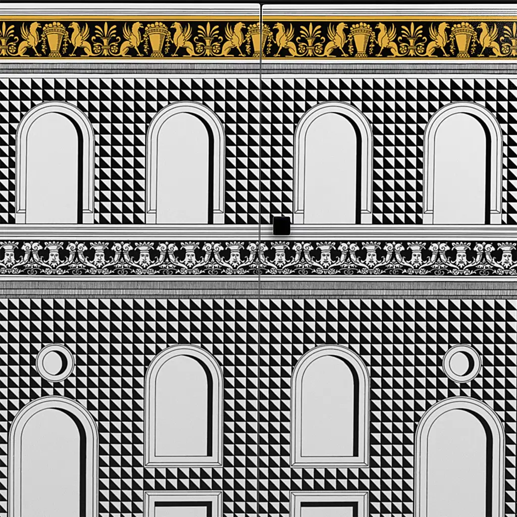 The Fornasetti cabinet is a wooden storage piece of furniture silkscreened and lacquered by hand following the Atelier's traditional method. The motif evokes the Italian Renaissance according to that metaphorical journey through time undertaken by Fornasetti with its Contemporary Antiquity collection for the Milan Design Week 2021. Each Fornasetti wooden piece of furniture is silkscreened and lacquered by hand and any minor discrepancies between similar creations are the result of craftsmanship.