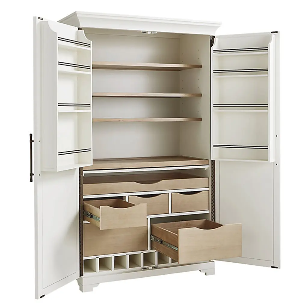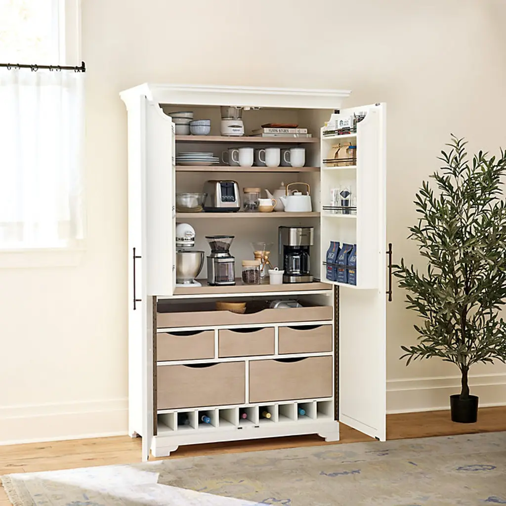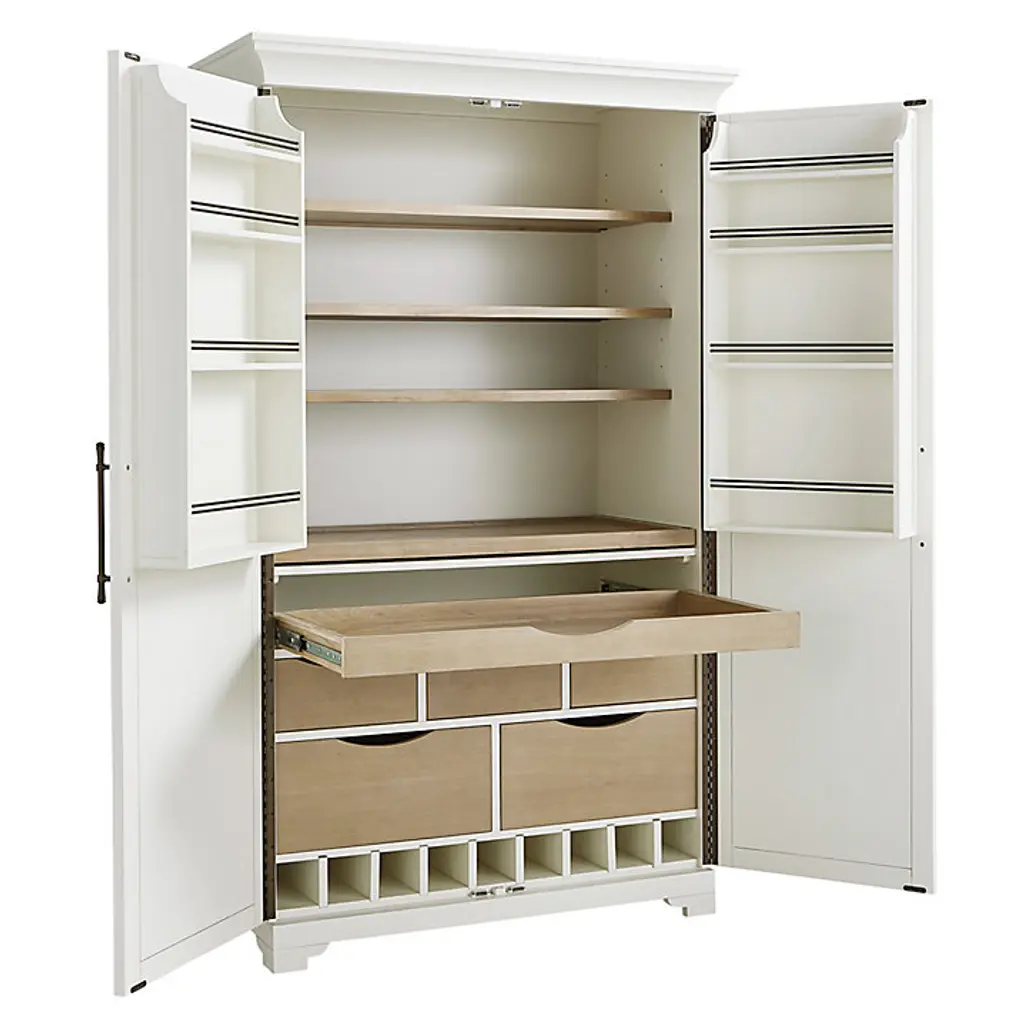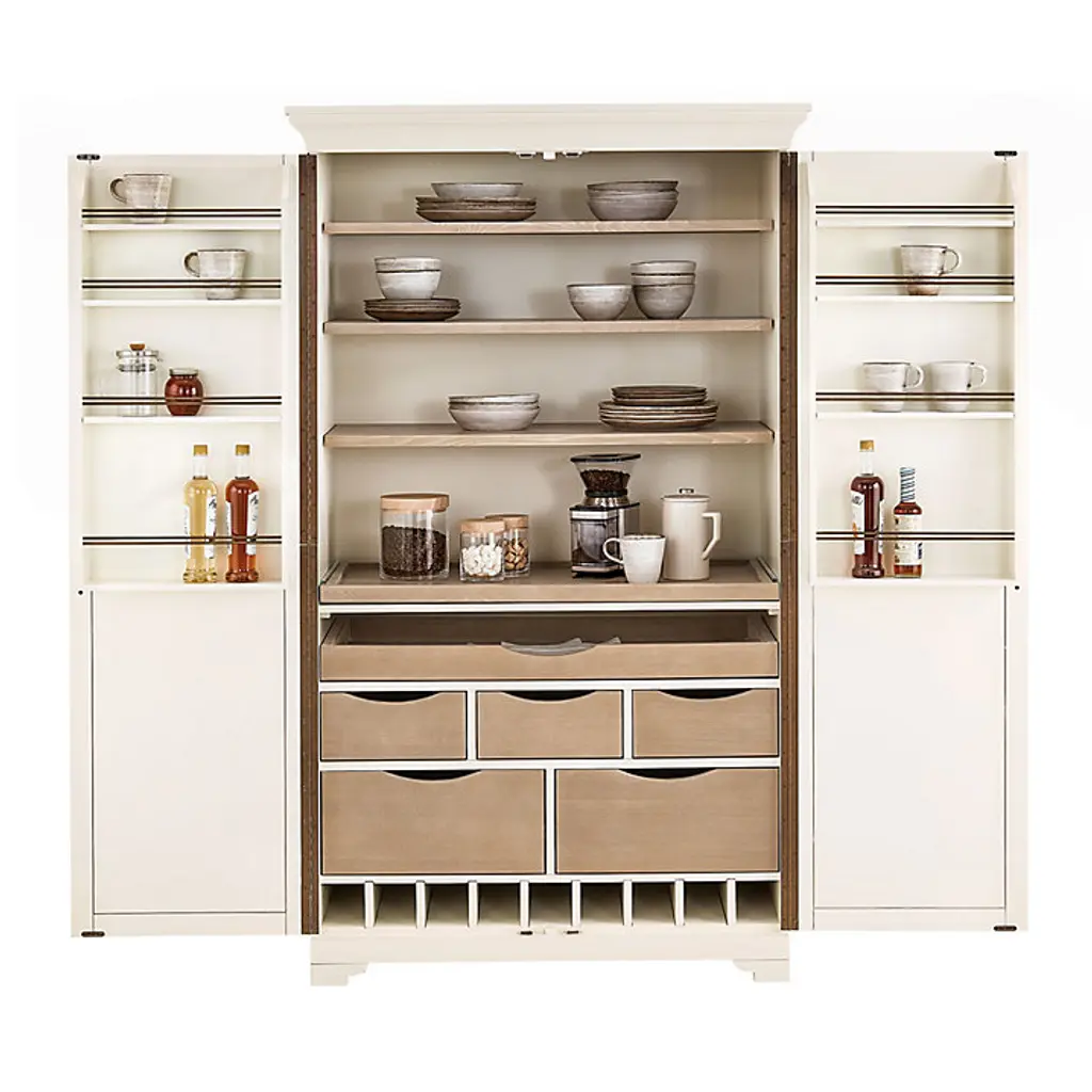 Our Fairmont Kitchen Pantry is a home chef's dream wrapped in fresh white shiplap. Cabinet doors open a full 180° on hidden piano hinges. Inside, six storage drawers and a large tray pull out on full-extension metal glides. Three adjustable upper shelves and storage galleries on each door keep cooking essentials at eye level and easy to reach. Bottom space has dividers for nine wine bottles that you can remove to make room for cookie sheets and cutting boards. Cable management throughout lets this multi-talented pantry double as an appliance center. Fairmont Kitchen Pantry features:
