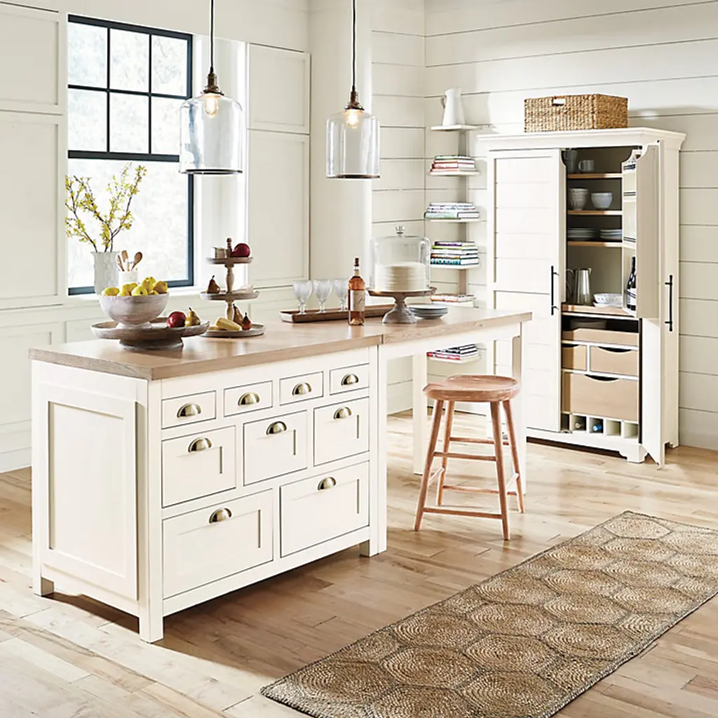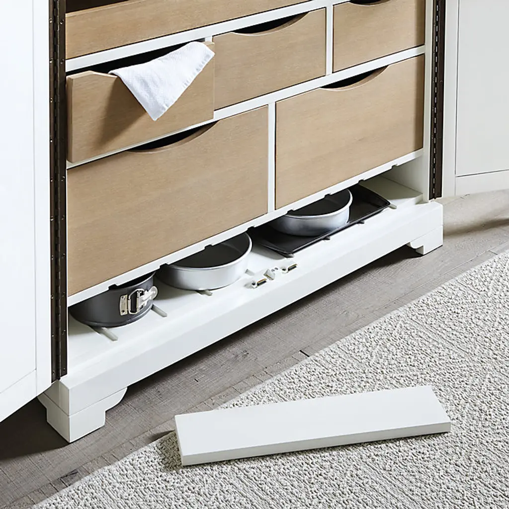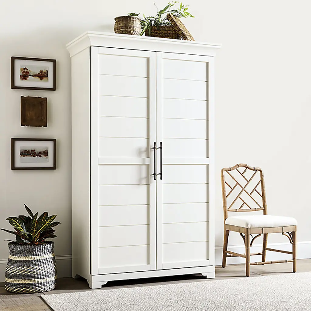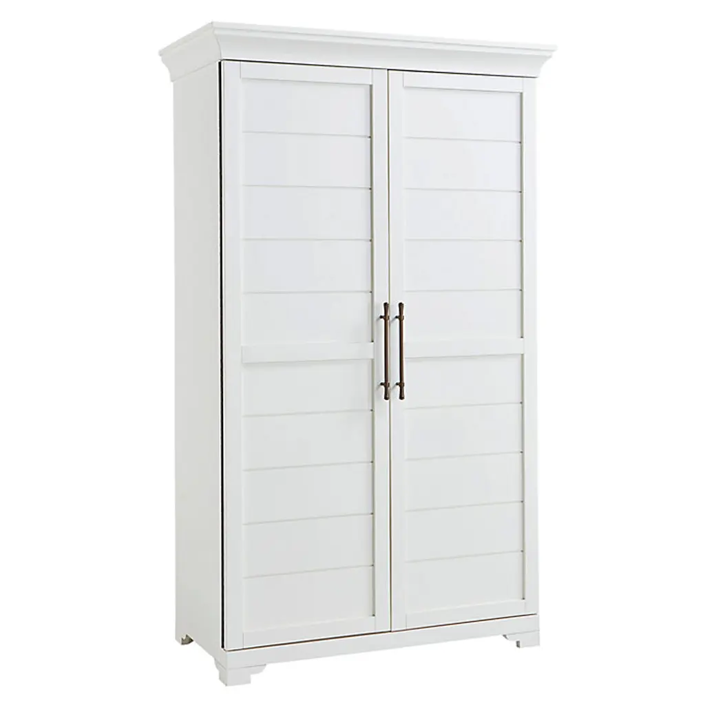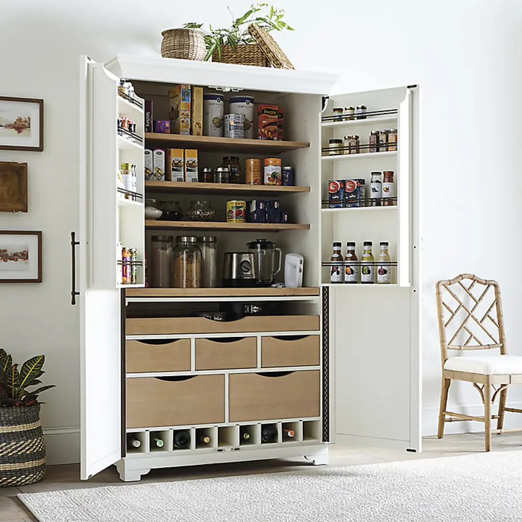 Our Fairmont Kitchen Pantry is a home chef's dream wrapped in fresh white shiplap. Cabinet doors open a full 180° on hidden piano hinges. Inside, six storage drawers and a large tray pull out on full-extension metal glides. Three adjustable upper shelves and storage galleries on each door keep cooking essentials at eye level and easy to reach. Bottom space has dividers for nine wine bottles that you can remove to make room for cookie sheets and cutting boards. Cable management throughout lets this multi-talented pantry double as an appliance center. Fairmont Kitchen Pantry features: