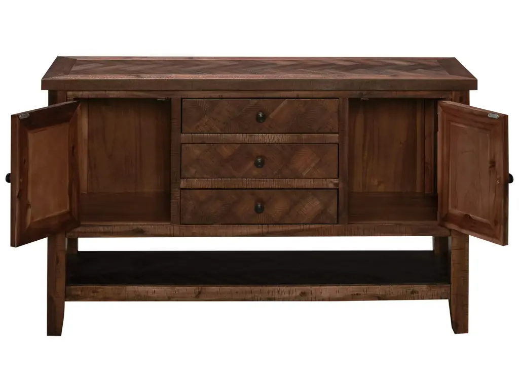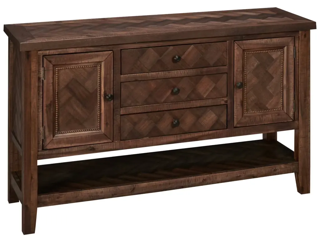 Boasting classic charm, the Jofran Fairview Server organizes your dining room with style. Store your silverware, placemats and more in the three spacious drawers of this piece. The two cabinets with paneled doors provide ample space for your dishware and other dining items. Display items on the bottom shelf or use it for more storage. The subtle herringbone design and the antique silver knobs enhance the versatility of this server. Available in other finishes.