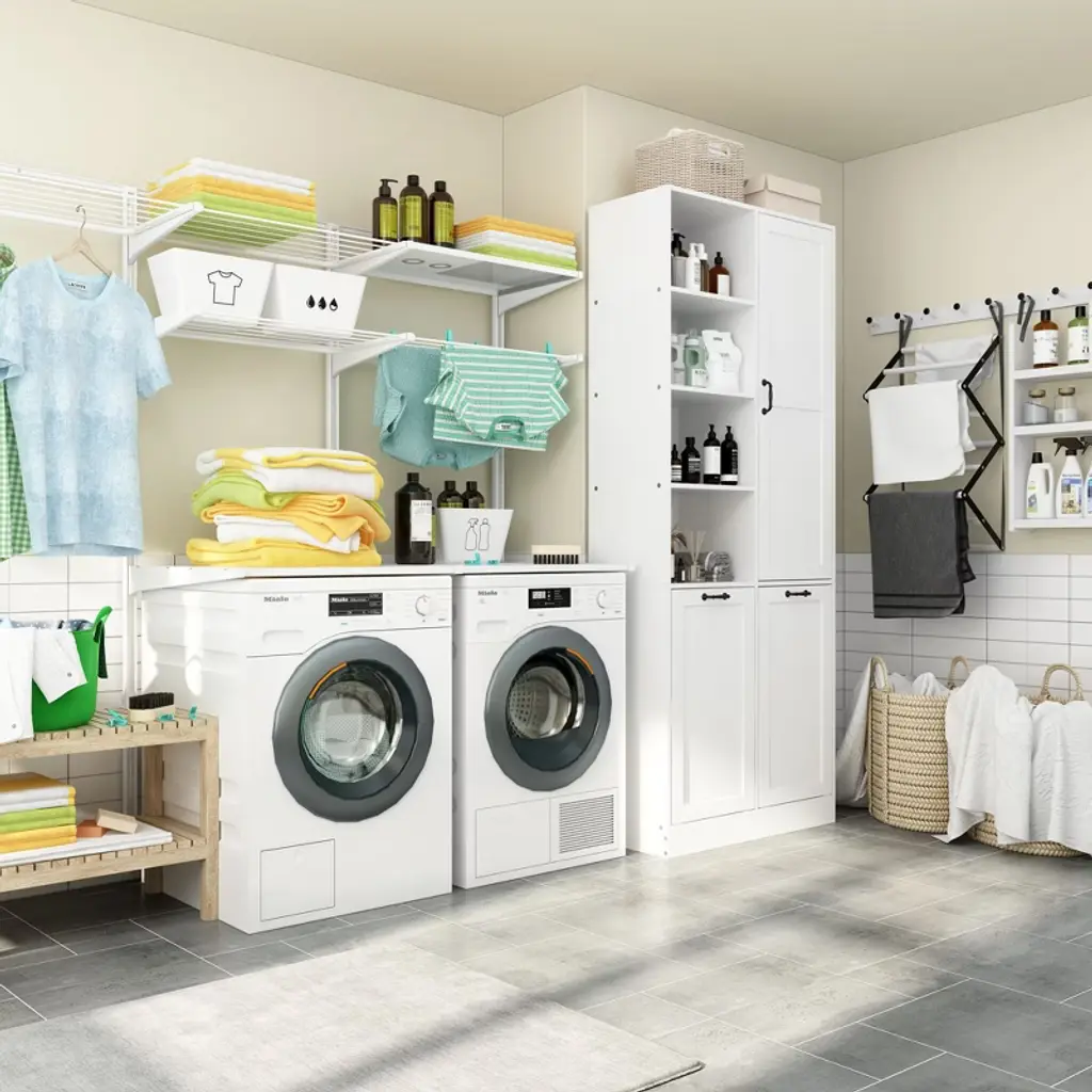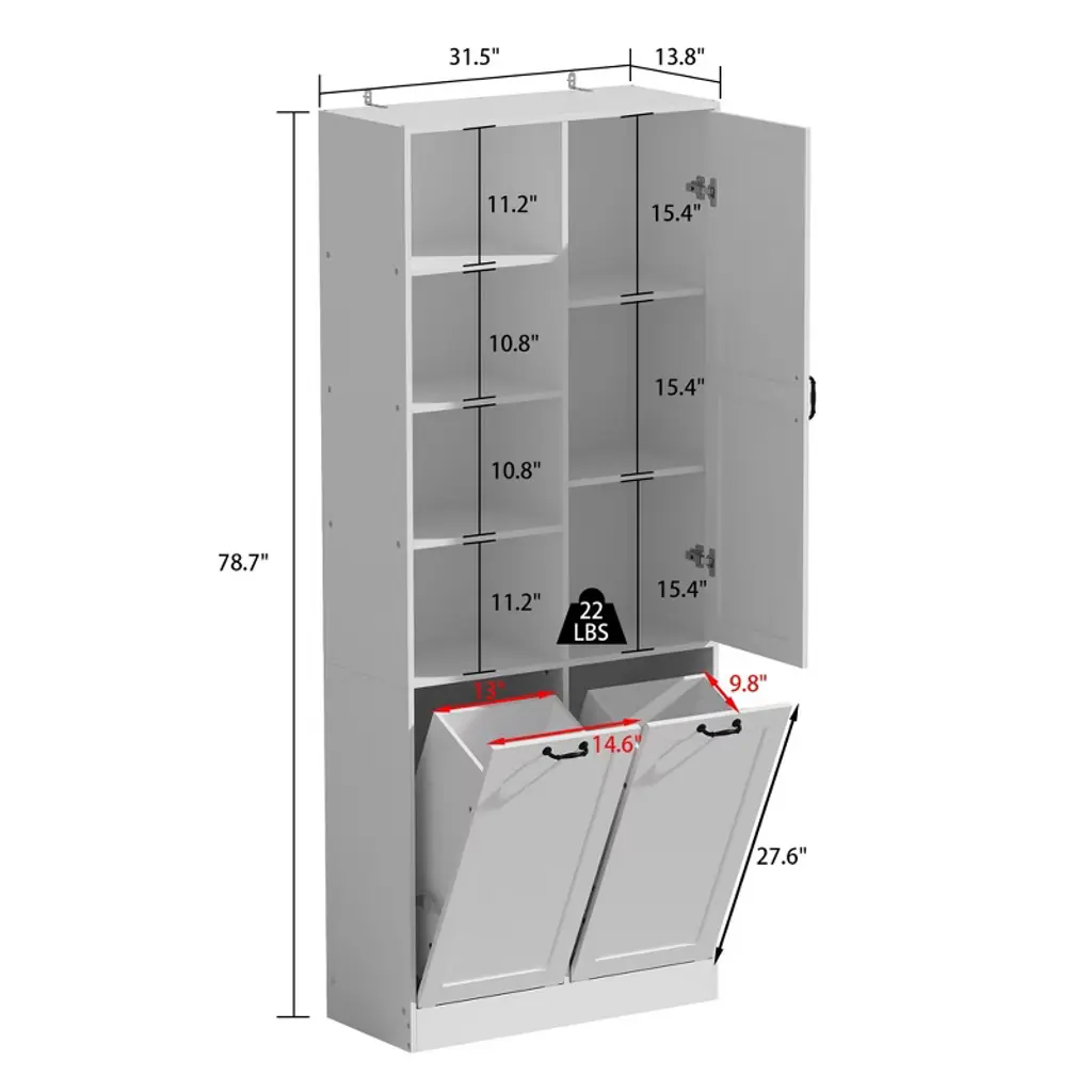 This bathroom storage cabinet is a practical and stylish solution for keeping your bathroom or laundry area organized. Tall and Space - Saving: Standing at 78.7 inches tall with a width of 31.5 inches and depth of 13.8 inches, it maximizes vertical space without taking up too much floor area. The cabinet is divided into multiple compartments, offering versatile storage options. Compartment Configuration: The upper section features open shelves , providing easy access to frequently - used items like toiletries or cleaning supplies. The closed cabinet on the right side has three shelves, each 15.4 inches high, ideal for storing items you want to keep out of sight. The lower section has two drop - down doors with dimensions of 14.6 inches by 9.8 inches, which can be used for larger items or as a laundry hamper. Weight Capacity: Each shelf has a weight capacity of 22 lbs, ensuring it can hold a reasonable amount of items without strain. Sturdy Build: Made from durable engineered wood, the cabinet is built to last. The white/black finish is not only aesthetically pleasing but also easy to clean, which is essential in a bathroom or laundry environment. Quality Hardware: The black handles and hinges add a touch of elegance and ensure smooth operation of the doors. Modern and Minimalist: With its clean lines and white/black color, the cabinet has a modern and minimalist look that can complement various bathroom decor styles, from contemporary to traditional. Versatile Placement: It can be placed in the bathroom to store toiletries, in the laundry room for detergents and linens, even in a hallway for general storage or as a kitchen cabinet in the kitchen.