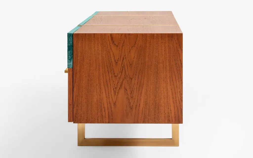 FAMED TV UNIT is a stylish piece of furniture that combines natural elements like oak veneer, rainforest marble, and aged brass to create a visually appealing and elegant design. The oak veneer provides a warm and natural feel, while the rainforest marble adds a touch of luxury and sophistication. The aged brass accents complement the other materials and add a vintage charm to the overall design.Overall, the FAMED TV UNIT seems like a great choice for anyone looking to add some style and sophistication to their television setup. Its combination of natural elements and elegant design make it a standout piece of furniture that will enhance any room. If you're interested in different sizes and materials, you could consider requesting a customized size that fits your specific needs. This would allow you to have a TV unit that perfectly fits the space you have available. Alternatively, you could look for pre-made units that come in a variety of sizes.Solid wood and veneer use and careClean surfaces with a slightly damp cloth.Check with your sales consultant about your product’s humidity and ultraviolet light information.Materials have a natural identity; time, ultraviolet light, original character all contribute to the individuality of the piece.Do not use chemical products directly on your Lagu product. Some ingredients may cause damage to surfaces.Avoid contact with hot and sharp objects to product surfaces.