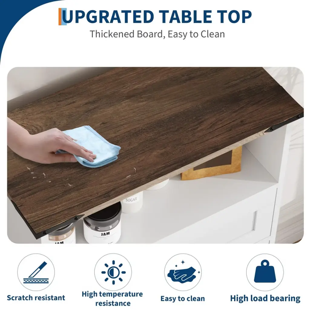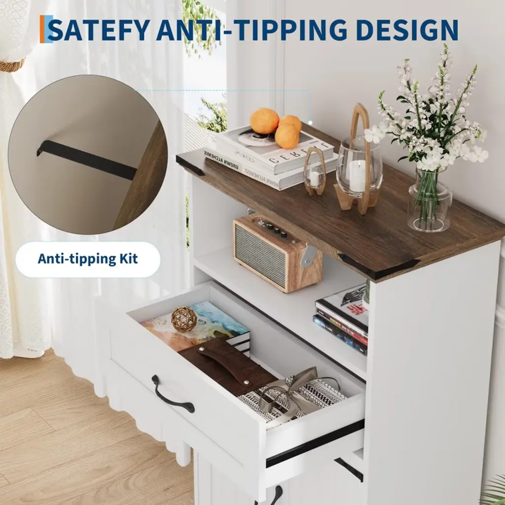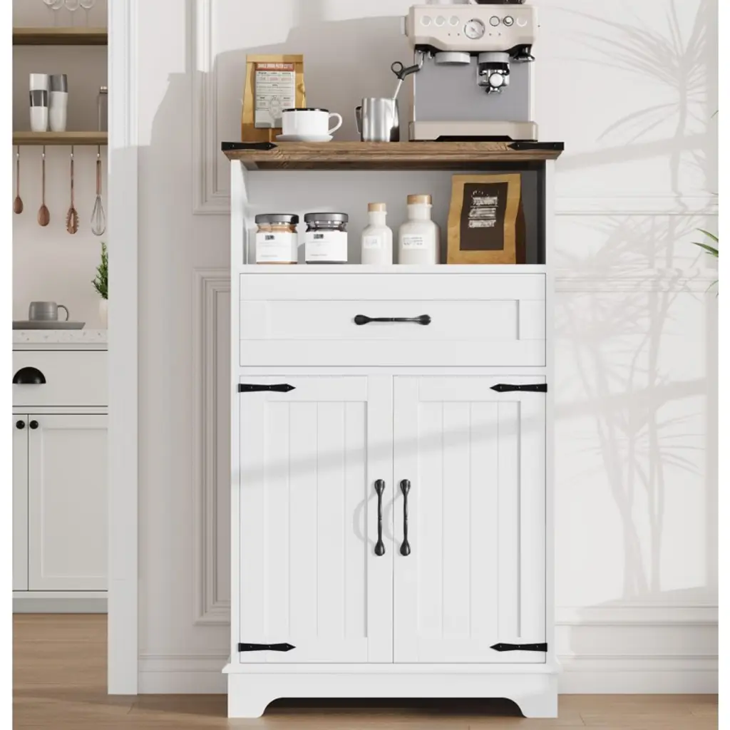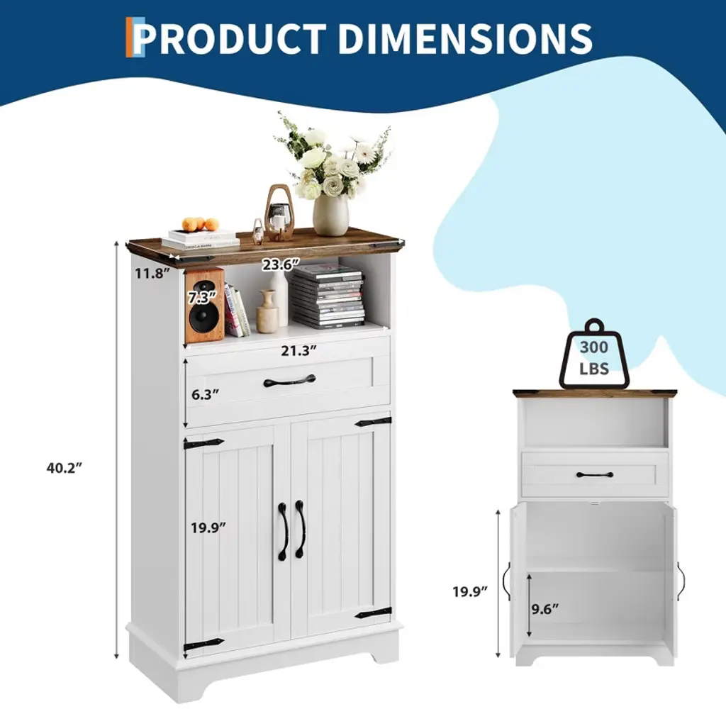 Farmhouse Storage Cabinet, Freestanding Bathroom Organizer with Drawer and DoorsProduct Description:Add timeless farmhouse charm and practical organization to any room with this elegant Freestanding Storage Cabinet. Featuring a crisp white finish with vintage black handles and a wood-grain top, this versatile piece combines rustic elegance with modern functionality. The multi-functional design includes a double-door cabinet, smooth-gliding drawer, and convenient open shelf¡ªperfect for storing everything from bathroom essentials to kitchen supplies. With its sturdy construction and compact footprint, this cabinet serves as a beautiful and practical storage solution for bathrooms, kitchens, entryways, and living areas.?Key Features:1. Classic Farmhouse DesignEnhance your home's aesthetic with authentic farmhouse styling featuring paneled doors, vintage black handles, and a realistic wood-grain top. The crisp white finish and elegant proportions create a timeless look that complements country, cottage, and modern farmhouse decor in any room.2. Versatile Three-Tier StorageMaximize organization with a practical storage system that includes a spacious double-door compartment for bulk items, a smooth-operating drawer for smaller essentials, and an easily accessible open shelf for frequently used objects. This intelligent layout helps categorize and conceal clutter while keeping daily necessities within reach.3. Reinforced Durable ConstructionBuilt from premium MDF with a substantial 30mm thick top, this cabinet ensures long-lasting durability for daily use. The reinforced structure and stable freestanding design provide reliable performance in busy households, maintaining its beauty and functionality through years of service.4. Whole-Home VersatilityTransition seamlessly between rooms with this adaptable storage solution. Use it as a bathroom vanity, kitchen pantry organizer, entryway drop zone, living room accent piece, or even as a stylish coffee bar station. The compact design fits perfectly in various spaces while providing substantial storage capacity.5. Quick Straightforward AssemblyEnjoy stress-free setup with clearly labeled components, step-by-step instructions, and all necessary hardware included. The intuitive assembly process allows most users to complete setup quickly, letting you start organizing and decorating with your new cabinet almost immediately.Specifications:? Material: Engineered Wood (MDF)? Color: White with Wood-Grain Top? Dimensions: 11.8" D x 23.6" W x 40.2" H? Style: Farmhouse/Rustic? Storage Components: Double Doors, 1 Drawer, Open Shelf? Top Thickness: 30mm (1.2")? Mounting Type: Freestanding Floor Mount? Special Feature: Anti-Tipping Design? Assembly: Required (All Hardware Included)