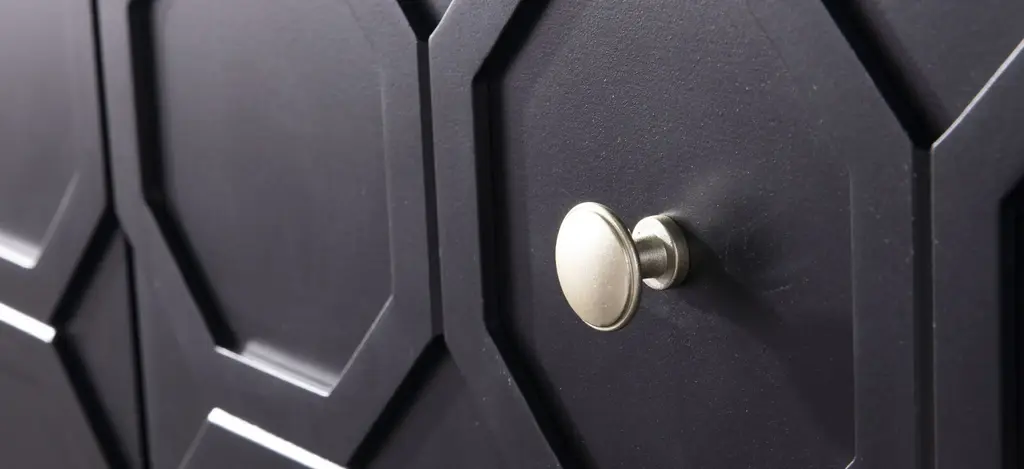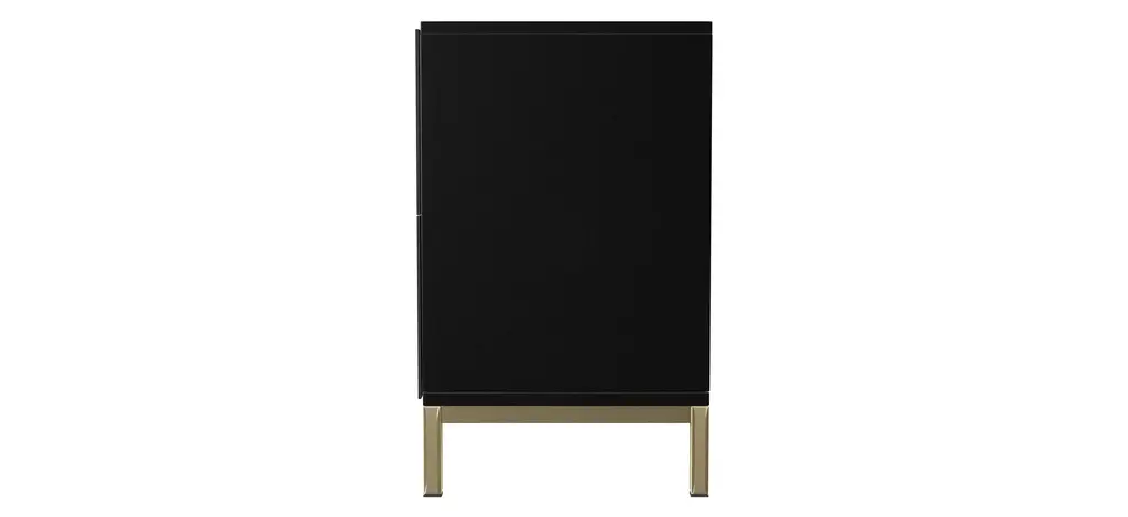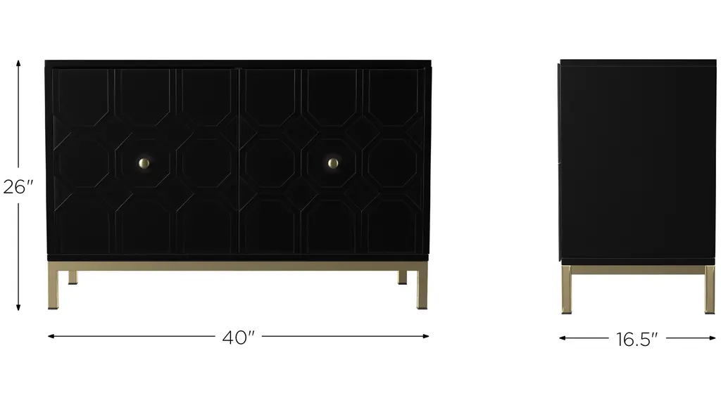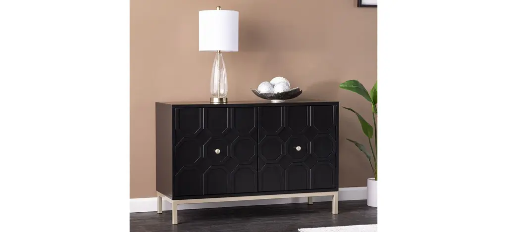 Carve out storage space with this Farrelly Double-Door Cabinet. Ample shelving awaits behind handsome, Moroccan-style carved doors, ready for your stemware, board games, or movie collection. Contrasting hardware and metal base add a touch of color to the sleek black, low-profile silhouette.