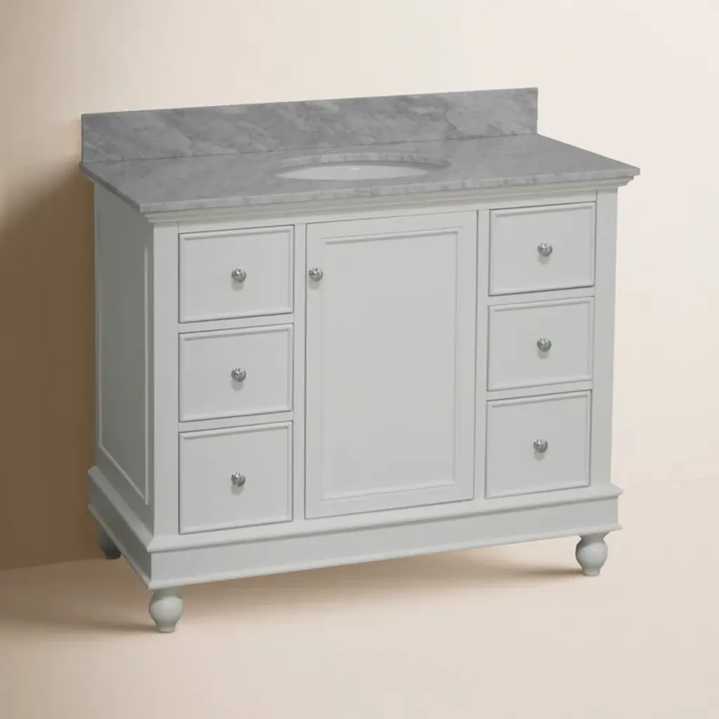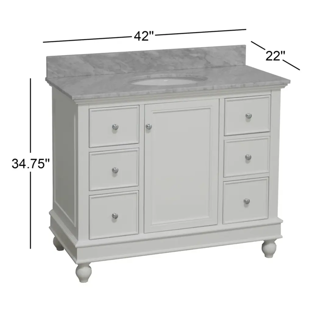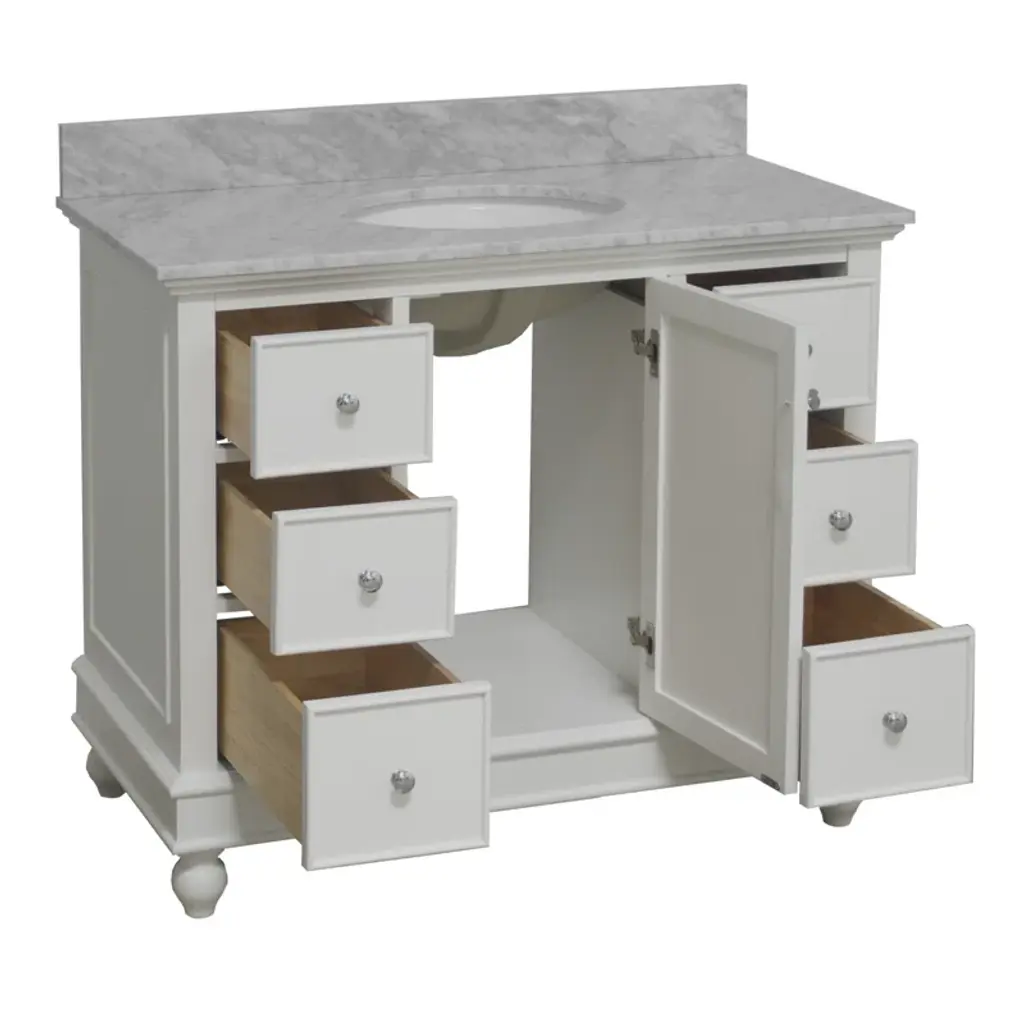 Timeless design meets expert craftsmanship in this freestanding vanity. Made from hand-painted wood, it features an oval ceramic undermount sink and white Carrara marble top. With six dovetailed drawers and a soft-close cabinet, it offers ample storage in a sleek silhouette. Finished with polished chrome hardware and a matching backsplash.