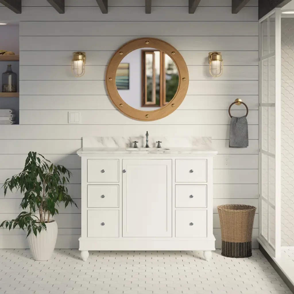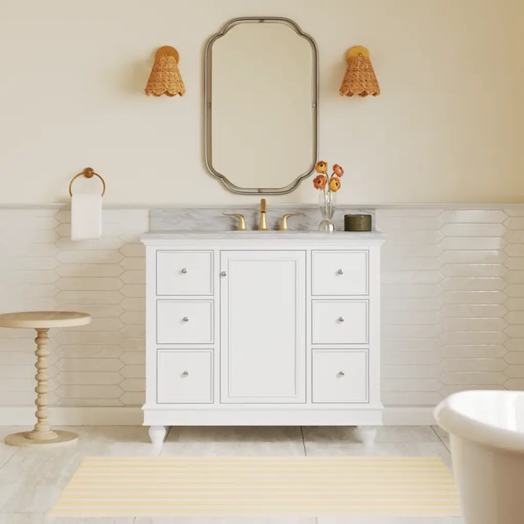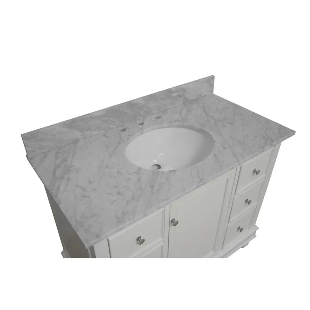 Timeless design meets expert craftsmanship in this freestanding vanity. Made from hand-painted wood, it features an oval ceramic undermount sink and white Carrara marble top. With six dovetailed drawers and a soft-close cabinet, it offers ample storage in a sleek silhouette. Finished with polished chrome hardware and a matching backsplash.