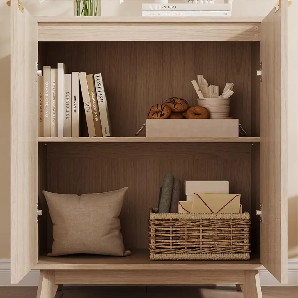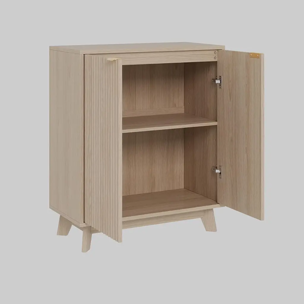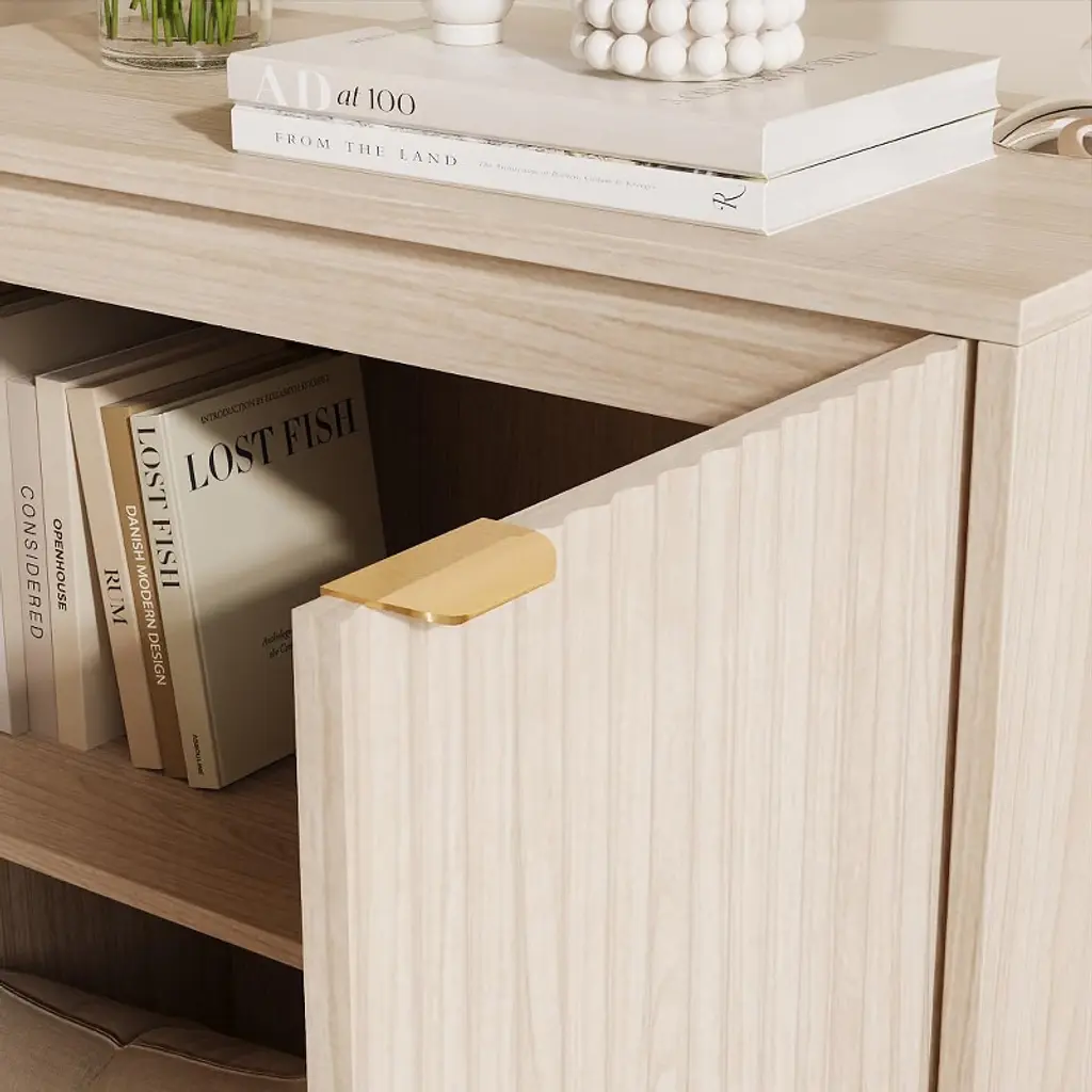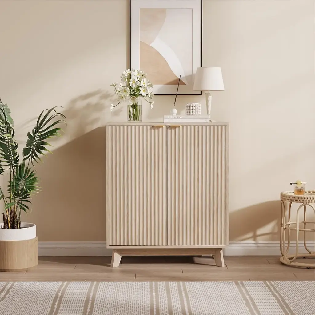 This sideboard cabinet features a vertical fluted panel design with a unique wave pattern, delivering an eye-catching texture that adds refinement and style. Paired with sleek gold metal handles, the minimalist profile brings modern charm to your home.Equipped with a roomy interior and a 3-level adjustable shelf, this side board storage cabinet offers flexible storage options for books, kitchenware, or décor. The 31.5" W x 15.7" D x 32.3" H dimensions provide ample capacity while maintaining a compact footprint.Crafted from premium MDF and supported by stable wood legs, this buffet cabinet stands stable and sturdy. Surface is resistant to water and scratches.Designed to fit seamlessly in any space, this modern fluted sideboard cabinet works as a buffet table in the dining room, a TV stand in the living room, or a coffee bar in the office. Its neutral color and elegant detailing complement both modern and classic interiors.All parts are labeled and matched with step-by-step instructions. With included hardware and clear guidance, you’ll have this fluted cabinet set up in no time—even without professional tools or help.