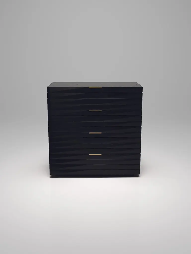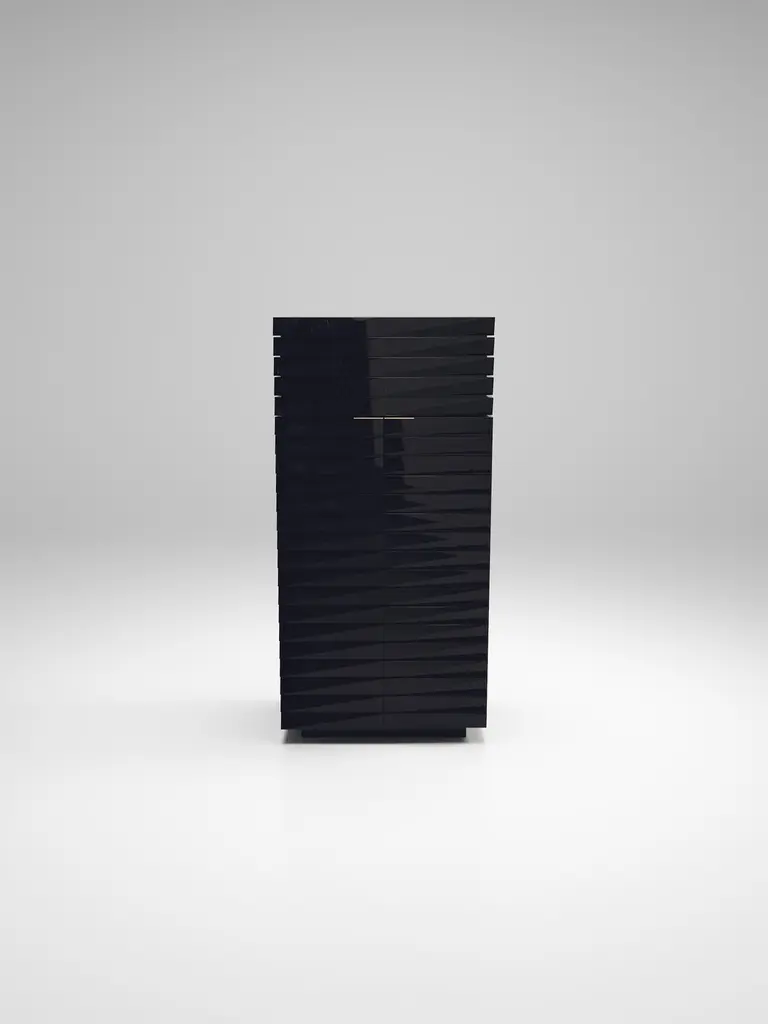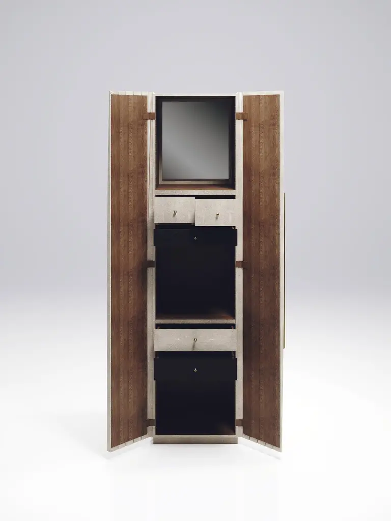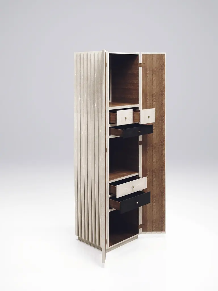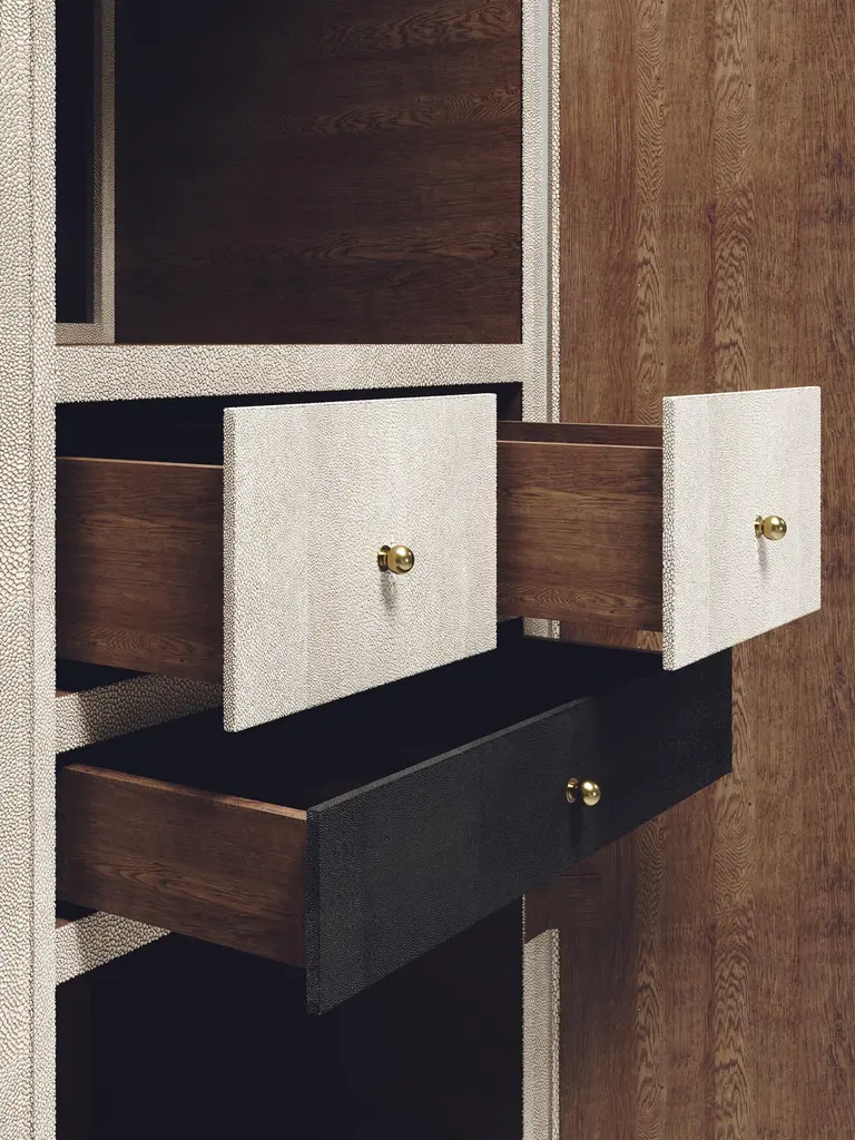 The Paris based label has distinguished themselves since their launch, with their iconic use of shagreen mixed with brass and other exotic materials. All furniture is handcrafted by skilled artisans, ultimately making each piece unique, designed in Paris and produced in the Philippines.The fluted cabinet by R & Y Augousti is a sleek and geometric design. The cream shagreen inlaid piece provides great utility while retaining a striking aesthetic with the incredible hand craved fluted details. This piece can be used as a bar cabinet or a jewellery vanity cabinet. This design includes a mirror, 3 open shelves and a total of 5 drawers with bronze-patina brass knobs, 2 of the drawers are inlaid in black shagreen. Available as a chest of drawers, stool and vanity cabinet as well as other finishes see images at end of slide. Custom color/sizing available on request.The dimensions of this piece are:15.75" x 13.75" x 57"All R & Y Augousti pieces are handmade by artisans, ultimately making each piece unique.Wipe clean with soft dry cloth.Acclaimed design duo Ria & Yiouri Augousti have established themselves since the 1990s as pioneers of modern-vintage style through their luxurious Art Deco inspired collections.The Paris based label has distinguished themselves since their launch, with their iconic use of shagreen mixed with brass and other exotic materials. All furniture is handcrafted by skilled artisans, ultimately making each piece unique. All shagreen-covered items should be kept out of direct sunlight, color variants may occur on the stingray and other exotic finishes, but this showcases the Parisian label's commitment to creating authentic luxurious products using natural components.