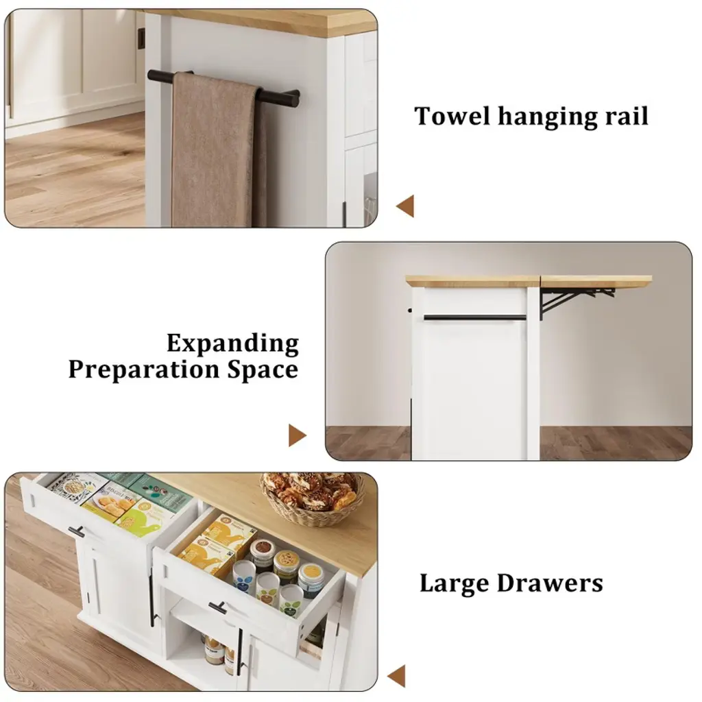 Foldable Kitchen Island Cart With Drop Leaf Top - 2 Glass Doors, Spice Rack, Towel Holder, Compact Mobile Cart With Wheels, For Kitchens, Dining