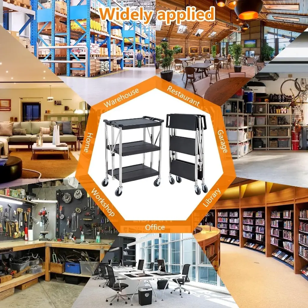 Foldable Service Cart, Stainless Steel Utility Service Cart With 360° Wheels Lockable, 300lbs Load Capacity, 3-tier Shelf Carts For Restaurant Garage