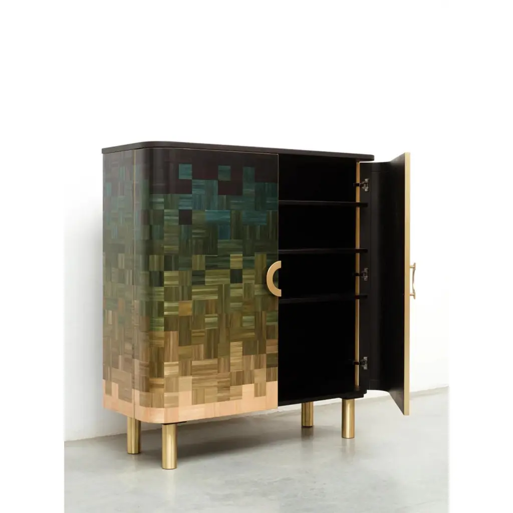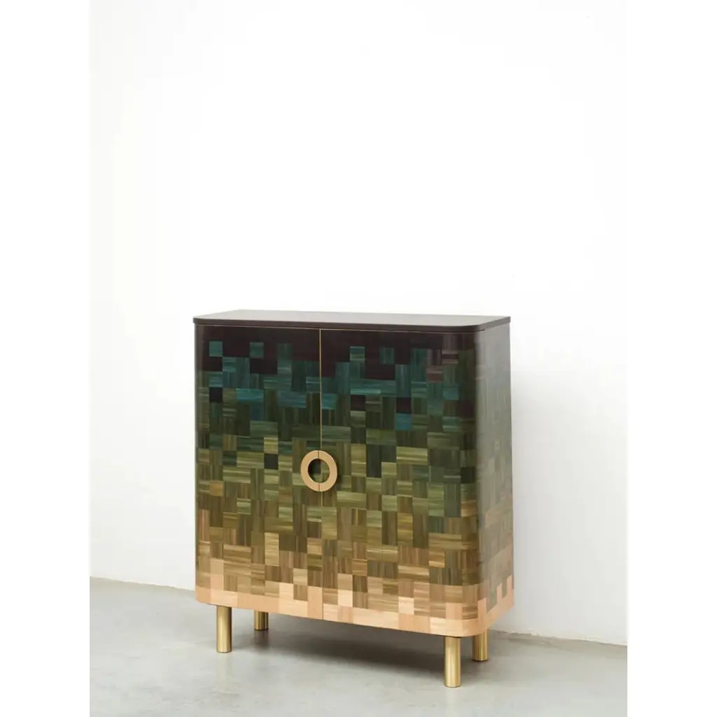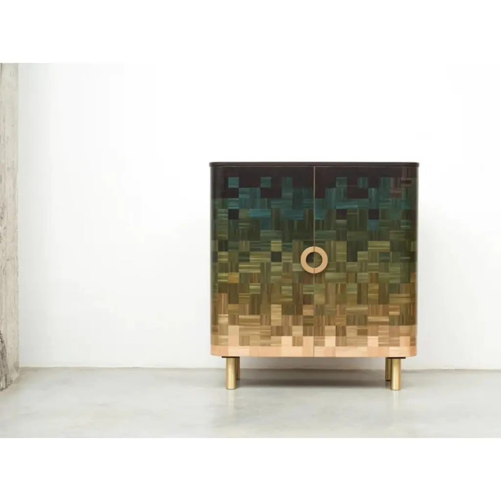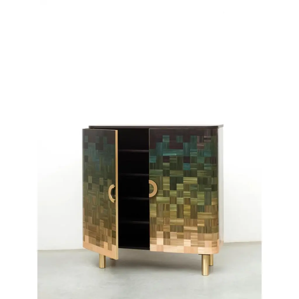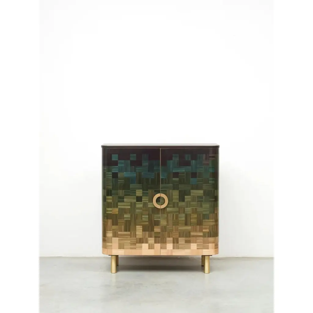 Forest Natūra Cabinet by Ruda StudioDimensions: D 45 x W 130 x H 130 cm.Materials: Solid wood (oak), rye straw inlay, plywood and brass.Weight: 100 kg.Dimensions are customizable. Please contact us. Experience elegance with the newest addition to NATŪRA collection – introducing NATŪRA Cabinet, inspired by the captivating hues of our native land.Meticulously handcrafted and adorned with painted straw inlays, this cabinet stands as a tribute to the bountiful resources and natural beauty of ourhomeland. Skillfully constructed from a blend of solid oak wood and veneered plywood, the tabletop boasts a brushed wood finish embel lished with asophisticated black patina. The cabinet facades showcase intricate straw inlays arranged in a stunning gradient. Elevating the design, the legsand fittings are expertly crafted from brushed brass, adding a touch of refinement to this masterpiece.NATŪRA embodies the vibrant pulse of nature, an exquisite fusion ofresources and energy that fuels our existence. Rooted in the profound wisdom drawn from the natural world, it becomes the guiding force shaping our lives. This meticulously crafted cabinet, a masterpiece born of precision and adorned with handpainted straw inlays, stands as a testament to our heartfelt homage tothe bountiful resources and captivating landscapes that define our land. Each stroke of artistry whispers a narrative of our deep connection with nature, inviting contemplation and celebrating the timeless beauty that surrounds us.Design brand RUDA Studio was founded in 2017 by Oleksandra Rudenko and Yuriy Vovnyanko. RUDA Studio - Ukrainian artisanal atelier with harvest of Fine Craft Design.In the atelier we create unique household items. The studio seeks to make each project individual and special, focusing on feelings, custom items, and the combination of the historical and the modern. Our creations are inspired by natural materials and ancient craft techniques. Each product has its own function, but is more like an object of art that touchesthe soul. The vision of interior items encourages us to preserve and actualize our cultural heritage. In our works, we restore knowledge about Ukrainian folklore, pay attention to socially important topics and focus on the interaction between humans and nature. In the studio, objects are created from local materials - brass, copper, clay, straw, algae, trees, andstone.
