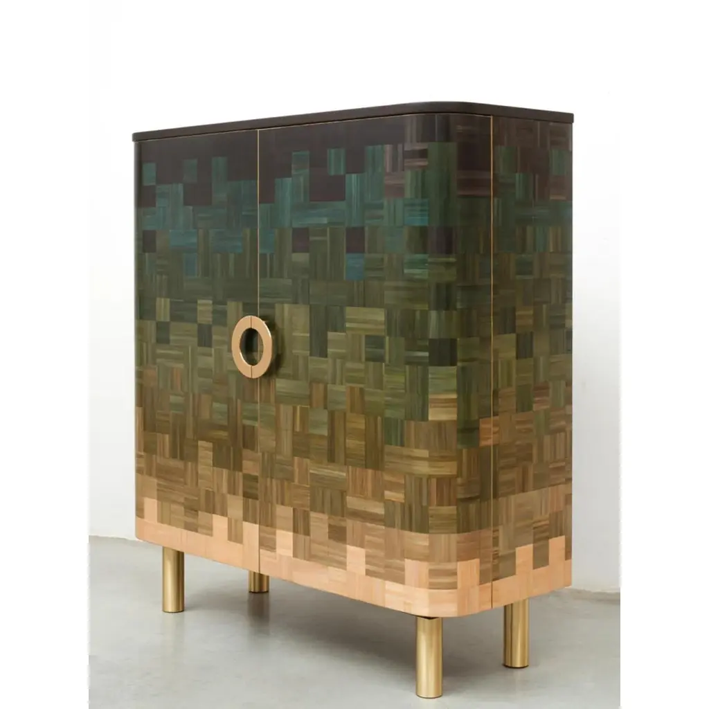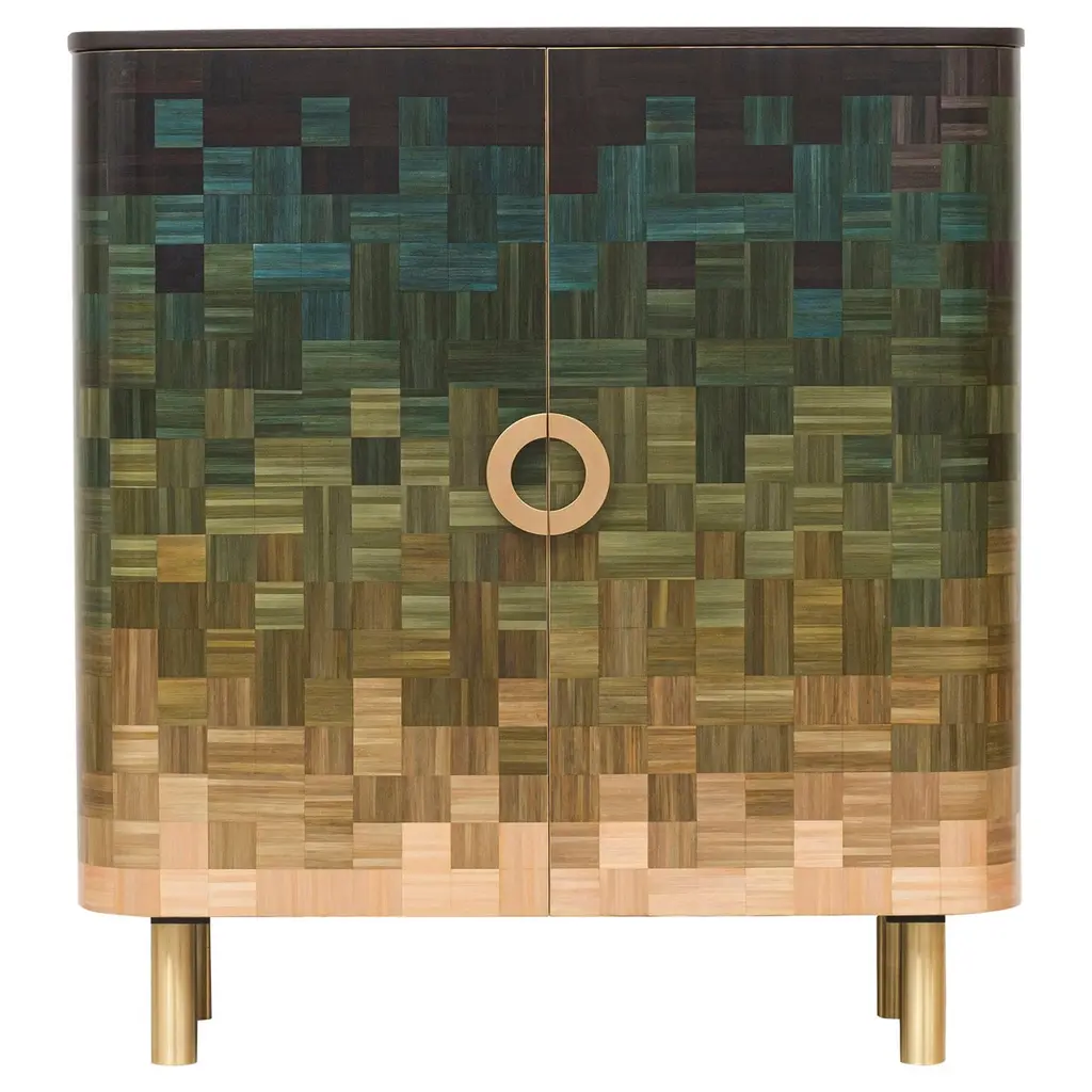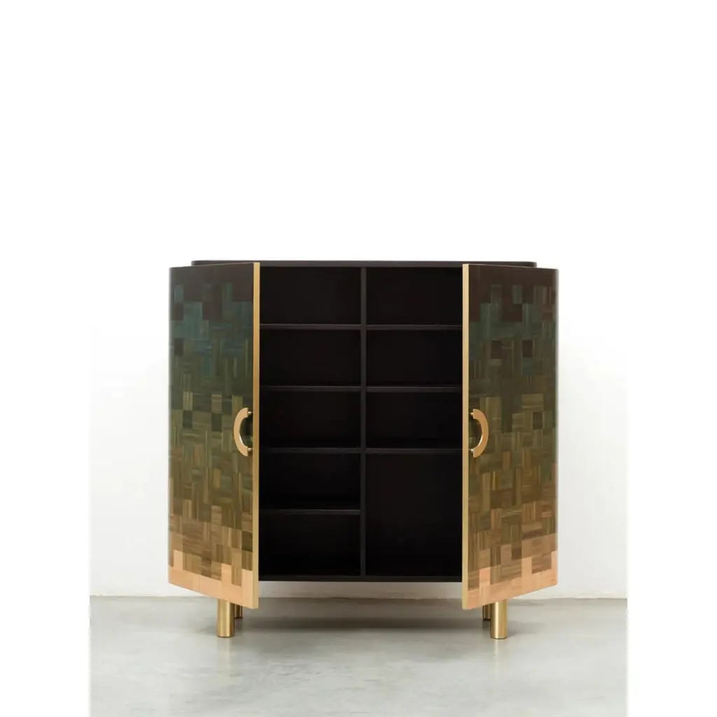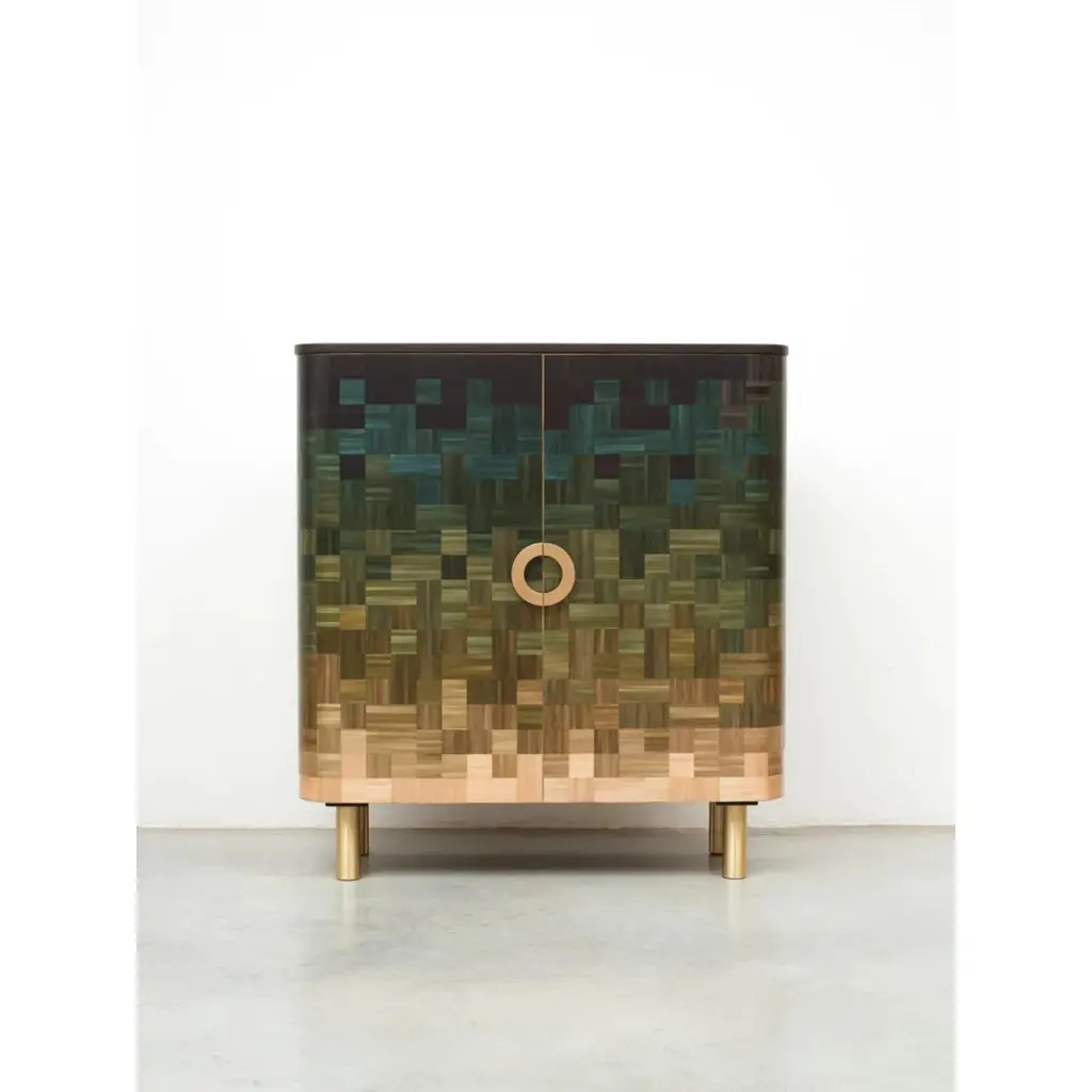 Forest Natūra Cabinet by Ruda StudioDimensions: D 45 x W 130 x H 130 cm.Materials: Solid wood (oak), rye straw inlay, plywood and brass.Weight: 100 kg.Dimensions are customizable. Please contact us. Experience elegance with the newest addition to NATŪRA collection – introducing NATŪRA Cabinet, inspired by the captivating hues of our native land.Meticulously handcrafted and adorned with painted straw inlays, this cabinet stands as a tribute to the bountiful resources and natural beauty of ourhomeland. Skillfully constructed from a blend of solid oak wood and veneered plywood, the tabletop boasts a brushed wood finish embel lished with asophisticated black patina. The cabinet facades showcase intricate straw inlays arranged in a stunning gradient. Elevating the design, the legsand fittings are expertly crafted from brushed brass, adding a touch of refinement to this masterpiece.NATŪRA embodies the vibrant pulse of nature, an exquisite fusion ofresources and energy that fuels our existence. Rooted in the profound wisdom drawn from the natural world, it becomes the guiding force shaping our lives. This meticulously crafted cabinet, a masterpiece born of precision and adorned with handpainted straw inlays, stands as a testament to our heartfelt homage tothe bountiful resources and captivating landscapes that define our land. Each stroke of artistry whispers a narrative of our deep connection with nature, inviting contemplation and celebrating the timeless beauty that surrounds us.Design brand RUDA Studio was founded in 2017 by Oleksandra Rudenko and Yuriy Vovnyanko. RUDA Studio - Ukrainian artisanal atelier with harvest of Fine Craft Design.In the atelier we create unique household items. The studio seeks to make each project individual and special, focusing on feelings, custom items, and the combination of the historical and the modern. Our creations are inspired by natural materials and ancient craft techniques. Each product has its own function, but is more like an object of art that touchesthe soul. The vision of interior items encourages us to preserve and actualize our cultural heritage. In our works, we restore knowledge about Ukrainian folklore, pay attention to socially important topics and focus on the interaction between humans and nature. In the studio, objects are created from local materials - brass, copper, clay, straw, algae, trees, andstone.
