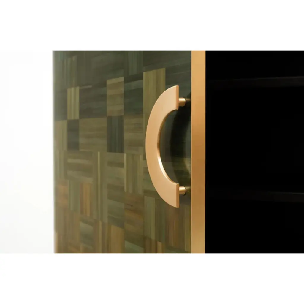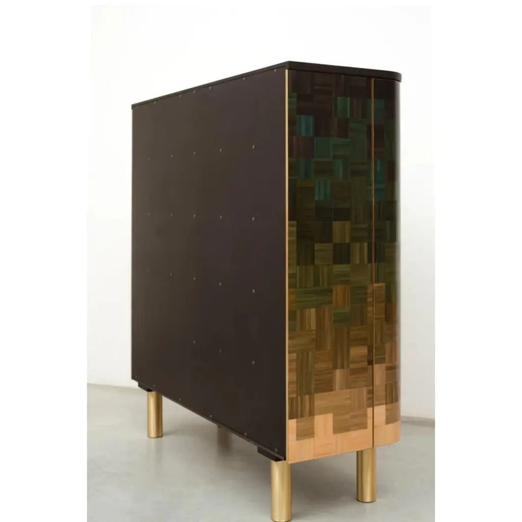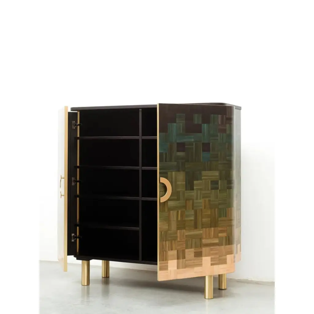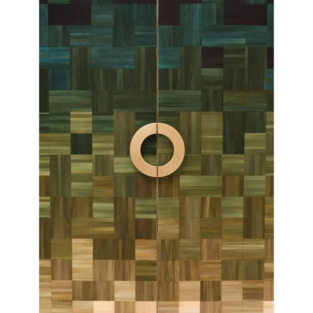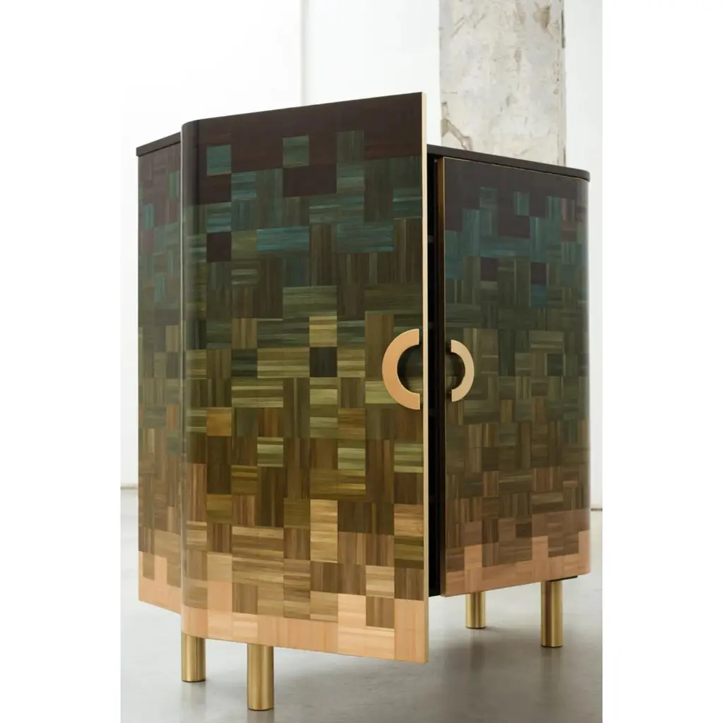 Forest Natūra Cabinet by Ruda StudioDimensions: D 45 x W 130 x H 130 cm.Materials: Solid wood (oak), rye straw inlay, plywood and brass.Weight: 100 kg.Dimensions are customizable. Please contact us. Experience elegance with the newest addition to NATŪRA collection – introducing NATŪRA Cabinet, inspired by the captivating hues of our native land.Meticulously handcrafted and adorned with painted straw inlays, this cabinet stands as a tribute to the bountiful resources and natural beauty of ourhomeland. Skillfully constructed from a blend of solid oak wood and veneered plywood, the tabletop boasts a brushed wood finish embel lished with asophisticated black patina. The cabinet facades showcase intricate straw inlays arranged in a stunning gradient. Elevating the design, the legsand fittings are expertly crafted from brushed brass, adding a touch of refinement to this masterpiece.NATŪRA embodies the vibrant pulse of nature, an exquisite fusion ofresources and energy that fuels our existence. Rooted in the profound wisdom drawn from the natural world, it becomes the guiding force shaping our lives. This meticulously crafted cabinet, a masterpiece born of precision and adorned with handpainted straw inlays, stands as a testament to our heartfelt homage tothe bountiful resources and captivating landscapes that define our land. Each stroke of artistry whispers a narrative of our deep connection with nature, inviting contemplation and celebrating the timeless beauty that surrounds us.Design brand RUDA Studio was founded in 2017 by Oleksandra Rudenko and Yuriy Vovnyanko. RUDA Studio - Ukrainian artisanal atelier with harvest of Fine Craft Design.In the atelier we create unique household items. The studio seeks to make each project individual and special, focusing on feelings, custom items, and the combination of the historical and the modern. Our creations are inspired by natural materials and ancient craft techniques. Each product has its own function, but is more like an object of art that touchesthe soul. The vision of interior items encourages us to preserve and actualize our cultural heritage. In our works, we restore knowledge about Ukrainian folklore, pay attention to socially important topics and focus on the interaction between humans and nature. In the studio, objects are created from local materials - brass, copper, clay, straw, algae, trees, andstone.