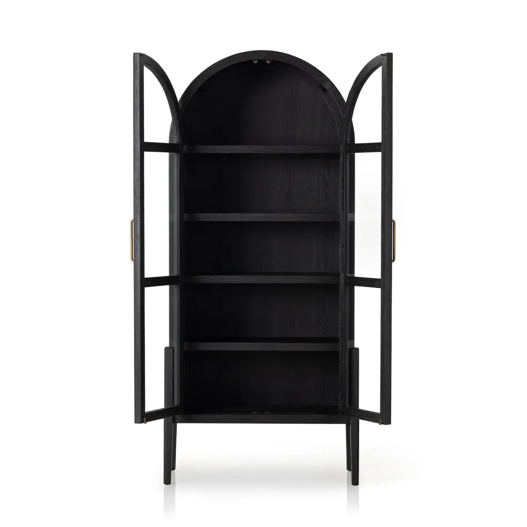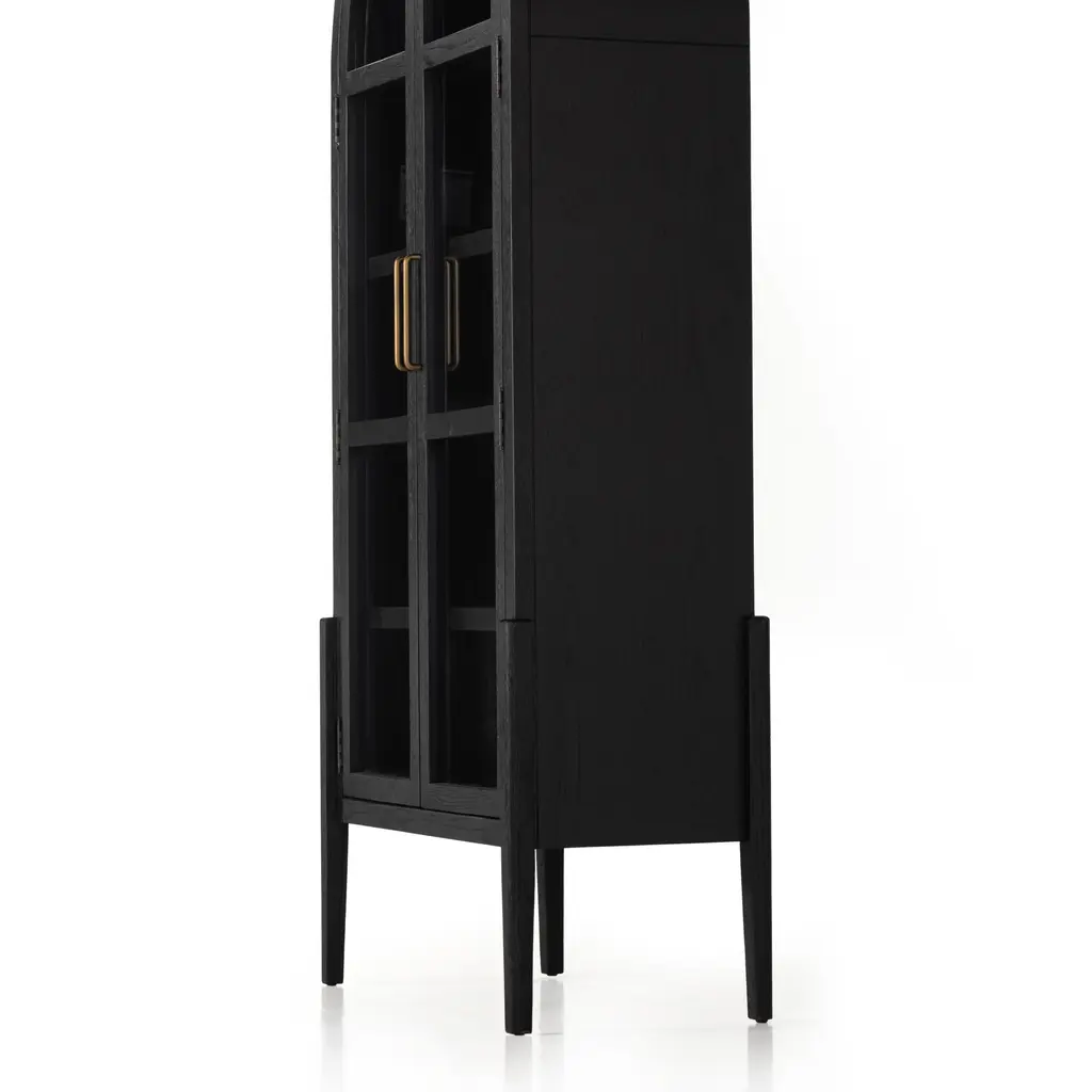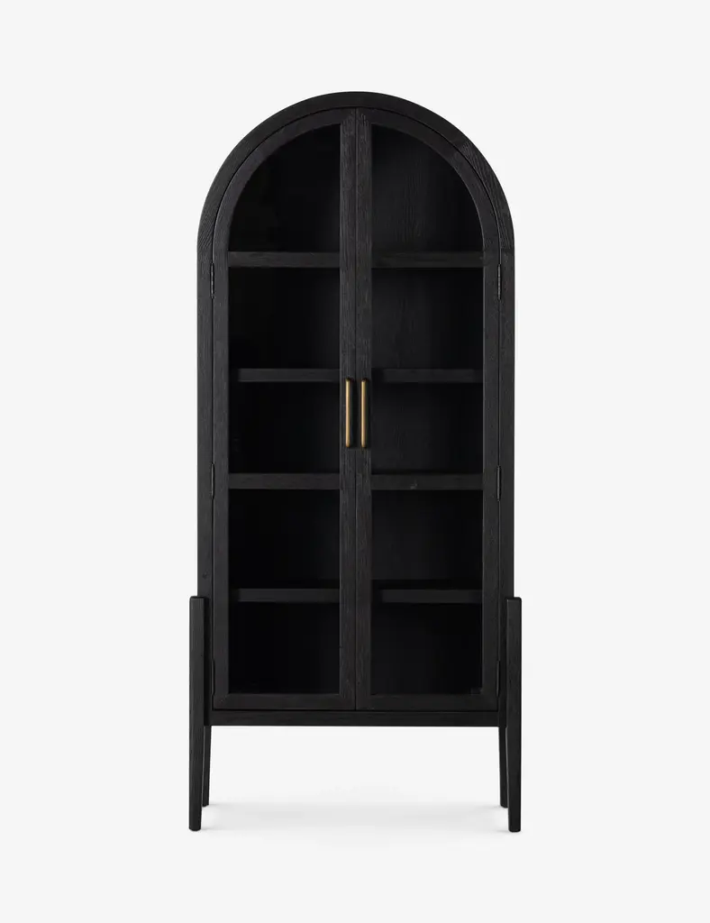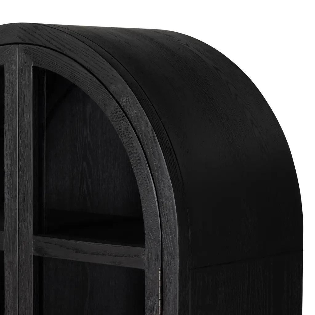 Made from black-finished solid oak, French-inspired cabinetry features an arched top, spacious interior and a clear glass front for storage and display.