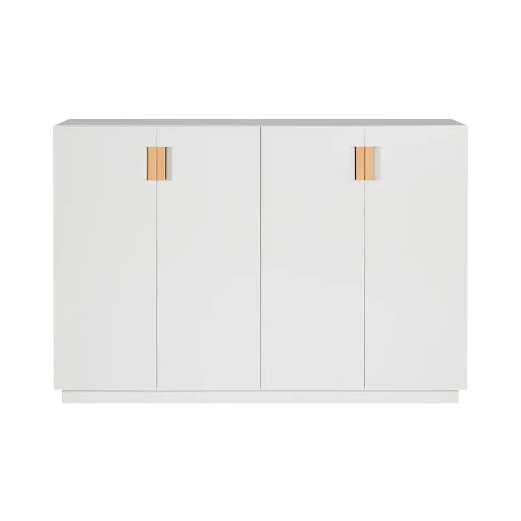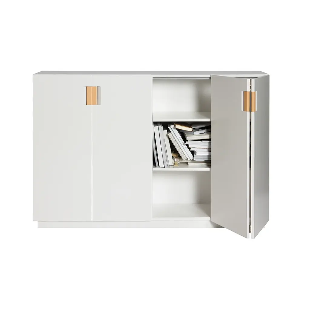 Present a smooth front to the world despite what might be hiding within this roomy storage cabinet with double folding doors. From Asplund’s Frame collection by Swedish designers Anya Sebton and Eva Lilja Löwenhielm, the unit 160 High opens from the center with to reveal 2 interior compartments with 4 lacquered shelves. The striking monochrome concept is rendered in lacquered MDF in a choice of Nordic tones with genuine leather pull handles providing a visual contrast.