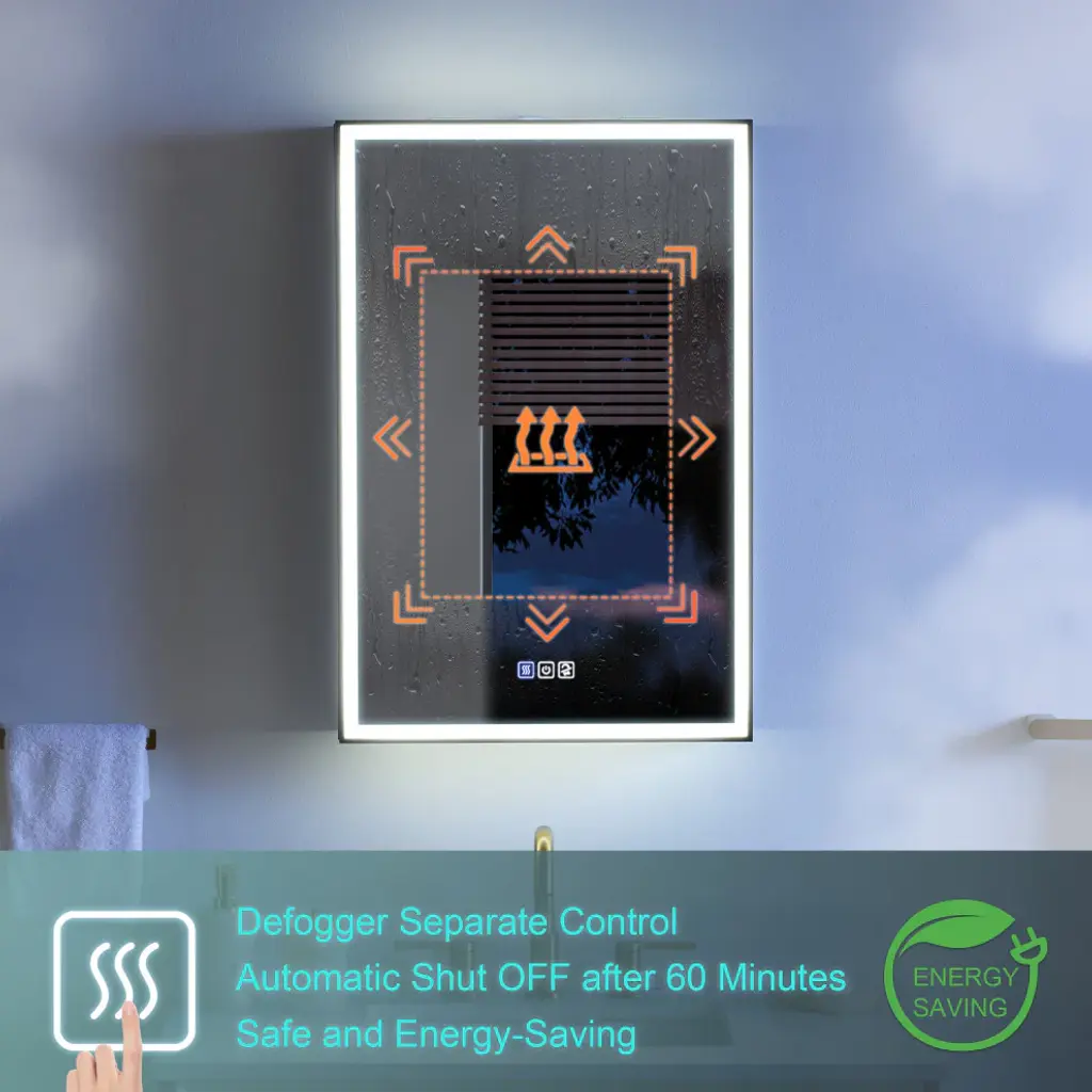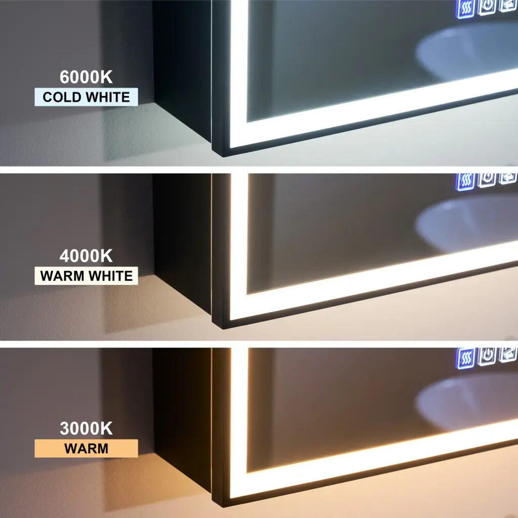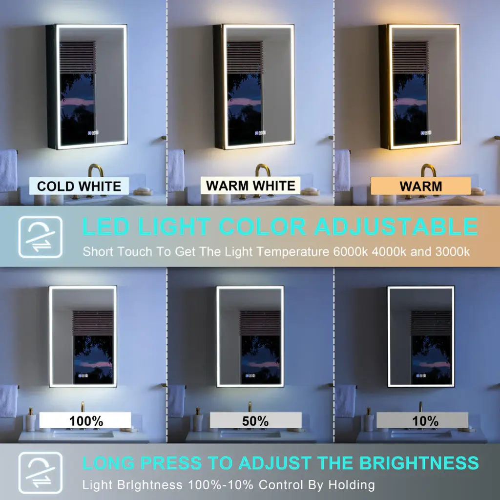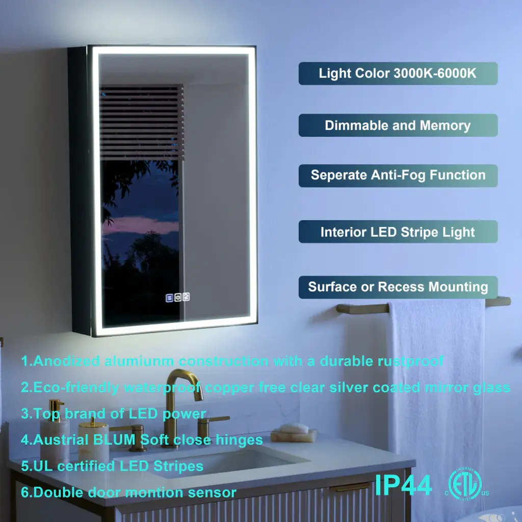 1. Compatible with Wall-mount and Recessed Mount.2. Continously-variable for light color temperature changes from 3000K-6000K delivers a ideal light.3. 10%-100% light dimmable and memory function allows you to control the brightness of light and the brightness state is restored when the light is powered off.4. UL certified Exterior LED Strip Light + Interior LED Light guides provide bright lighting.5. Equipped with USB output and outlet.6. The door-sensor night light provides gentle illumination for nighttime use in the bathroom or dressing area.7. Austria BLUM three-dimention adjustable soft-close door hinges with wide opening capability for easy cabinet access.8. Front mirror, inside door mirror and back panel mirror are provide superior visibility. All mirrors are safety backing film mirrors to prevent injury.9. Adjustable Tempered-glass shelves.10. Interior LED stripe light goes on/off same time with door(s) open/close by motion sensors.11. Large-size Anti-fog pad provides better defogger performance. Anti-fog function is separate controlled and anti-fog power will be automatic shut off after 60 minutes,safe and energy-saving.12. Intergrated LED bulbs have an estimated life-expectancy of 50,000 hours.13. Minimum CRI(color redering index) 90+ .14. Can be installed with hardwired.15. IP4416. Two-year limited Warranty.