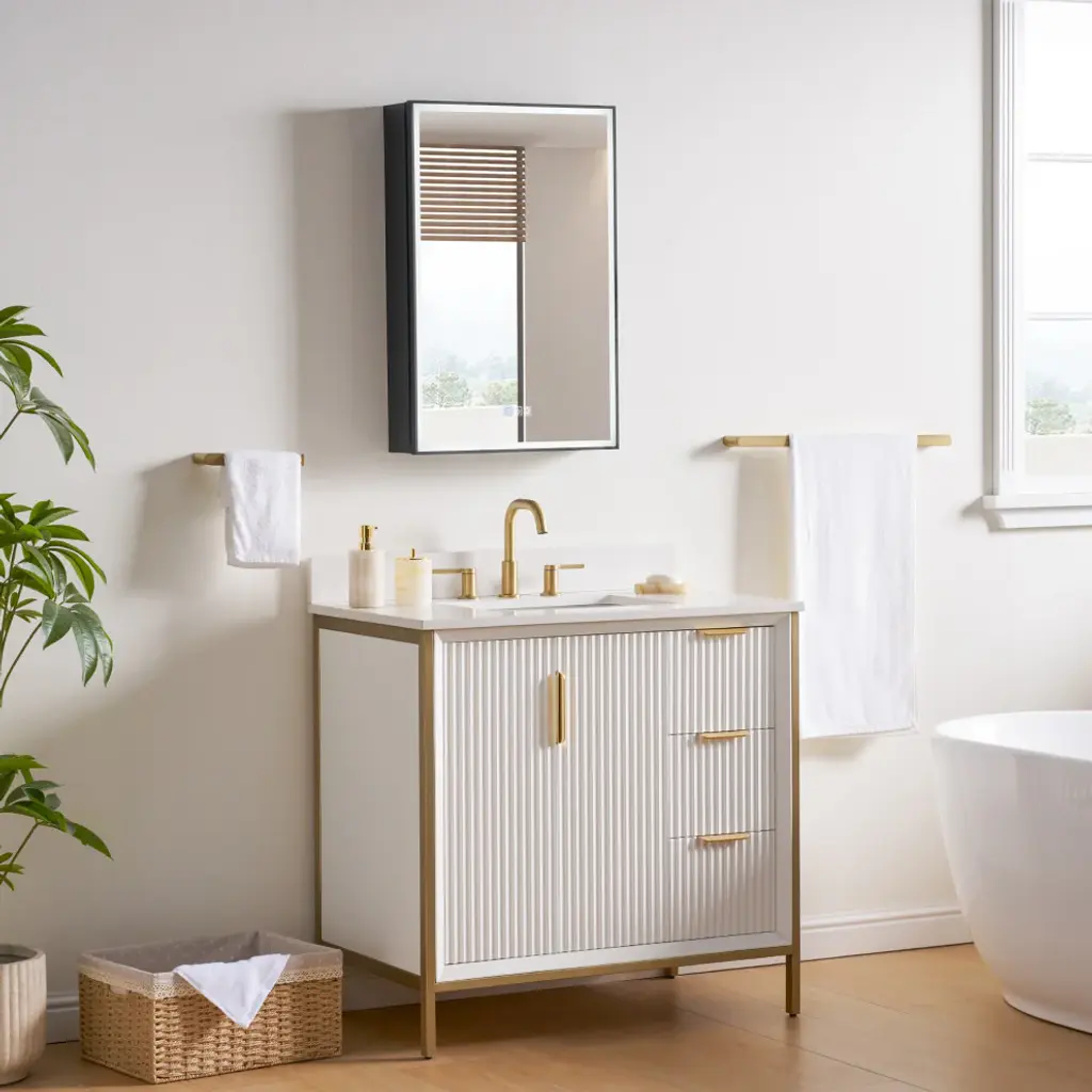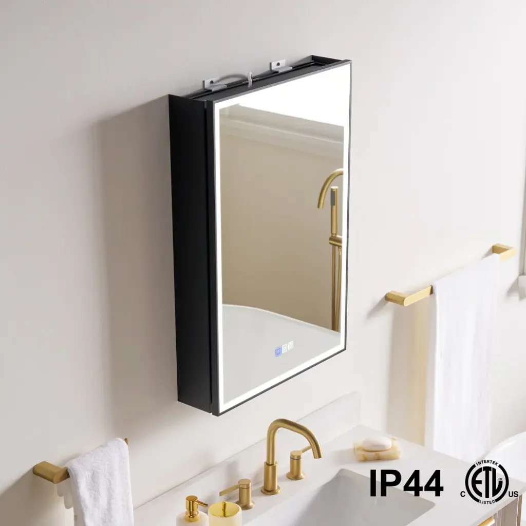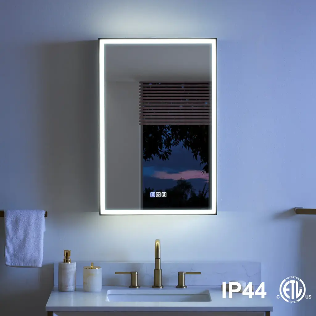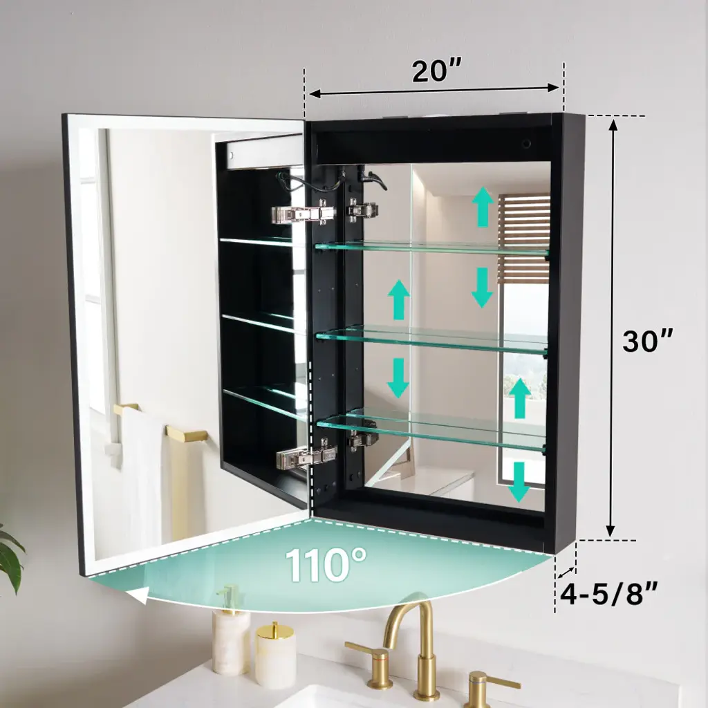 1. Compatible with Wall-mount and Recessed Mount.2. Continously-variable for light color temperature changes from 3000K-6000K delivers a ideal light.3. 10%-100% light dimmable and memory function allows you to control the brightness of light and the brightness state is restored when the light is powered off.4. UL certified Exterior LED Strip Light + Interior LED Light guides provide bright lighting.5. Equipped with USB output and outlet.6. The door-sensor night light provides gentle illumination for nighttime use in the bathroom or dressing area.7. Austria BLUM three-dimention adjustable soft-close door hinges with wide opening capability for easy cabinet access.8. Front mirror, inside door mirror and back panel mirror are provide superior visibility. All mirrors are safety backing film mirrors to prevent injury.9. Adjustable Tempered-glass shelves.10. Interior LED stripe light goes on/off same time with door(s) open/close by motion sensors.11. Large-size Anti-fog pad provides better defogger performance. Anti-fog function is separate controlled and anti-fog power will be automatic shut off after 60 minutes,safe and energy-saving.12. Intergrated LED bulbs have an estimated life-expectancy of 50,000 hours.13. Minimum CRI(color redering index) 90+ .14. Can be installed with hardwired.15. IP4416. Two-year limited Warranty.