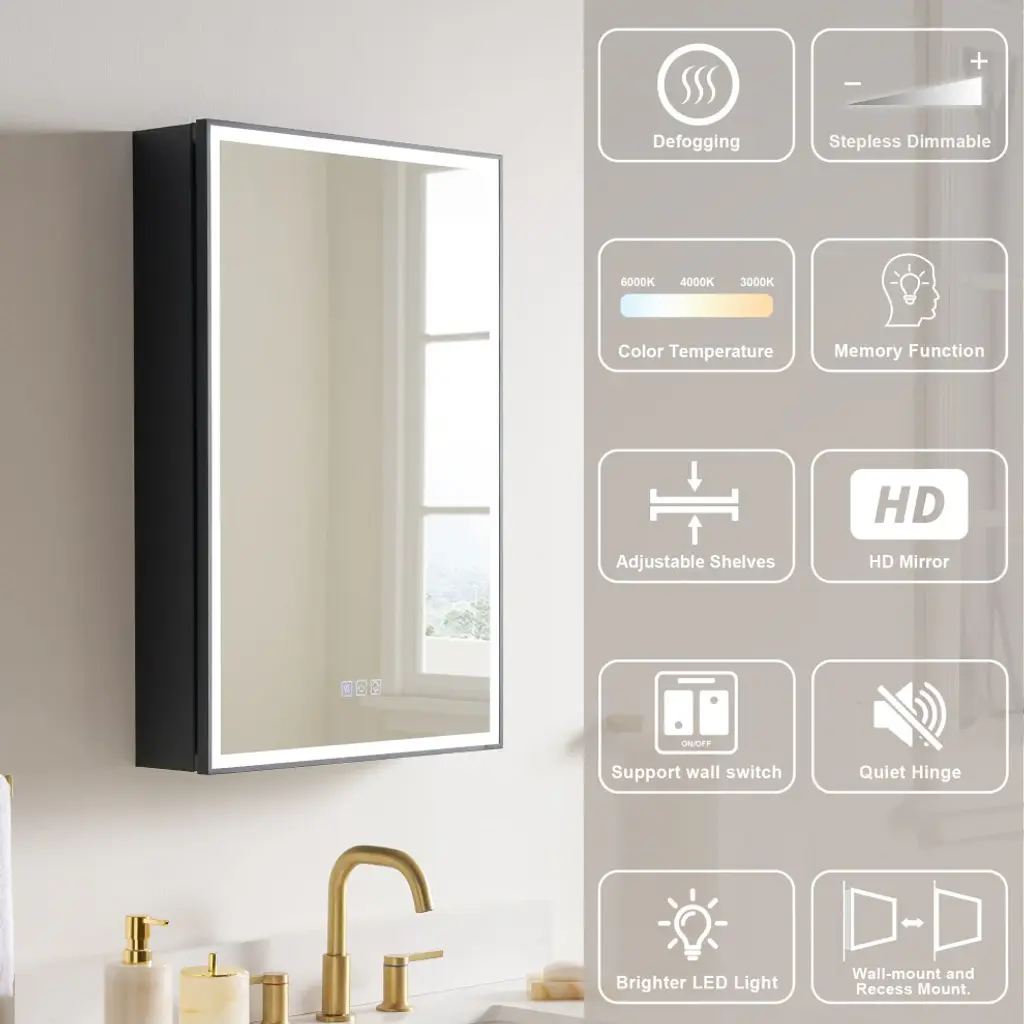 Framed Led Medicine Cabinet Recessed/surface Mount, Dimmable, Anti-Fog, Black, 20"x30" Left Door