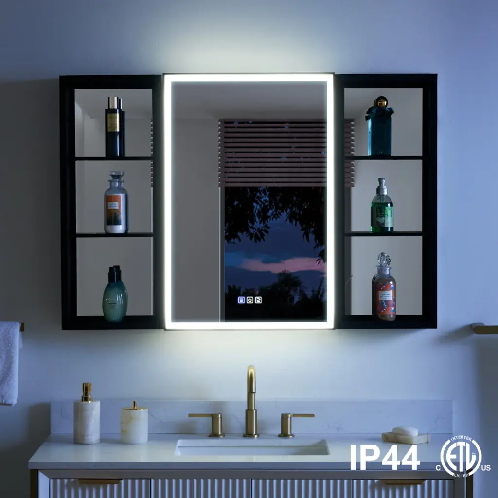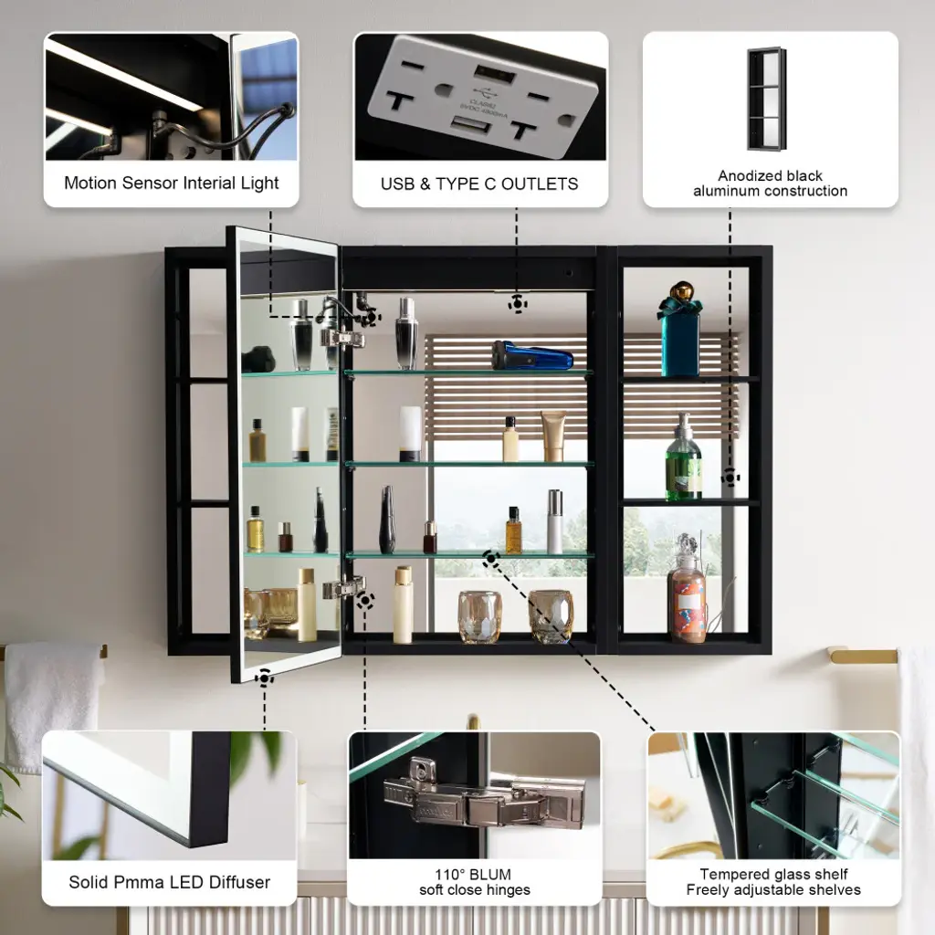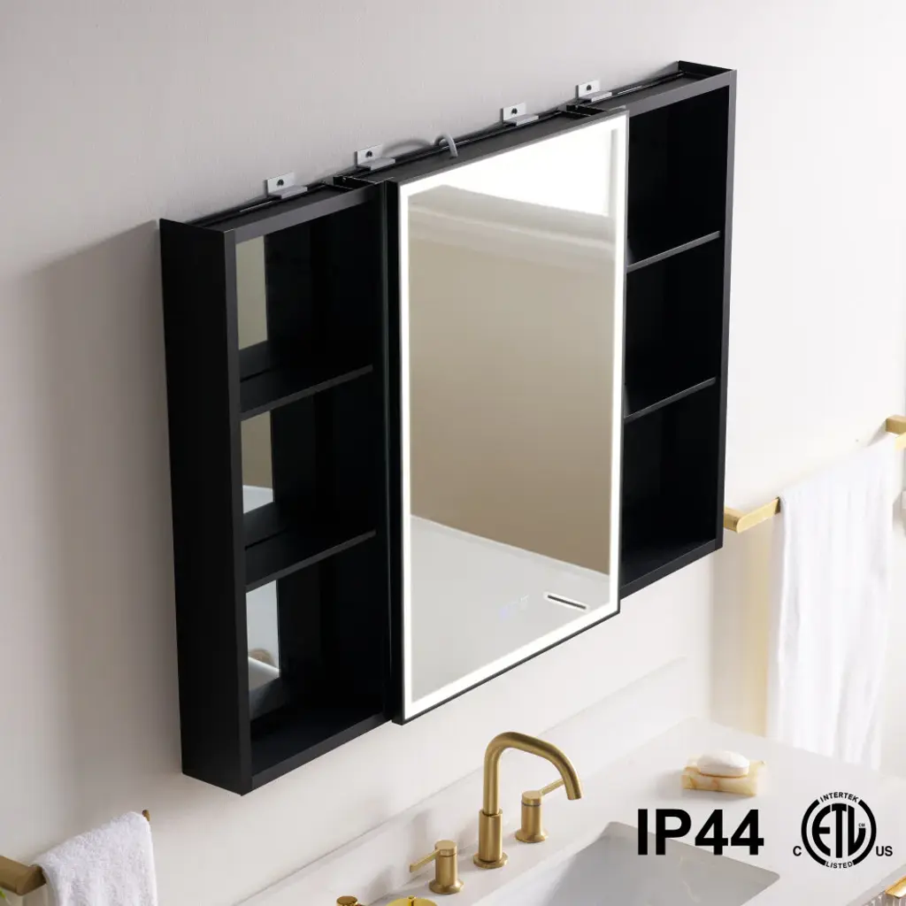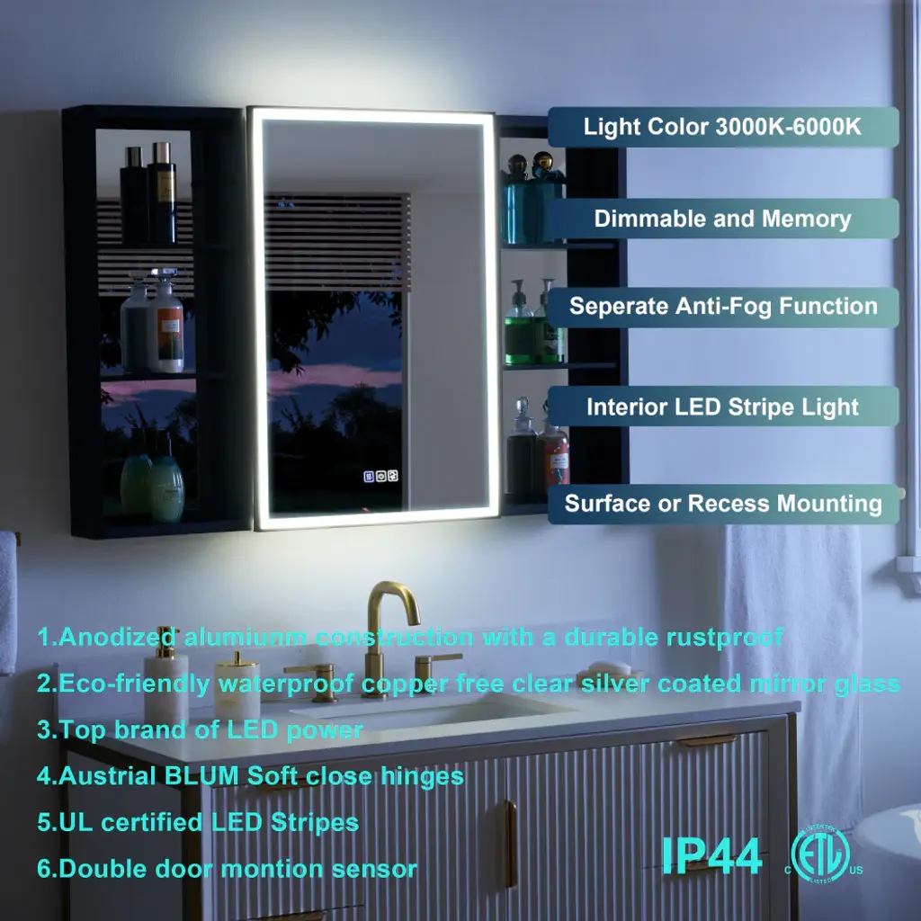 • • • 20"x30" Left Door + TWO 12"x30" Side Cabinets• • 1. Compatible with Wall-mount and Recessed Mount. Wall-mount size: W44• H30• D4-5/8"; Recess mount size: 43-3/10"• 28-7/8"• 3-13/16"2. Continously-variable for light color temperature changes from 3000K-6000K delivers a ideal light.3. 10%-100% light dimmable and memory function allows you to control the brightness of light and the brightness state is restored when the light is powered off.4. UL certified Exterior LED Strip Light + Interior LED Light guides provide bright lighting.5. Equipped with USB output and outlet.6. The door-sensor night light provides gentle illumination for nighttime use in the bathroom or dressing area.7. Austria BLUM three-dimention adjustable soft-close door hinges with wide opening capability for easy cabinet access.8. Front mirror, inside door mirror and back panel mirror are provide superior visibility. All mirrors are safety backing film mirrors to prevent injury.9. Adjustable Tempered-glass shelves.10. Interior LED stripe light goes on/off same time with door(s) open/close by motion sensors.11. Large-size Anti-fog pad provides better defogger performance. Anti-fog function is separate controlled and anti-fog power will be automatic shut off after 60 minutes,safe and energy-saving.12. Intergrated LED bulbs have an estimated life-expectancy of 50,000 hours.13. Minimum CRI(color redering index) 90+ .14. Can be installed with hardwired.15. IP4416. Two-year limited Warranty.