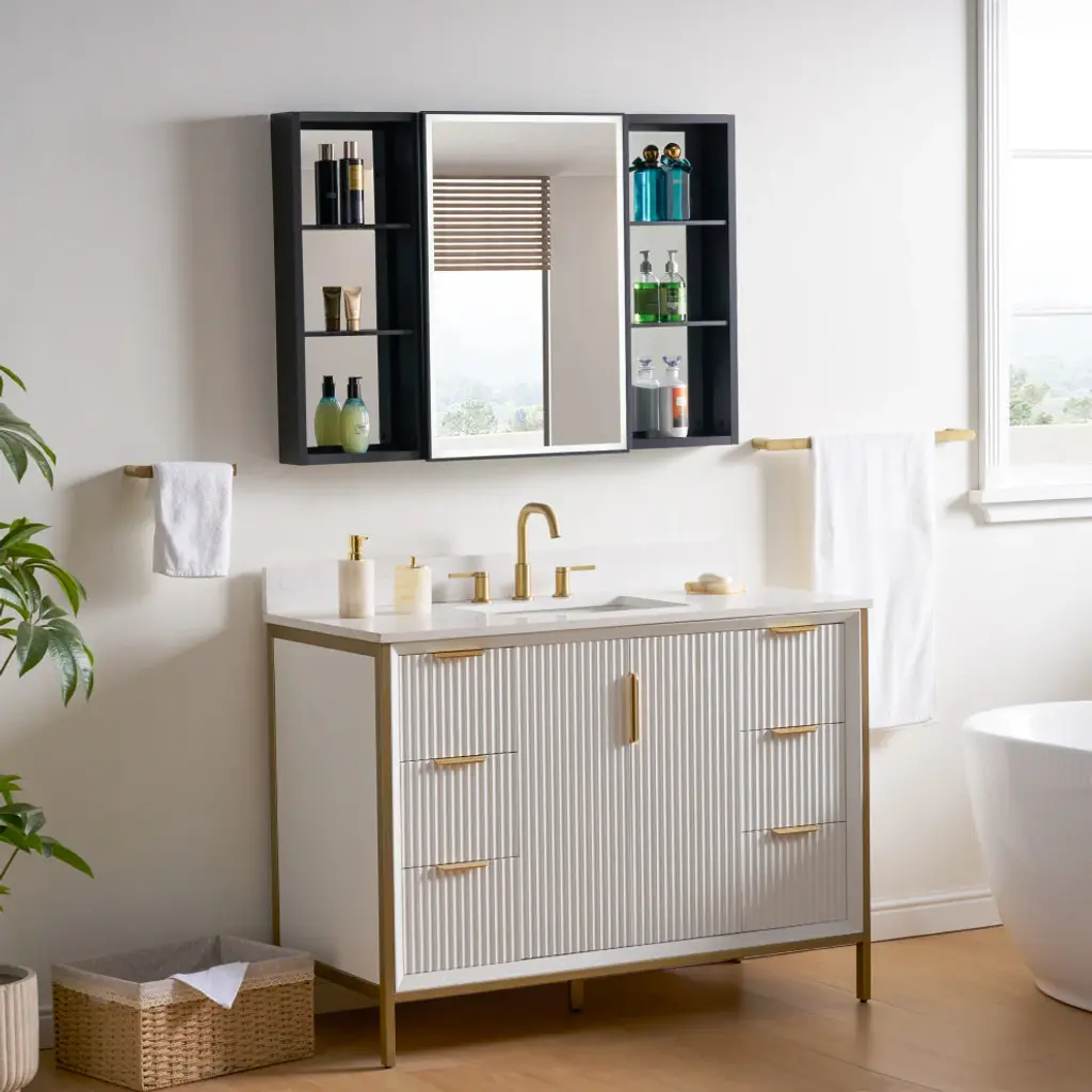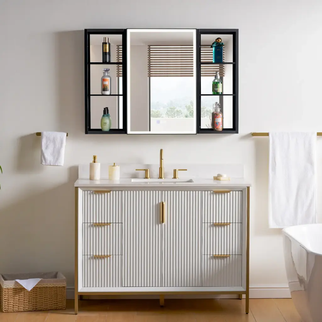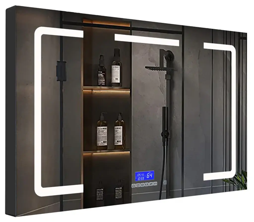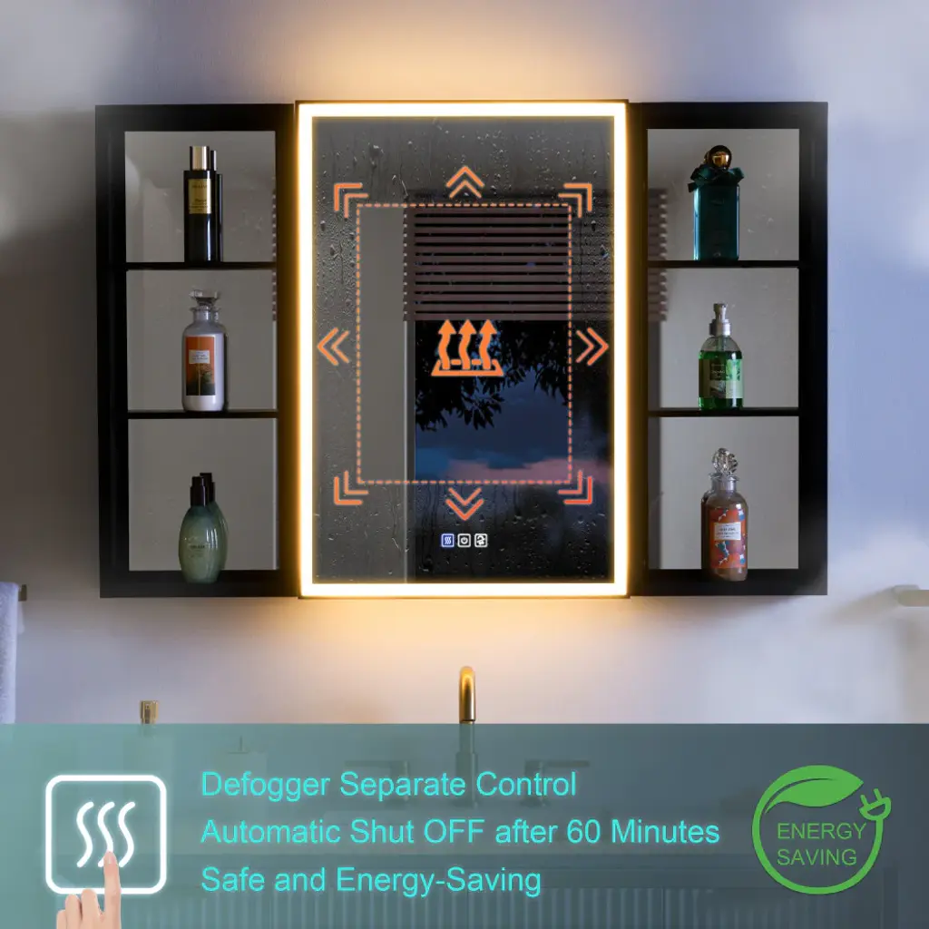 • • • 20"x30" Left Door + TWO 12"x30" Side Cabinets• • 1. Compatible with Wall-mount and Recessed Mount. Wall-mount size: W44• H30• D4-5/8"; Recess mount size: 43-3/10"• 28-7/8"• 3-13/16"2. Continously-variable for light color temperature changes from 3000K-6000K delivers a ideal light.3. 10%-100% light dimmable and memory function allows you to control the brightness of light and the brightness state is restored when the light is powered off.4. UL certified Exterior LED Strip Light + Interior LED Light guides provide bright lighting.5. Equipped with USB output and outlet.6. The door-sensor night light provides gentle illumination for nighttime use in the bathroom or dressing area.7. Austria BLUM three-dimention adjustable soft-close door hinges with wide opening capability for easy cabinet access.8. Front mirror, inside door mirror and back panel mirror are provide superior visibility. All mirrors are safety backing film mirrors to prevent injury.9. Adjustable Tempered-glass shelves.10. Interior LED stripe light goes on/off same time with door(s) open/close by motion sensors.11. Large-size Anti-fog pad provides better defogger performance. Anti-fog function is separate controlled and anti-fog power will be automatic shut off after 60 minutes,safe and energy-saving.12. Intergrated LED bulbs have an estimated life-expectancy of 50,000 hours.13. Minimum CRI(color redering index) 90+ .14. Can be installed with hardwired.15. IP4416. Two-year limited Warranty.