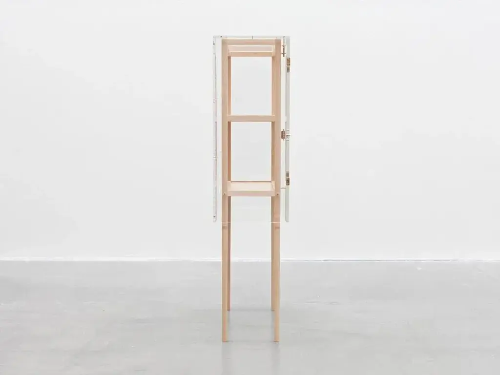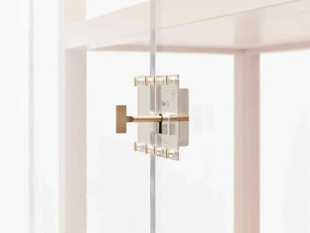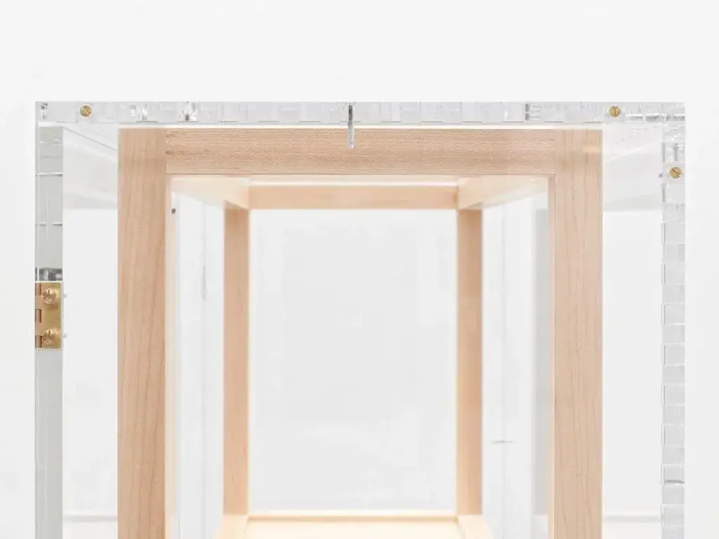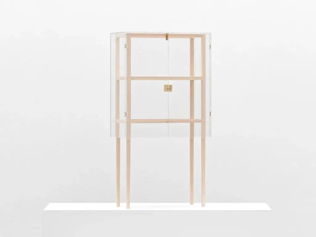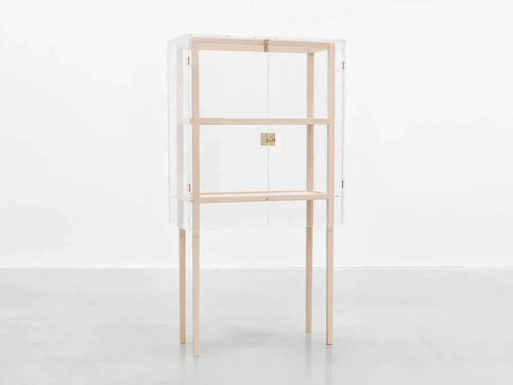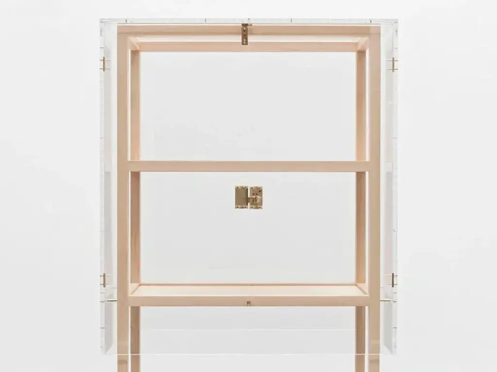 Frank cabinet by snickeriet dimensions: d 34,8 x w 82,8 x h 156,2 cm. Materials: acrylic glass, maple wood and brass. Adjustments can be discussed as long as furniture archetype is maintained. Please contact us. Frank is the result of exploring woodworking techniques on transparent acrylic, resulting in a vitrine cupboard that fully exposes its construction. Fittings, fasteners, joinery and locking mechanisms are fully displayed and can be observed from within the material itself. The dovetailed acrylic casing resting on the swedish maple frame gives the piece an airy prescience that both highlights and protects its content.