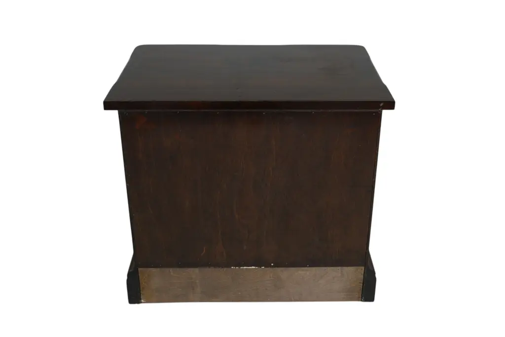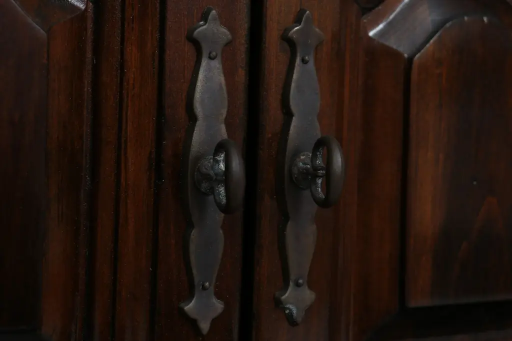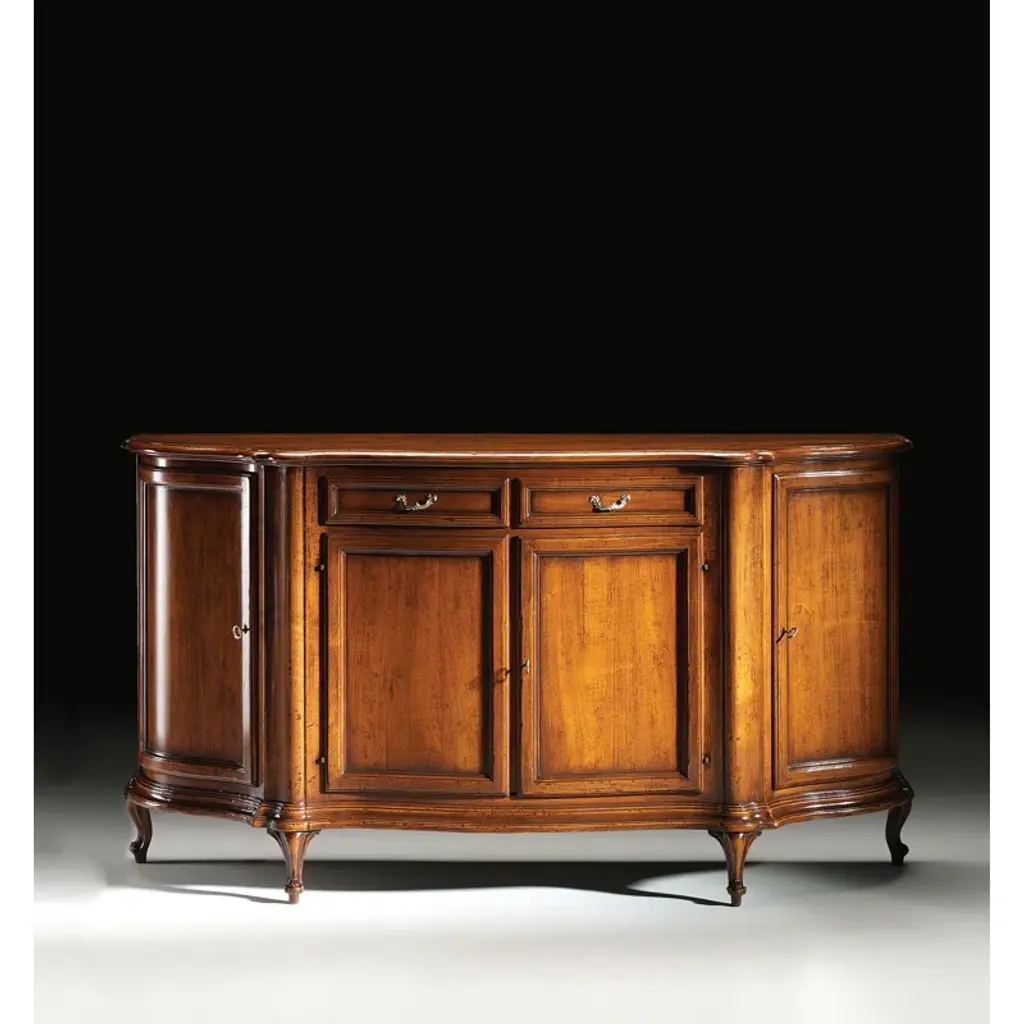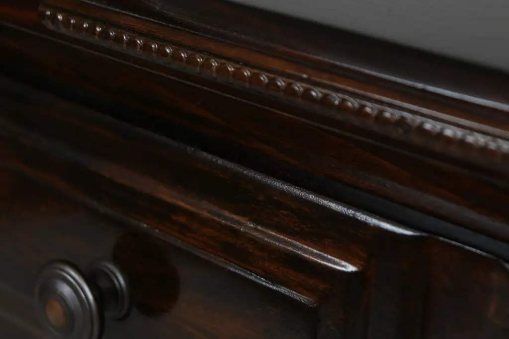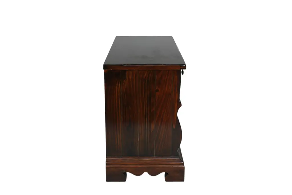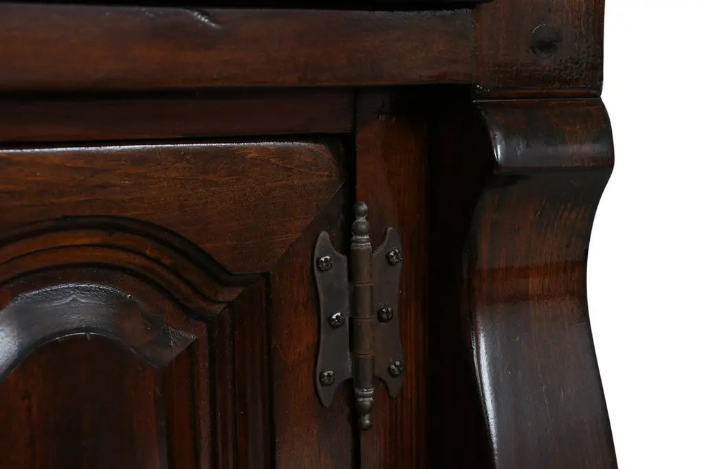 A French Empire style custom made cabinet, hand made by Lion Crest Woodworking of Sarasota, FL. The cabinet top has rounded edges with a decorative beaded section in front. A single drawer has the look of two with round mushroom knob handles at the center of two panels. Below, cabinet doors with arched panels open with ornate metal handles. Finished with a beveled base and ogee bracket feet. The hanging tag reads ���Lion Crest Woodworking, Handmade Sarasota, FL�������.