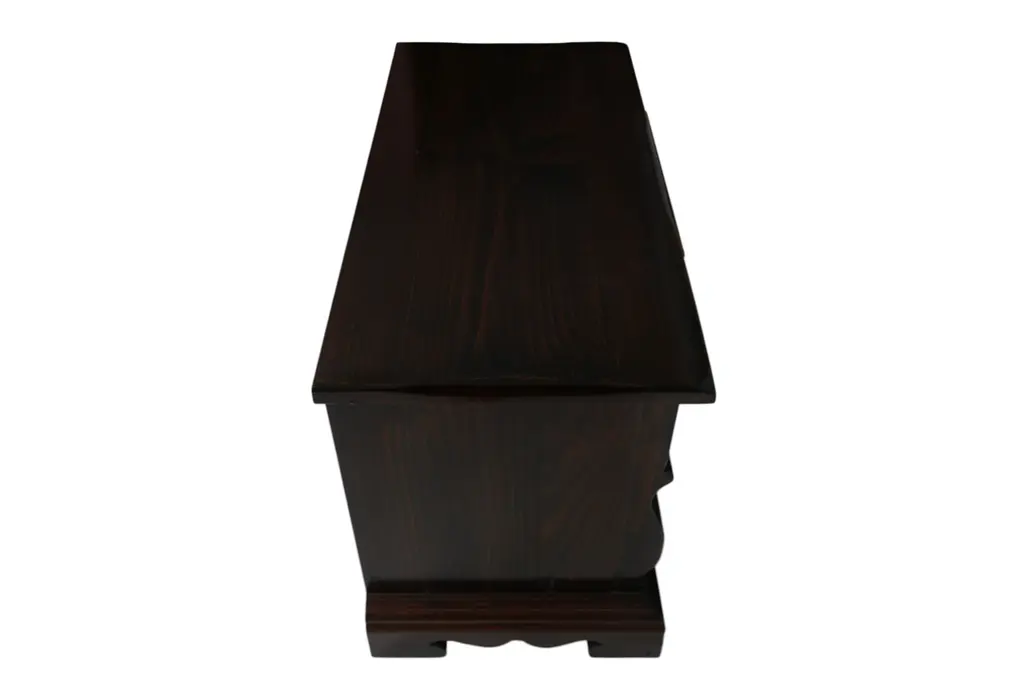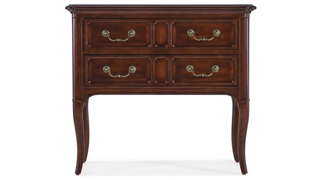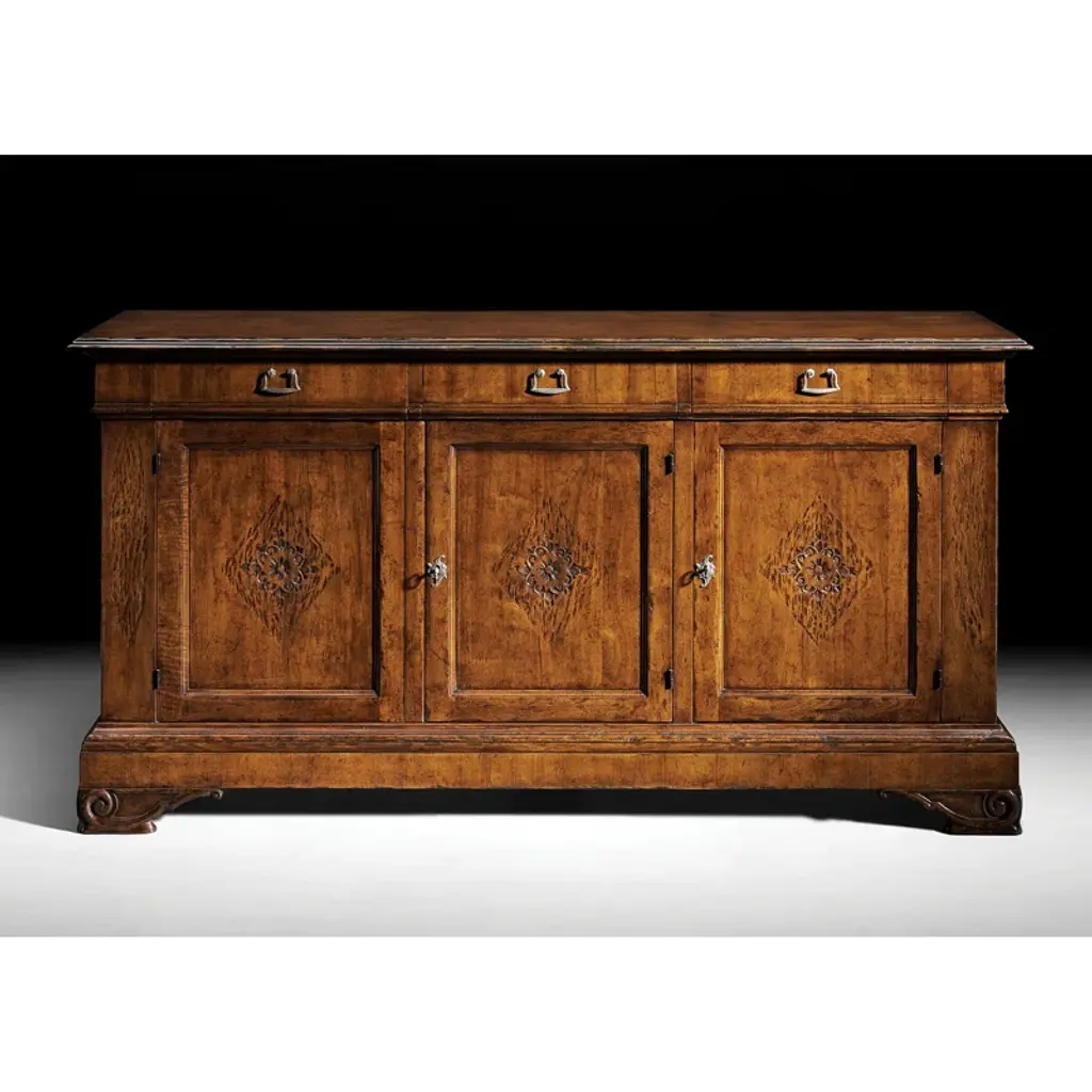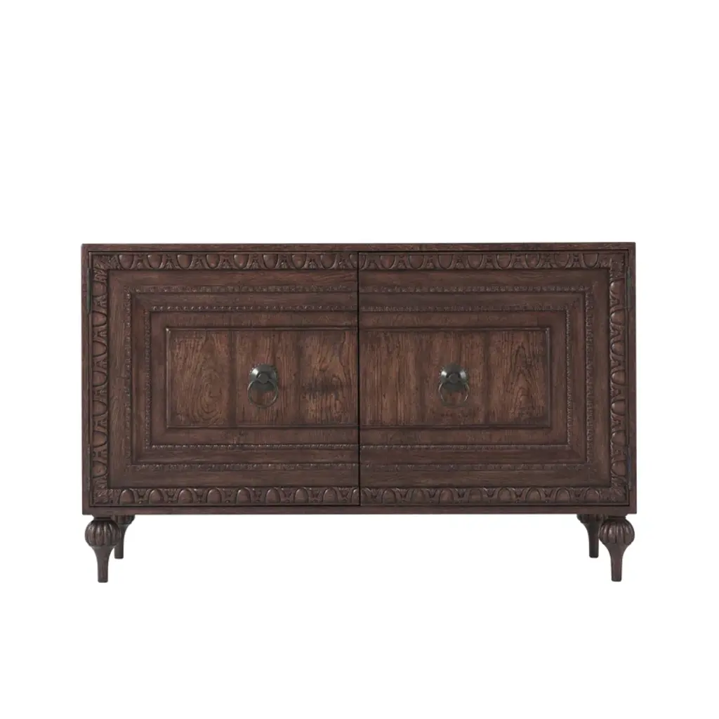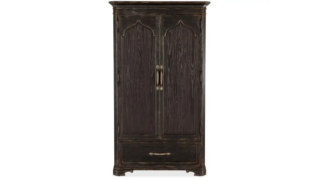A French Empire style custom made cabinet, hand made by Lion Crest Woodworking of Sarasota, FL. The cabinet top has rounded edges with a decorative beaded section in front. A single drawer has the look of two with round mushroom knob handles at the center of two panels. Below, cabinet doors with arched panels open with ornate metal handles. Finished with a beveled base and ogee bracket feet. The hanging tag reads ���Lion Crest Woodworking, Handmade Sarasota, FL�������.