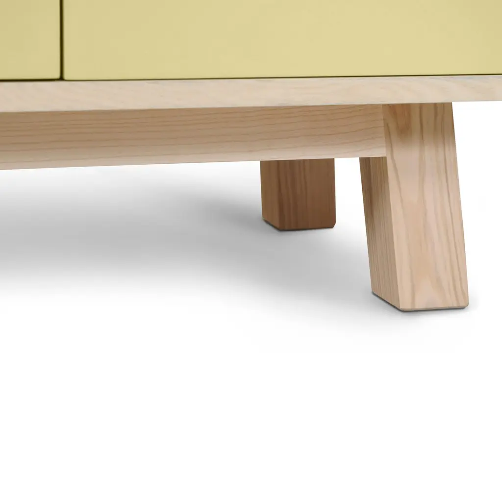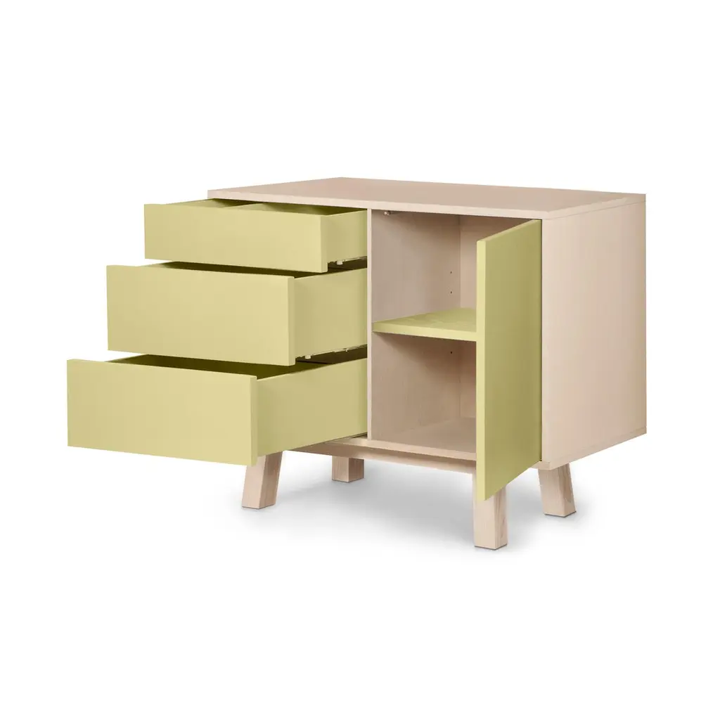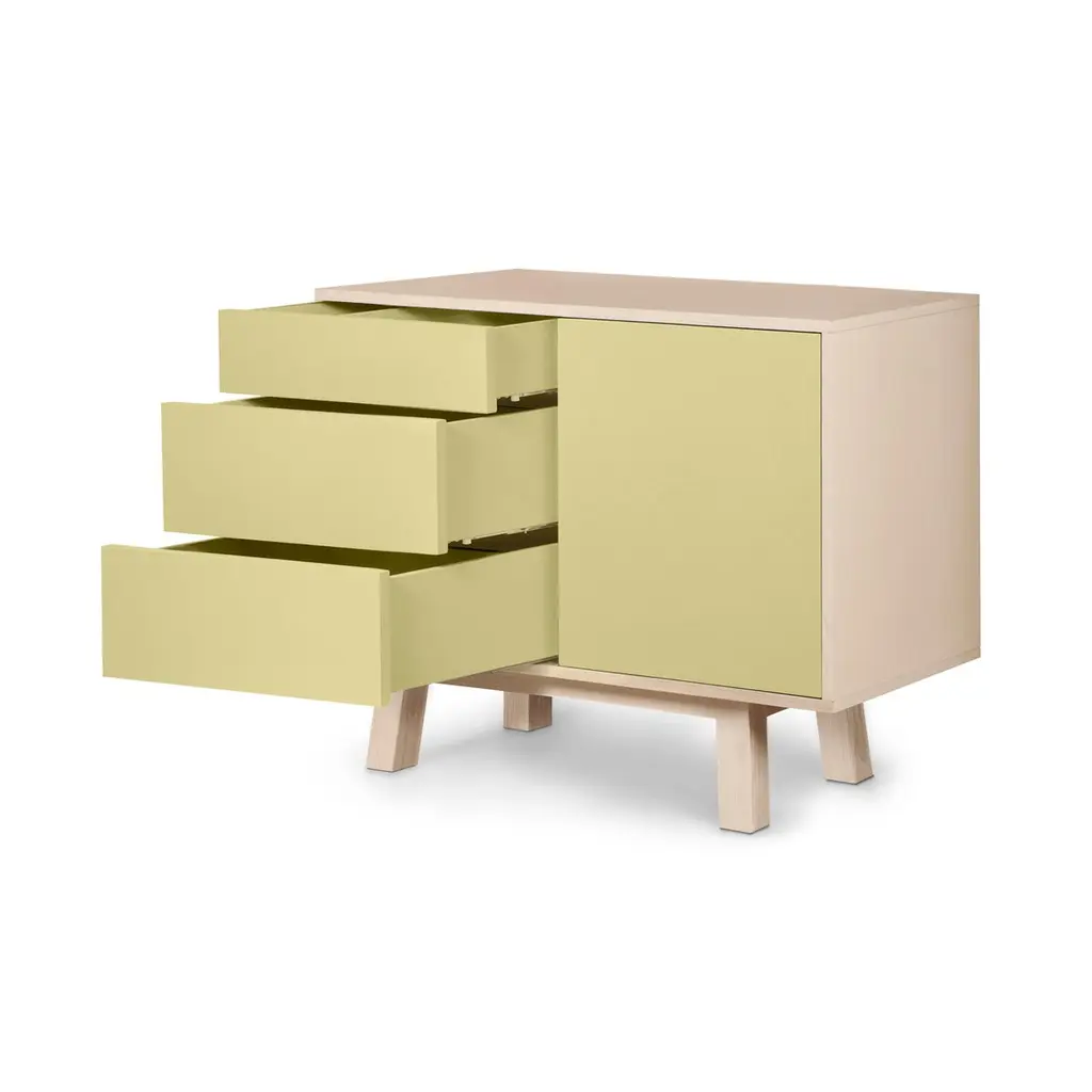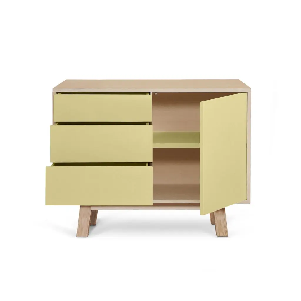 This 1-door and 3-drawer sideboard is designed by Eric Gizard - Paris.It is 100% made in France with solid ash wood, veneer and lacquered doors in MDF panels. Each door and each drawer opens with a "push-to-release" pressure. An adjustable wooden shelf on cleats is placed behind the 2 doors. The shelf's colour is identical to the doors' colour.The first drawer is lower and can store cutlery, napkins, placemats, etc.In this small drawer, 2 movable wooden dividers allow you to create 3 storage spaces as you wish (see the last detail picture). The other 2 drawers are regular drawers without divider.collection ÉGÉEThis sideboard is part of the ÉGÉE collection designed by Eric Gizard in Paris. Eric combines the sleek and refined codes of Scandinavian design with natural materials and muted and "trendy" colorful lacquers.MON PETIT MEUBLE FRANCAISprovides exclusively 100% Made in France Furniture. The manufacture and finishes are of very high-end quality, carried out in French craft workshops, in the west countryside of France: Loire and Bretagne. Solid ash comes from sustainably managed French forests.
