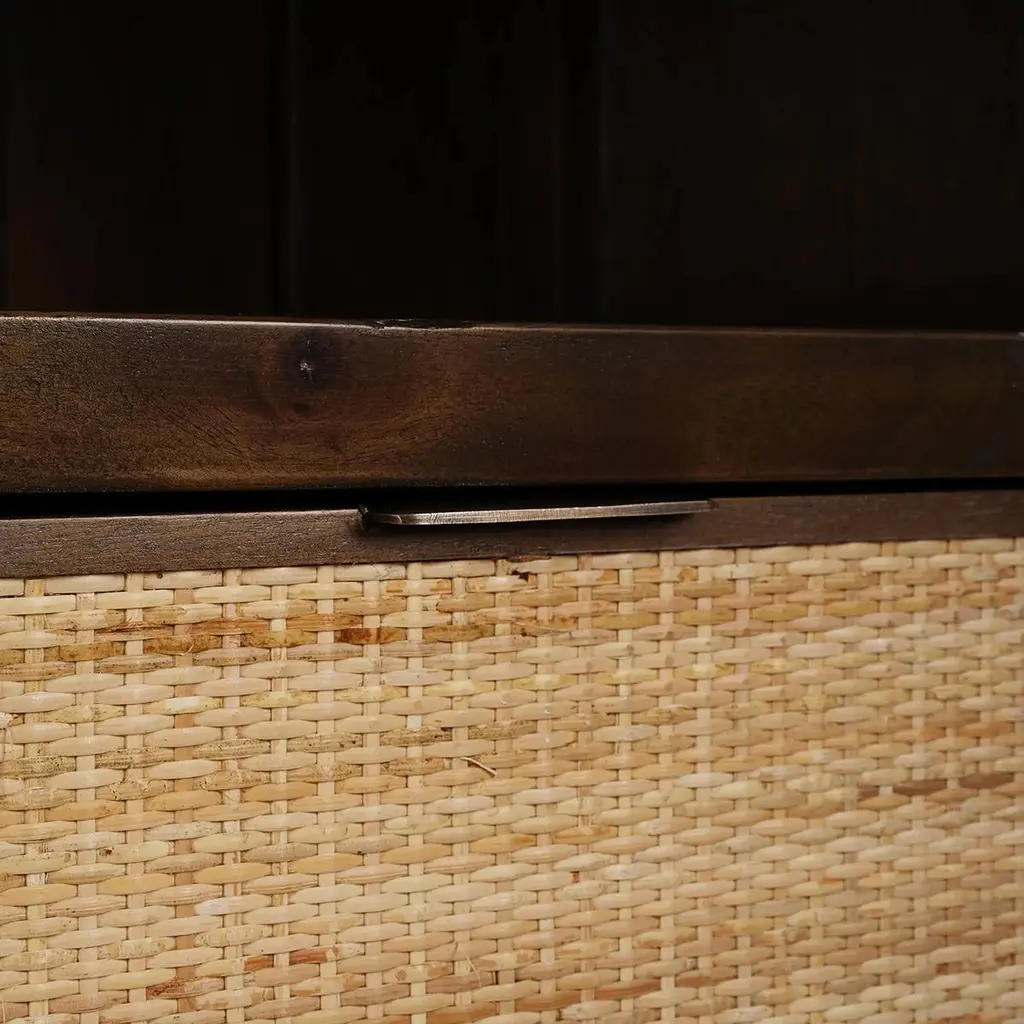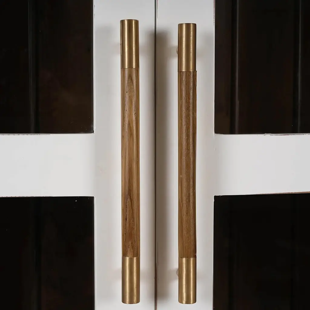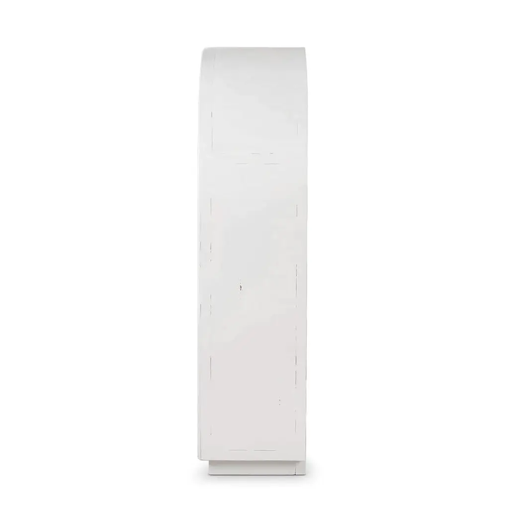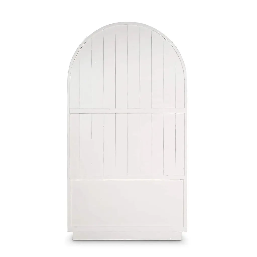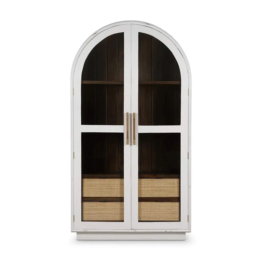 The sleek white harvest exterior, combined with a warm, wood-toned interior, creates a striking contrast that highlights the beauty of your displayed items.The cabinet features large glass panels for showcasing your cherished collectibles, books, or decorative pieces. Additionally, the rattan-wrapped four spacious drawers at the bottom offer convenient storage for other essentials, making this piece as functional as it is stylish.The arched top adds a unique architectural element, while the gold-tone hardware provides a touch of luxury. Ideal for living rooms, dining rooms, or home offices, this versatile piece effortlessly enhances any space.Dimensions: 45" W x 25" D x 83" HCustom finish options are also available. Contact us to learn more.Lead time 20 - 24 weeks.