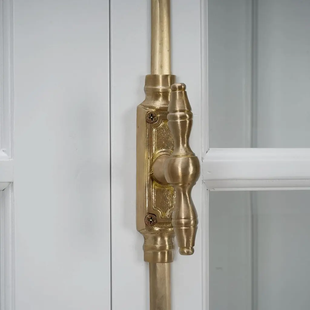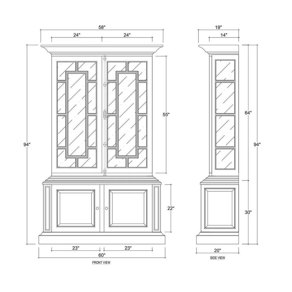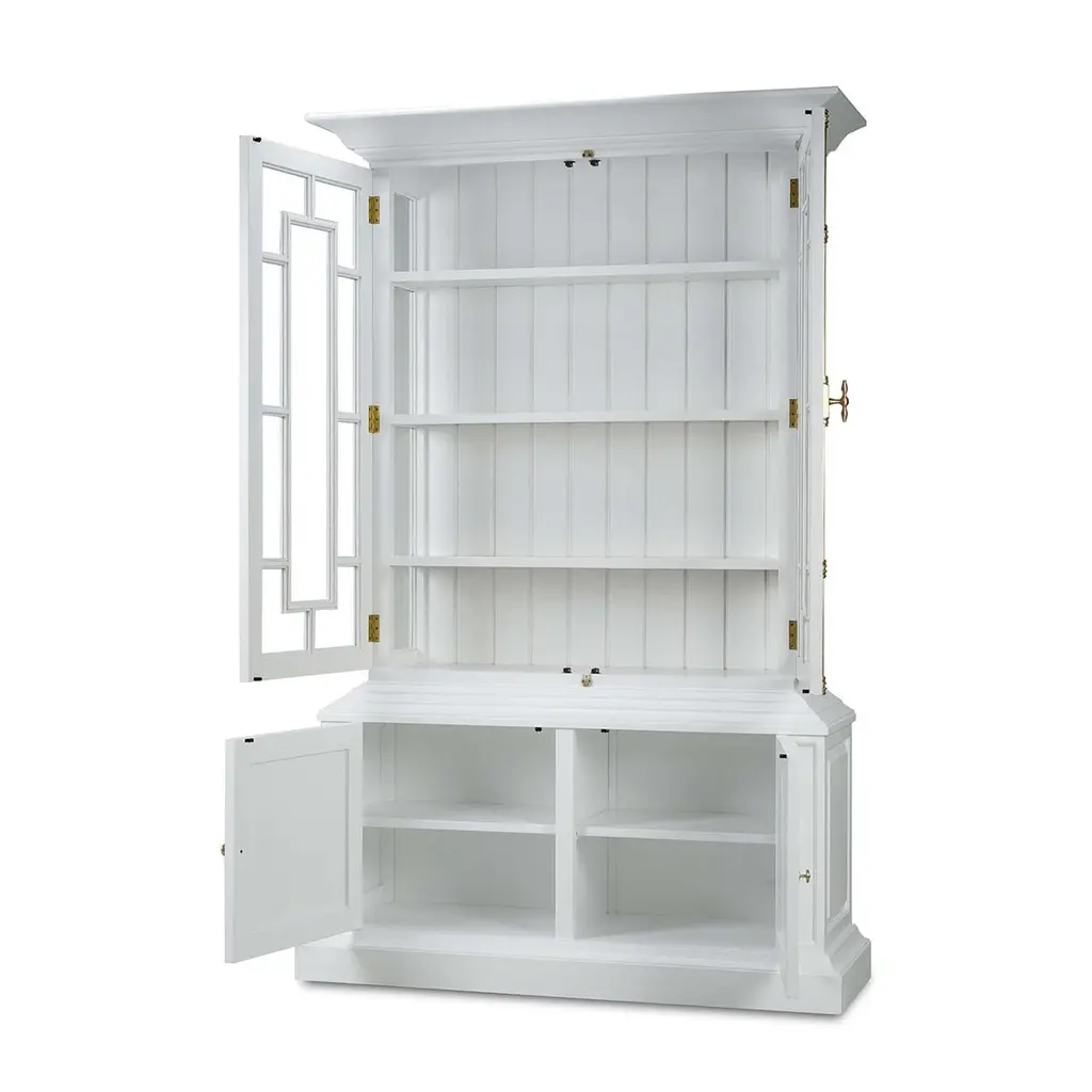 This stunning piece is crafted from high-quality wood, finished in a crisp true white that brightens any room. The upper section features intricately designed glass doors, framed in a geometric pattern, allowing you to showcase your finest collectibles and decor items with style.The spacious interior offers ample storage with multiple shelves. The lower section, enclosed with solid wood doors, provides additional storage space to keep your essentials neatly organized and out of sight. Brass hardware accents add a touch of elegance, enhancing the overall aesthetic of the cabinet.Ideal for your living room, dining area, or hallway, this elegant French White Display Cabinet combines practicality with timeless beauty, making it a versatile addition to any home.Dimensions: 58" W x 19" D x 94" HCustom finish options are also available. Contact us to learn more.