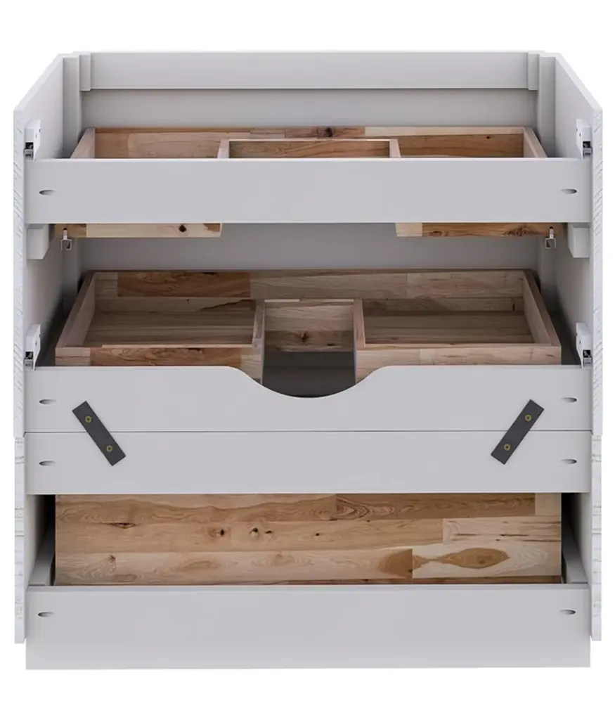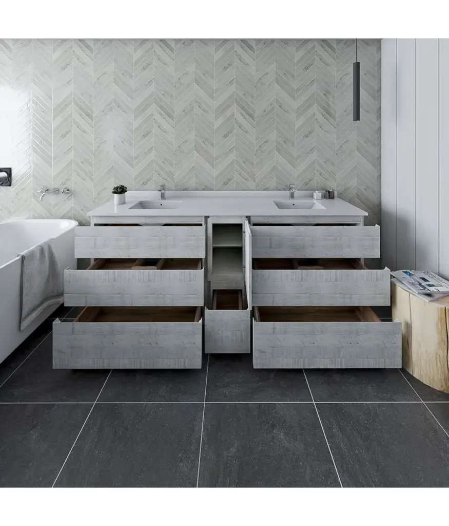The Fresca Formosa Floor Standing Double Sink Modern Bathroom Cabinet is superbly crafted of solid Acacia wood, known for its magnificent beauty and durability. It has a warm grey finish with a hint of brown throughout, and a natural grain that will inject luxurious warmth into any space. A masterpiece of elegance and style, this floor standing cabinet measures 82" in width. With large solid wood, soft-closing dovetail drawers beneath each sink, and a roomy cabinet and drawer at the center of the design, this bathroom cabinet features tons of storage, ideal for keeping a family organized. While all drawers provide plenty of space, the bottom drawers are deeper with full storage capacity. The solid pine drawers are clear coated and feature a mitered, wrap-around design that adds to the superior detailing. Cove routed pulls are carved directly into the drawers and cabinet door, keeping the design sharp and sophisticated. The Fresca Formosa Cabinet is available in multiple sizes and styles. It includes installation hardware.