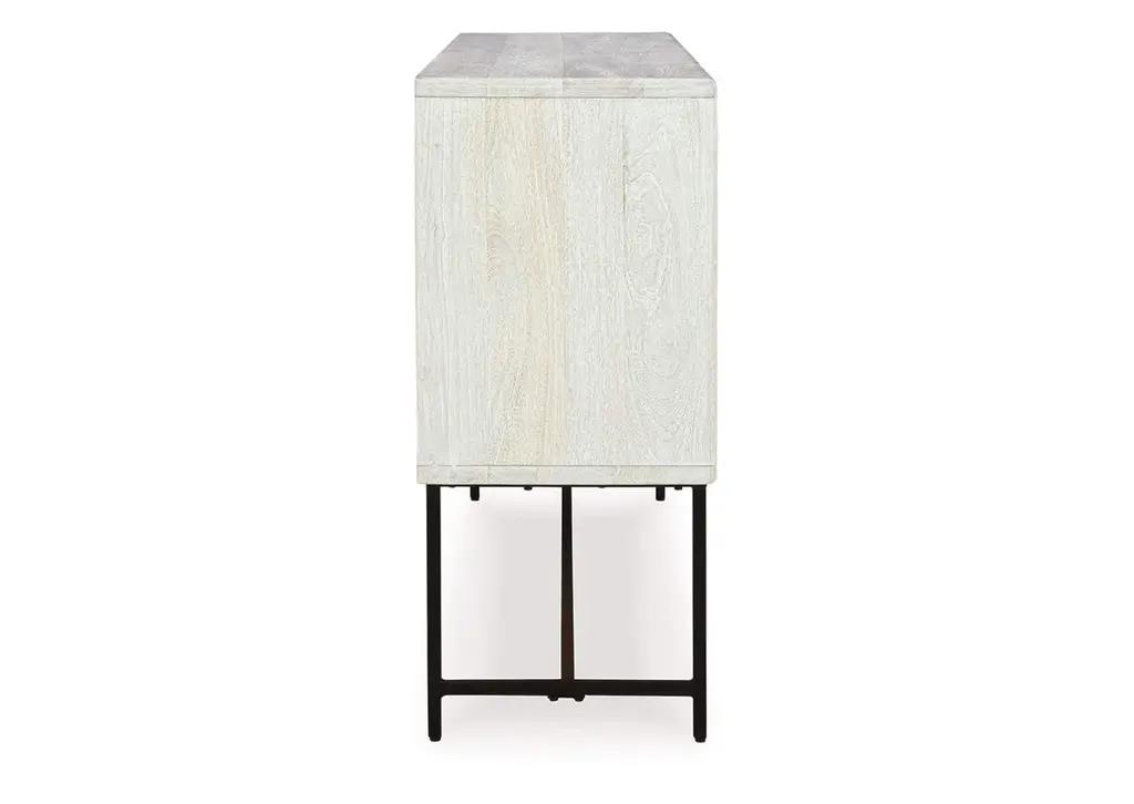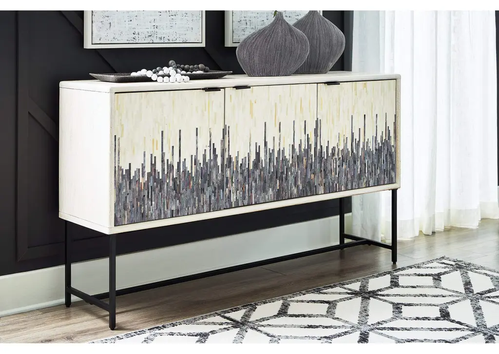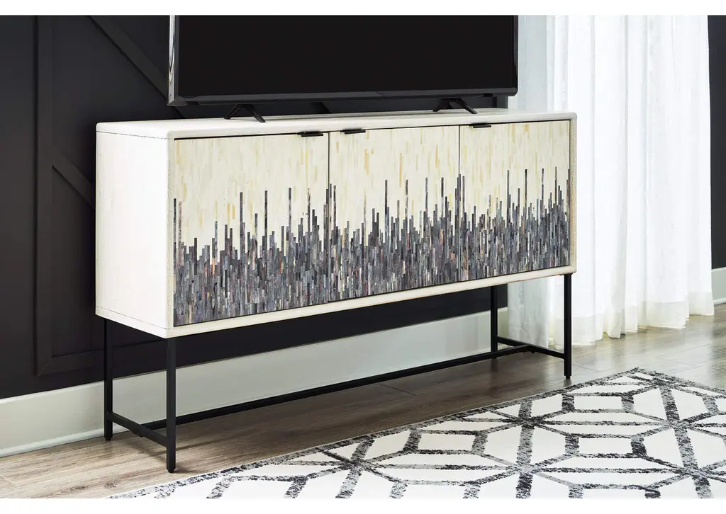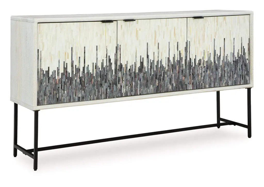 Looking for a showstopping accent for your home? The Freyton accent cabinet combines fashion and function in an exclusive way. It offers a creative take on a traditional cabinet, with a strip pattern in white, gray and black. Inside the doors, two shelves suit all your storage needs. Redefine your modern decor with this one-of-a-kind piece. Weight 149.000 lbs. (67.05kgs.)