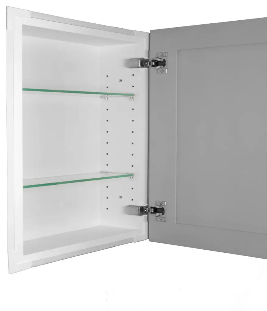 Perfect for any bathroom. Recesses in the wall between the studs, and simply screws to the studs on each side of the opening. Only the door is outside the wall. Fully adjustable glass shelves inside. Our unique, patented design of shelf supports keeps each shelf in place. Concealed hinges with soft close built in assuring the door will never slam shut but softly close on its own instead. The box is SOLID pine and the Shaker style door is SOLID maple. We''ve painted the inside of the box white, so you don''t have to! The box is 3.5" deep inside and gives you plenty of usable depth, but fits in standard 2x4 walls. Cabinet box is 12.5" wide inside. The door is reversible to open either Left or Right. Completely assembled! All you need to do is put one screw in each hinge to mount the door. Then insert it into the wall and screw it to the studs with included screws. If you are replacing a current cabinet, measure your wall opening! White plastic trim surround covers the rough edges of your opening up to 1/2" all around. The door covers the trim surround when closed so the only thing you see outside the wall is the door itself. Made in Sarasota FL. The door comes in three variants: Unfinished Wood - The door can be painted or stained.Primed Gray - Ready for you to paint.White enamel finish.