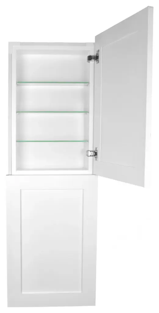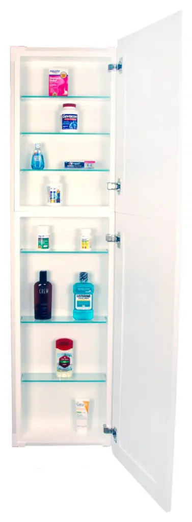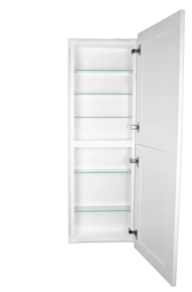 Perfect for any bathroom. Recesses in the wall between the studs, and simply screws to the studs on each side of the opening. Only the doors are outside the wall. Fully adjustable glass shelves inside. Our unique, patented design of shelf supports keeps each shelf in place. Concealed hinges with soft close built in assure the door will never slam shut, but softly close on its own instead. The box is SOLID pine and the Shaker style door is SOLID maple. We''ve painted the inside of the box white, so you don''t have to! The box is 3.5" deep inside and gives you plenty of usable depth, but fits in standard 2x4 walls. This model has TWO doors that open to reveal two separate cabinet sections. Cabinet box is 12.5" wide inside. Doors are reversible to open either Left or Right. Completely assembled! All you need to do is put one screw in each hinge to mount the door. Then insert it into the wall and screw it to the studs with included screws. If you are replacing a current cabinet, measure your wall opening! White plastic trim surround covers the rough edges of your opening up to 1/2" all around. Doors cover the trim surround when closed so the only thing you see outside the wall is the doors. Made in Sarasota, FL. The door comes in three variants: Unfinished Wood - The door can be painted or stained.Primed Gray - Ready for you to paint.White enamel finish.