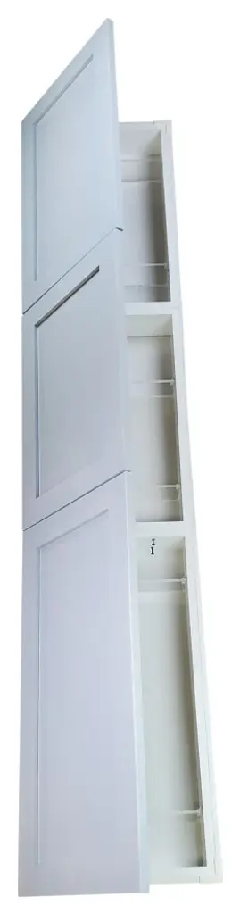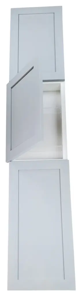 Perfect for any bathroom. Recesses in the wall between the studs, and simply screws to the studs on each side of the opening. Only the doors are outside the wall. Fully adjustable glass shelves inside. Our unique, patented design of shelf supports keeps each shelf in place. Concealed hinges with soft close built in assure the door will never slam shut, but softly close on its own instead. The box is SOLID pine and the Shaker style door is SOLID maple. We''ve painted the inside of the box white, so you don''t have to! The box is 3.5" deep inside and gives you plenty of usable depth, but fits in standard 2x4 walls. This model has THREE doors that open to reveal two separate cabinet sections. the Cabinet box is 12.5" wide inside. Doors are reversible to open either Left or Right. Completely assembled! All you need to do is put one screw in each hinge to mount the door. Then insert it into the wall and screw it to the studs with included screws. If you are replacing a current cabinet, measure your wall opening! White plastic trim surround covers the rough edges of your opening up to 1/2" all around. Doors cover the trim surround when closed so the only thing you see outside the wall is the door itself. Made in Sarasota, FL. The door comes in three variants: Unfinished Wood - The door can be painted or stained.Primed Gray - Ready for you to paint.White enamel finish.