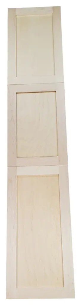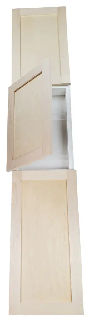 Perfect for any bathroom. Recesses in the wall between the studs, and simply screws to the studs on each side of the opening. Only the doors are outside the wall. Fully adjustable glass shelves inside. Our unique, patented design of shelf supports keeps each shelf in place. Concealed hinges with soft close built in assure the door will never slam shut, but softly close on its own instead. The box is SOLID pine and the Shaker style door is SOLID maple. We''ve painted the inside of the box white, so you don''t have to! The box is 3.5" deep inside and gives you plenty of usable depth, but fits in standard 2x4 walls. This model has THREE doors that open to reveal two separate cabinet sections. the Cabinet box is 12.5" wide inside. Doors are reversible to open either Left or Right. Completely assembled! All you need to do is put one screw in each hinge to mount the door. Then insert it into the wall and screw it to the studs with included screws. If you are replacing a current cabinet, measure your wall opening! White plastic trim surround covers the rough edges of your opening up to 1/2" all around. Doors cover the trim surround when closed so the only thing you see outside the wall is the door itself. Made in Sarasota, FL. The door comes in three variants: Unfinished Wood - The door can be painted or stained.Primed Gray - Ready for you to paint.White enamel finish.