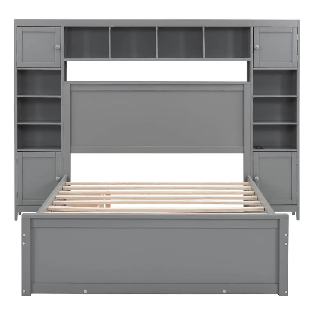 Full Size Wooden Bed With All-in-one Cabinet Shelf And Sockets Twin Size Trundle Gray