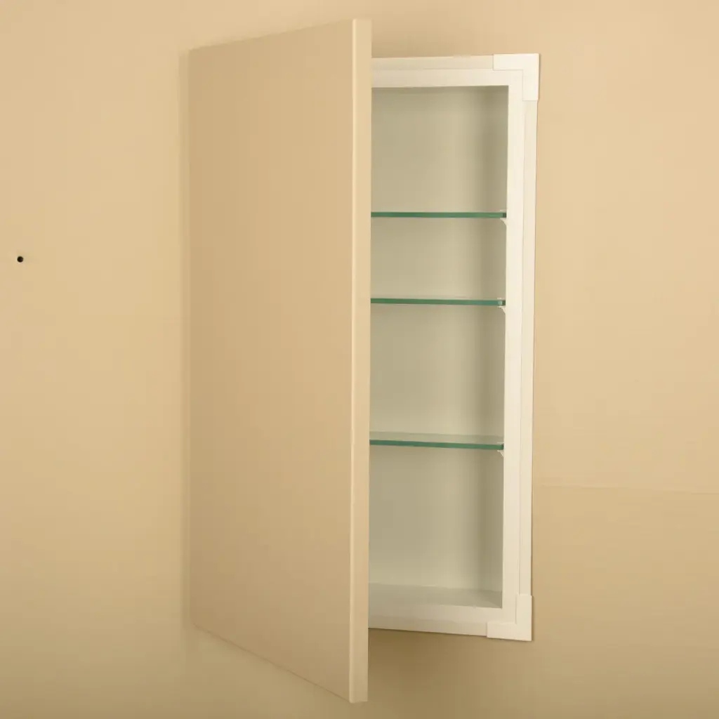 Perfect for any bathroom. Recesses in the wall between the studs, and simply screws to the studs on each side of the opening. Only the door is outside the wall. Fully adjustable glass shelves inside. Our unique, patented design of shelf supports keeps each shelf in place. Concealed hinges with soft close built in assure the door will never slam shut, but softly close on its own instead. The box is SOLID pine and the Slab panel style door is MDF. We''ve painted the inside of the box white, so you don''t have to! The box is 3.5" deep inside and gives you plenty of usable depth, but fits in standard 2x4 walls. Cabinet box is 12.5" wide inside. The door is reversible to open either Left or Right. Completely assembled! All you need to do is put one screw in each hinge to mount the door. Then insert it into the wall and screw it to the studs with included screws. If you are replacing a current cabinet, measure your wall opening! White plastic trim surround covers the rough edges of your opening up to 1/2" all around. Door covers the trim surround when closed so the only thing you see outside the wall is the door itself. White plastic trim surround covers the rough edges of your opening up to 1/2" all around. The door covers the trim surround when closed so the only thing you see outside the wall is the door itself. Made in Sarasota, FL.The door comes in three variants: Unfinished Wood - The door can be painted or stained.Primed Gray - Ready for you to paint.White enamel finish.