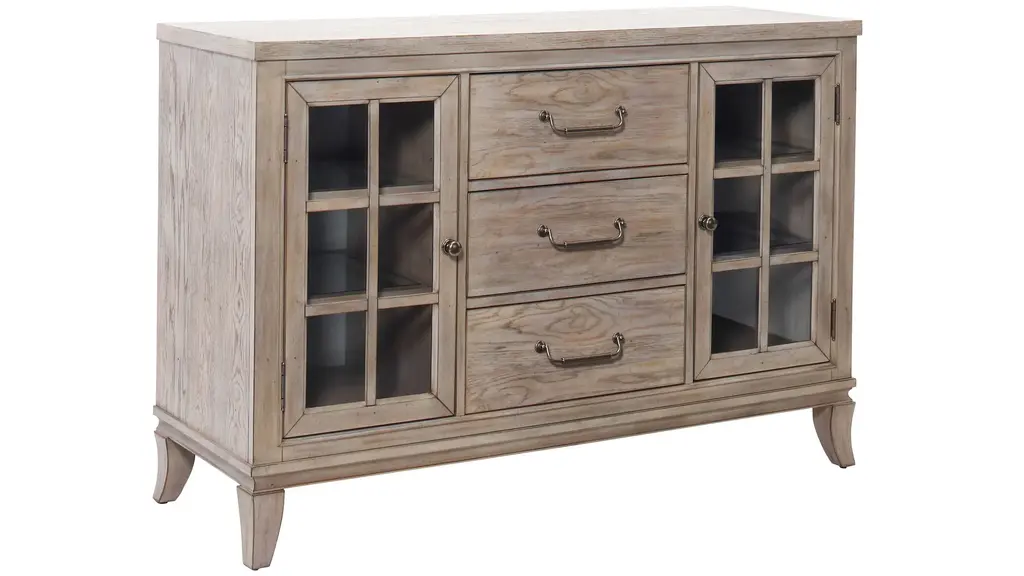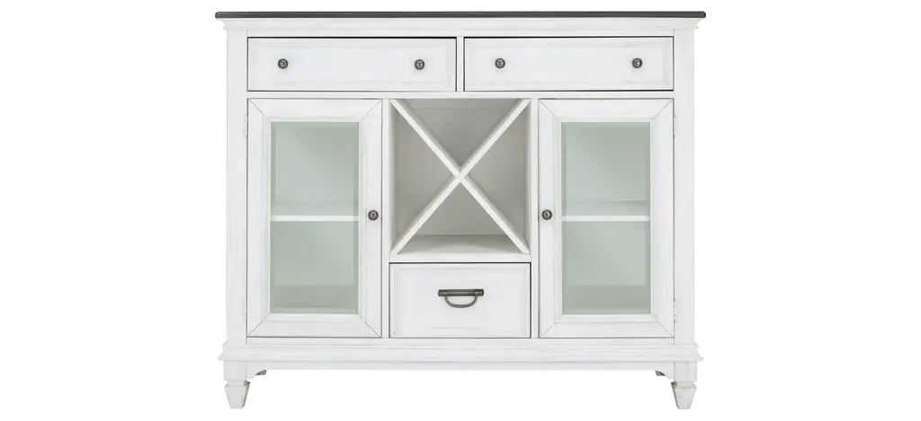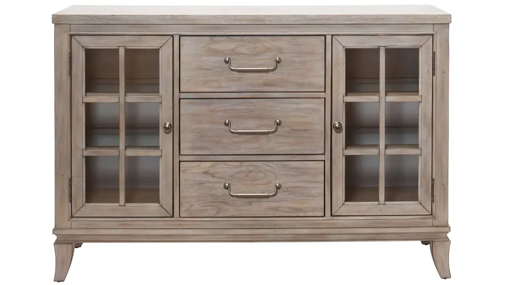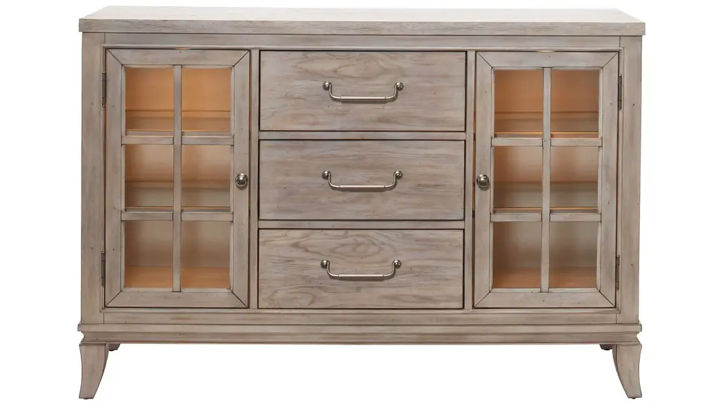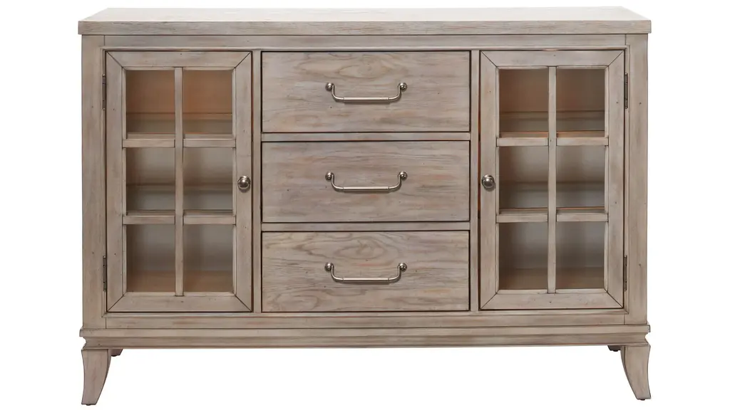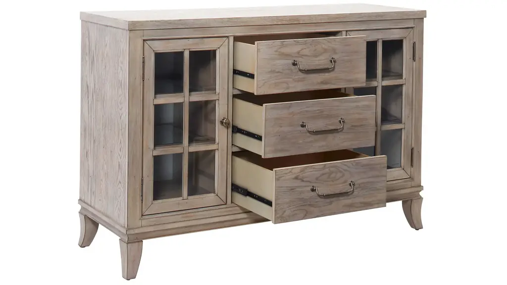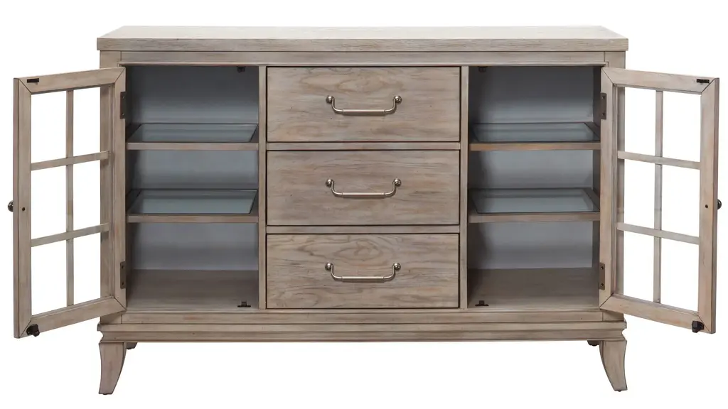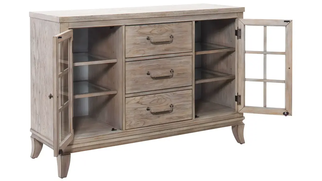 If you are seeking a beautiful and versatile dining room essential with the simplicity and warmth of the farmhouse style along with a sleek and modern sensibility, look no further than the Gabrielle buffet. With impeccable craftsmanship and an antiqued white finish, the spacious buffet features three drawers and two glass fronted storage cabinets with plenty of space for entertaining essentials.